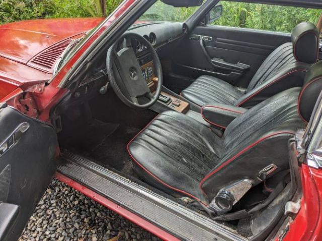 1980 Mercedes Benz 450SL convertible The car was finished from the factory in Brilliant Red (525) and recently received a professional repaint . Features include a color-matched removable hardtop, a black convertible soft top, fog lights, a power antenna, and chrome-accented bumpers and trim. Engine work recently completed includes new injectors, plugs, oil and fuel filters, rebuilt fuel distributor and warm up regulator. Car runs extremely well with a solid suspension and power assisted steering system. Silver-finished 14 Bundt alloy wheels are mounted with 195/70/14 brand new tires. This 1980 Mercedes-Benz 450SL is powered by a 4.5-liter V8 paired with a three-speed automatic transmission and is finished in red over black leather. Features include a limited-slip differential, a black soft top, a body-color removable hardtop, 14 Bundt alloy wheels. The car was factory-equipped with power steering and power-assisted four-wheel disc brakes. The four-spoke steering wheel frames VDO instrumentation including a tachometer with a 5,800-rpm redline and an inset analog clock as well as a 160-mph speedometer, and gauges for coolant temperature, oil pressure, and fuel level. The six-digit odometer shows 72k original miles. The front left fender was damaged and resulted in a salvage title when it was in a tow yard. Fender has been replaced and entire vehicle repainted. A new AM/FM Kenwood stereo has bluetooth capability as well as large speakers in the rear. condition: salvage cylinders: 8 cylinders drive: rwd fuel: gas odometer: 72154 paint color: red title status: salvage transmission: automatic type: convertible Please Note The Following **Vehicle Location is at our clients home and Not In Cadillac, Michigan. **We do have a showroom with about 25 cars that is by appointment only **Please Call First and talk to one of our reps at 231-468-2809 EXT 1 ** FREE Consignment Visit Our Site Today Easy To List Your Vehicle and Get it Sold in Record Time.