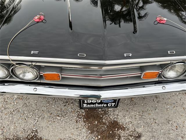 1969 Ford Ranchero GT 351 Windsor, Show-Quality Custom, Highly Detailed Build This 1969 Ford Ranchero GT is a striking, black-and-red custom build that beautifully blends performance, craftsmanship, and presentation. Finished in black with red pinstriping, this Ranchero features a 351 Windsor small-block V8 and automatic transmission, along with extensive cosmetic and mechanical upgrades throughout. Highlights: 351 Windsor small-block V8 Automatic transmission (column shift) Black exterior with red pinstriping (upper and lower body) American Racing chrome/black wheels with BFGoodrich tires New dual exhaust system with Flowmaster mufflers tailpipes exit behind rear tires New black vinyl top Chrome side rails and flat black tonneau cover Red hood pins and new 351 emblems on the hood Dark tinted glass, including windshield sun strip New chrome mirrors, headlights, and polished bumpers (re-chromed) Air shocks (rear) and new Monroe shocks (front) New front brake calipers and rear brake shoes New windshield washer pump, reservoir, and chrome wipers Engine Bay & Performance Upgrades: New 2-barrel carburetor with polished aluminum oval air cleaner Polished aluminum radiator, overflow canister, and electric cooling fan New 200-amp alternator and starter Polished aluminum pulleys, power steering housing, and brake booster New master cylinder (polished aluminum) MSD ignition components: red cap and rotor, new red coil, blue spark plug wires New top and bottom radiator hoses Recent full tune-up Interior Details: Black interior with red accents seats feature red stripes Four red locking seatbelts Custom center armrest with cupholders and glovebox Retro AM/FM Bluetooth radio Light walnut steering wheel with chrome spokes QuickCar auxiliary gauges: oil pressure, tachometer, water temp 6-inch billet chrome rearview mirror New chrome window cranks Fire extinguisher mounted on transmission tunnel Carpeted rear panel with storage and spare tire