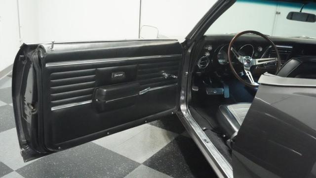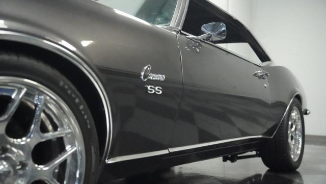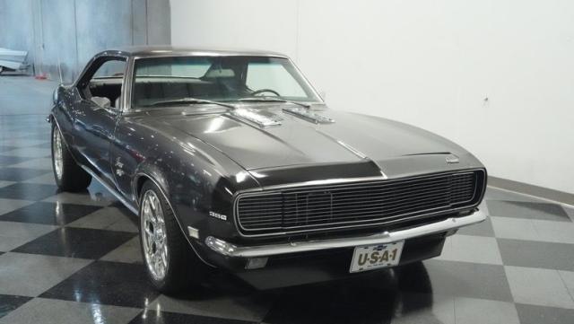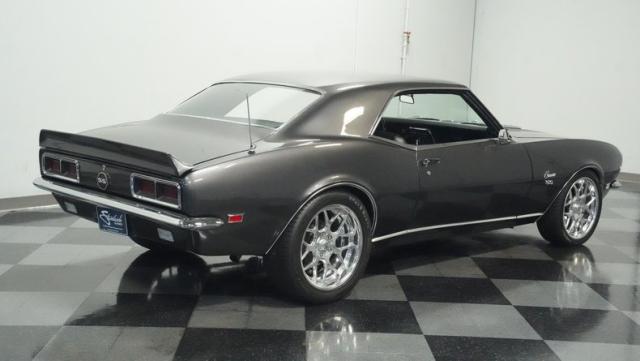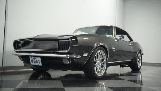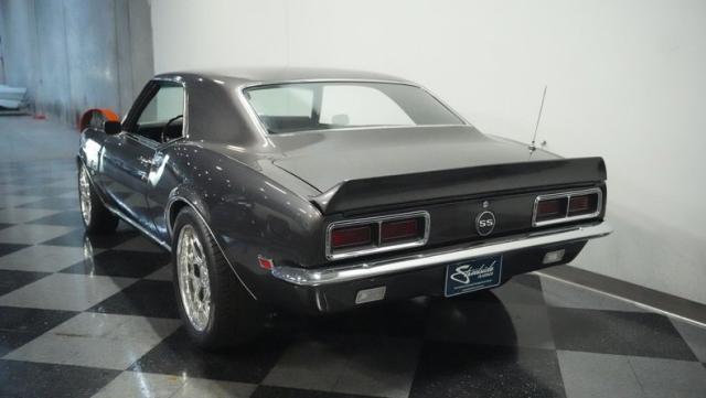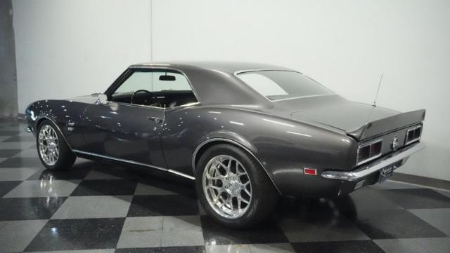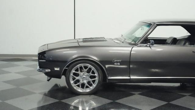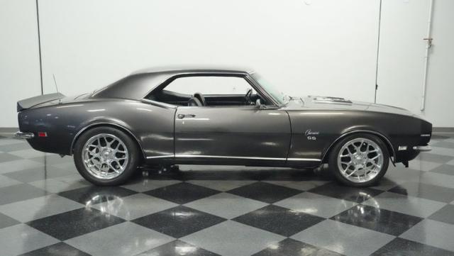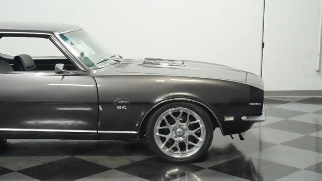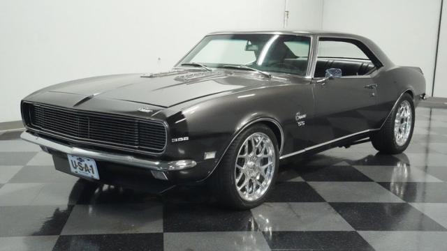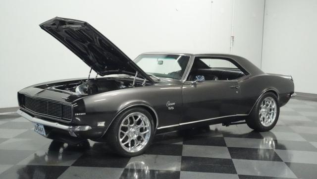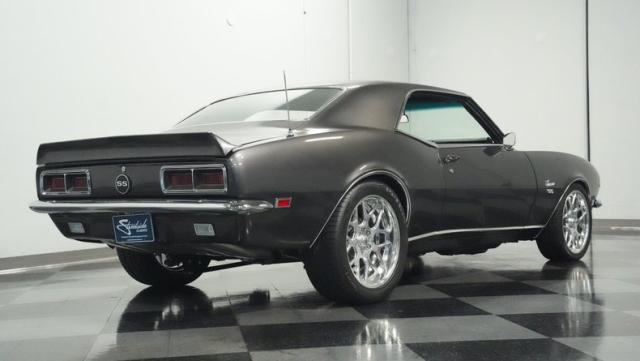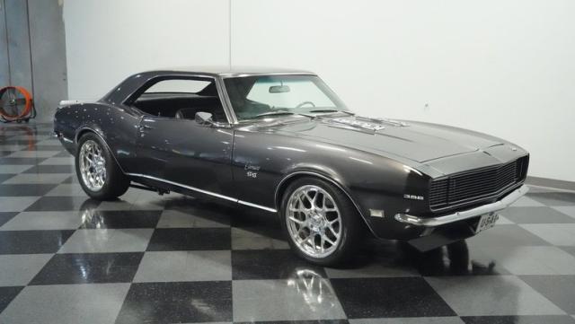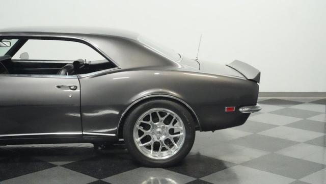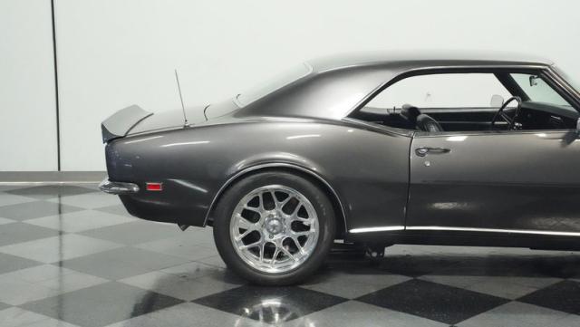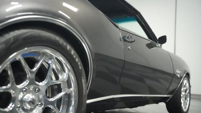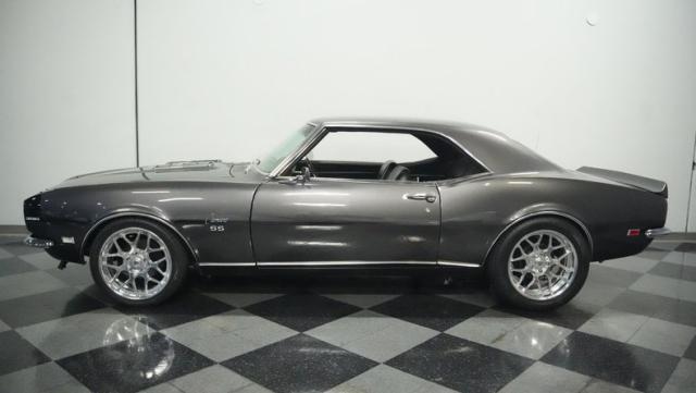 Street-built and track-ready, this 1968 Chevrolet Camaro RS/SS Restomod Tribute flexes hard with its menacing Gunmetal Gray Metallic paint and black racing stripes. The RS hidden headlight setup adds stealth, while the Super Sport hood signals pure muscle car aggression. Those 18-inch Billet Specialties wheels fill the fenders perfectly, running 225/40ZR18 rubber up front and meaty 255/45ZR18s out back for maximum grip. Billet hood hinges add show-quality flair, while dual exhaust tips announce this street fighter\'s intentions long before the traffic light turns green.
