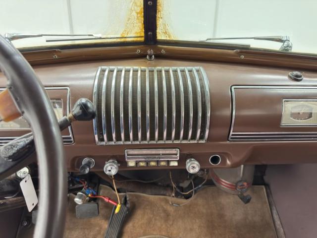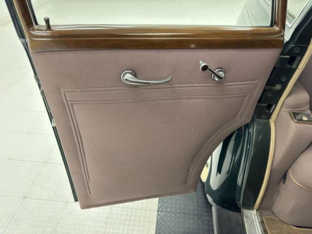 More luxury for the eyes and of course more tears for this beautifully appointed and restored interior.Slipping past fuzzy padded broadcloth covered mauve taupe door panels, we see shiny cranks and handles with bakelite knobs.The window surrounds are in brown and sport some faux painted wood grained metal.The dash is a work of art unto itself utilizing a brown painted metal dash top and some machined spun gold pattern panels for the instruments. A wonderfully aged brown leather wrapped steering wheel with banjo styled shiny ribs and a chromed horn ring fronts the dash.The rectangle and half round instruments are on the machined panel behind the steering wheel. A rectangular clock is inset into the glove box machined panel.Dash central holds the bakelite buttons for the factory AM radio and above is a chrome waterfall speaker grille. In front and rear are two beautifully covered large overstuffed benches bathed in ribbed mauve taupe broadcloth with ivory piping with matchy matchy upholstered \"tubs\" on their sides and backs.The amenities continue on the arms of the rear bench with an inset armrest with lighter and ashtray for either side.The pillar panels and headliner are near perfect broadcloth in more mauve taupe and are shown as tight panels.Tan carpeting, very clean, shows throughout on the floors and above is a lighter tan headliner.To the ball Jeeves...