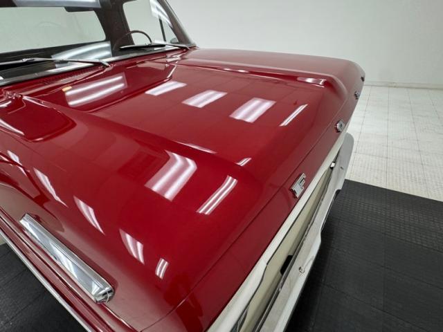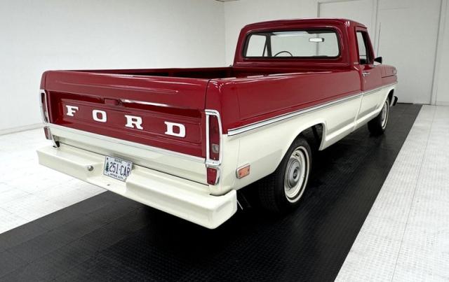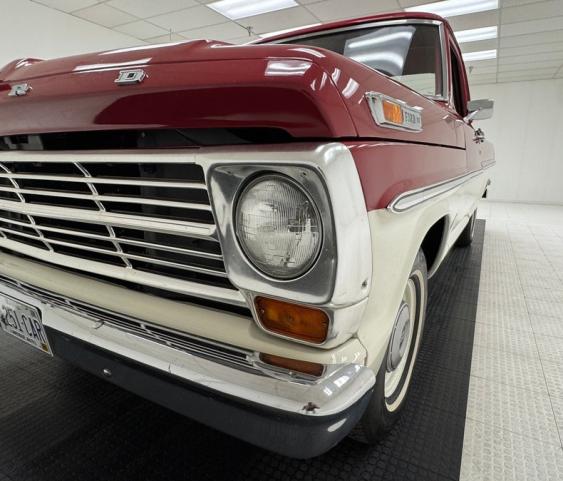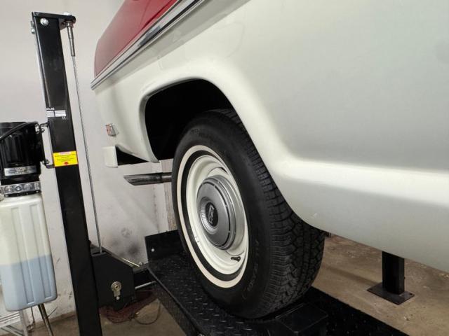 Not all that different from the spec used in the sales brochure in 1969, this Candy Apple Red over Wimbledon White is a stunner, demonstrating the common two tone and often three level stacking of contrasting colors on pickup trucks, here delineated by polished molding. This two stage paint shines bright and 15-inch white painted steel wheels with hubcaps keep things original looking while the rear bumper is also white under the bright white paint of the stamped FORD name on the tailgate. The handsome face of this truck is dressed in polished metal, from the straight chrome bumper to the grille and headlight bezels that integrate amber turn signals just below. A solid rear window overlooks a clean painted bed. Overall, trim and paint is excellent. Imperfections include chips and scuffs on the hood, discoloration on a quarter panel, and thin scratches on the chrome bumper.