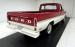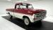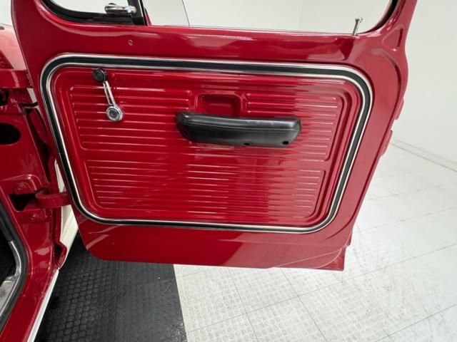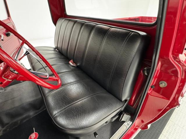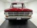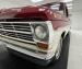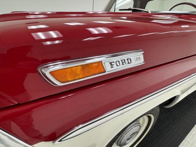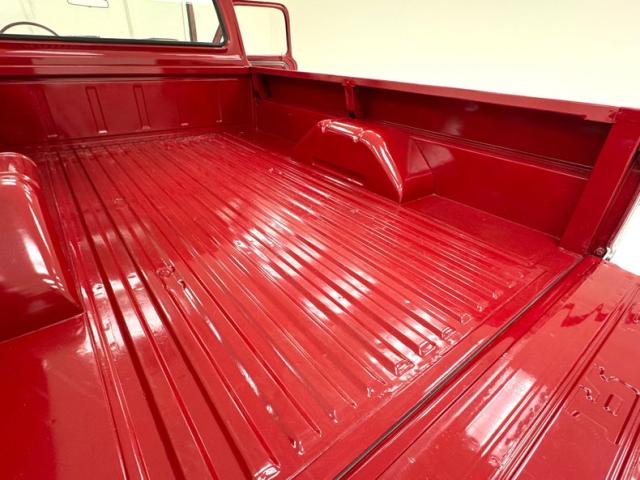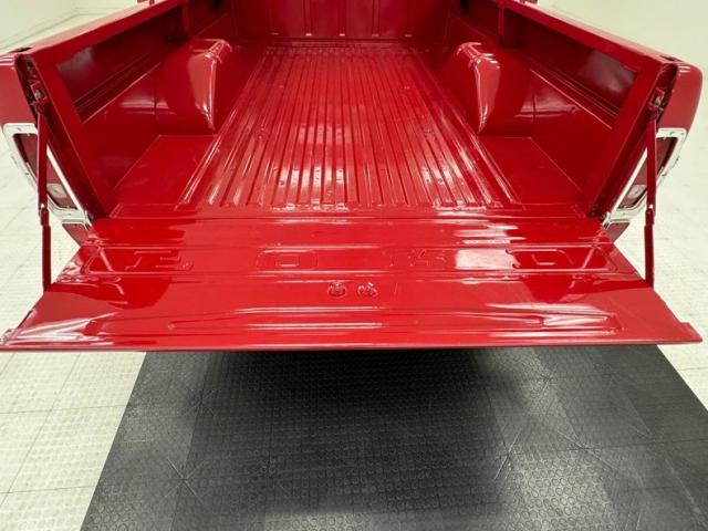 The glossy red door card is surrounded by a corral of black trim, and outside of that is more red and both doors present cleanly. A black grain vinyl bench with black piping looks new, complemented by red seatbelts. The red steering wheel gleams along with its silver horn ring and fronts a horizontal instrument cluster in a black and silver oval design, all under black dash pad contrasting with the shiny red dash that almost appears wet and houses an AM radio. Rubber matting covers the floor along with F100 branded carpeted mats and a black vinyl headliner is up above and like the exterior, the interior is show worthy.