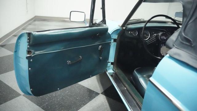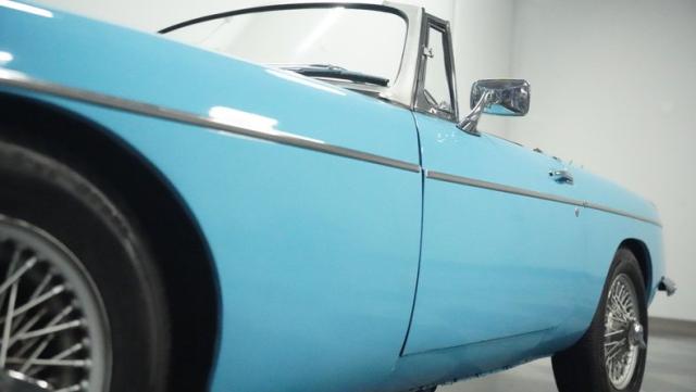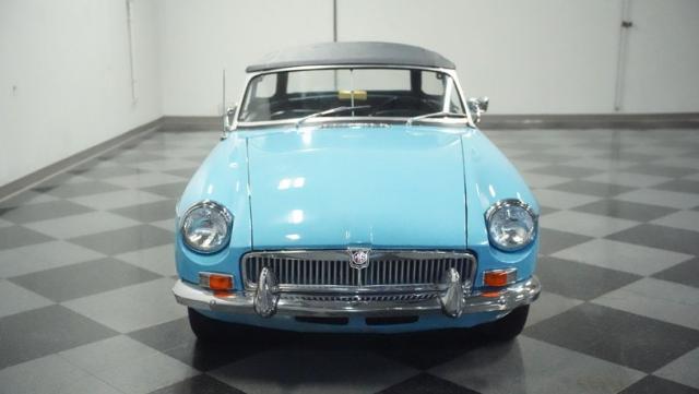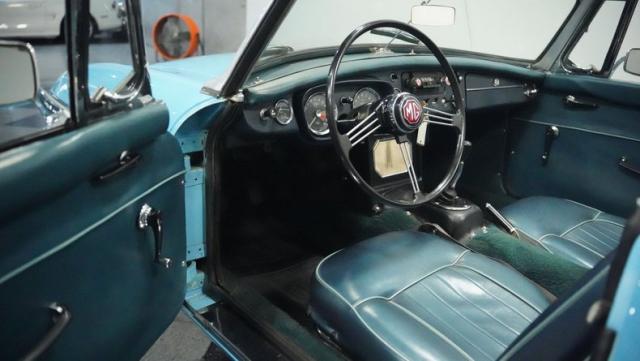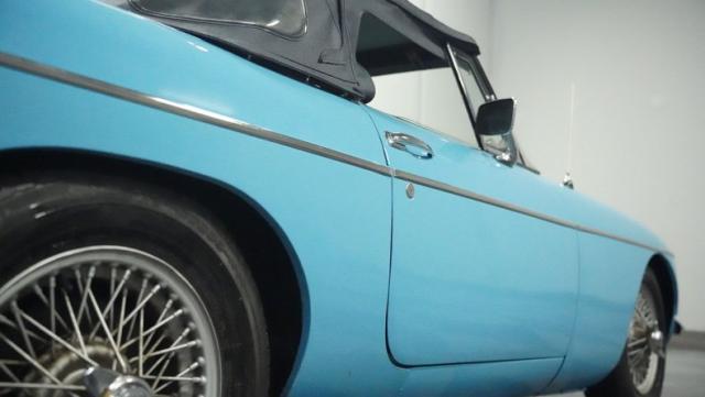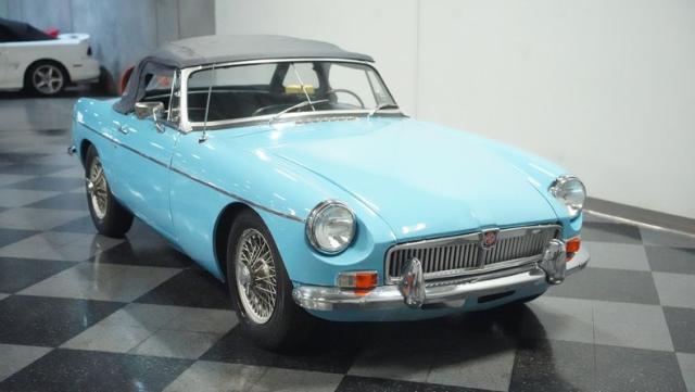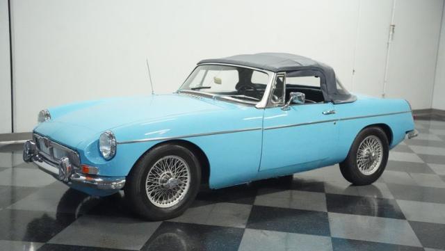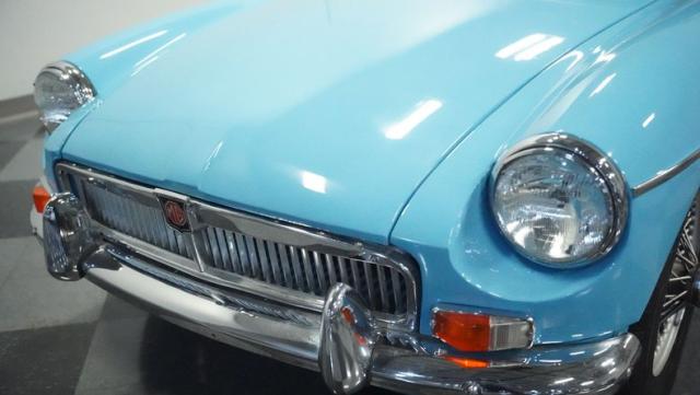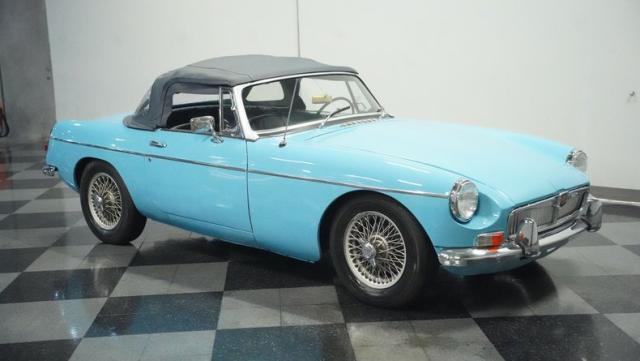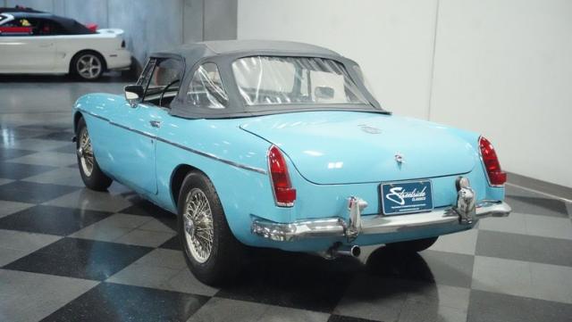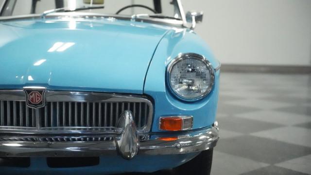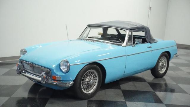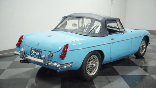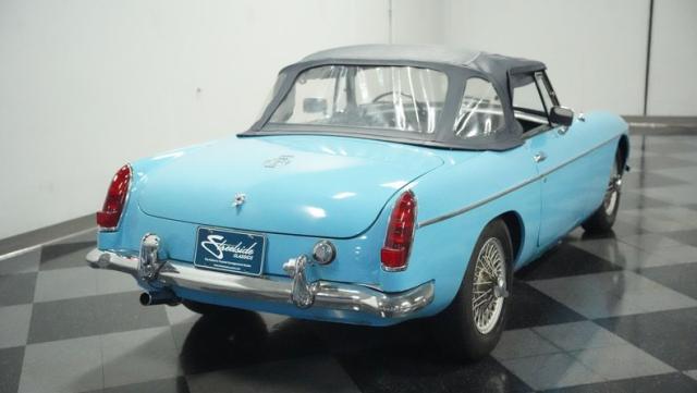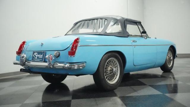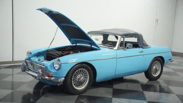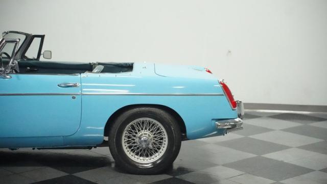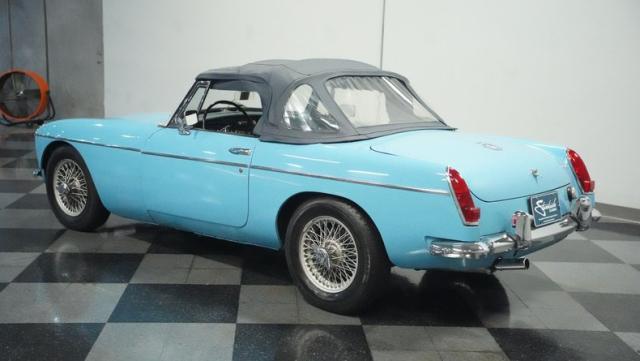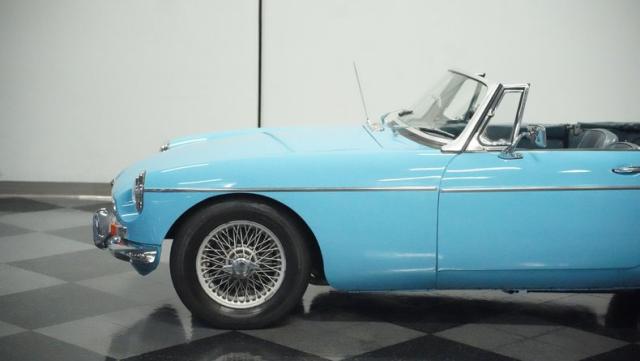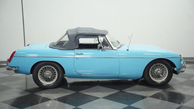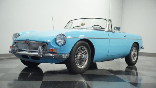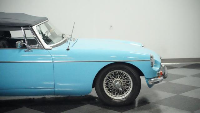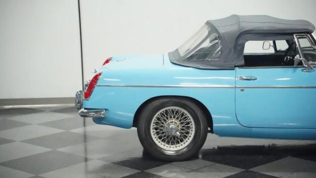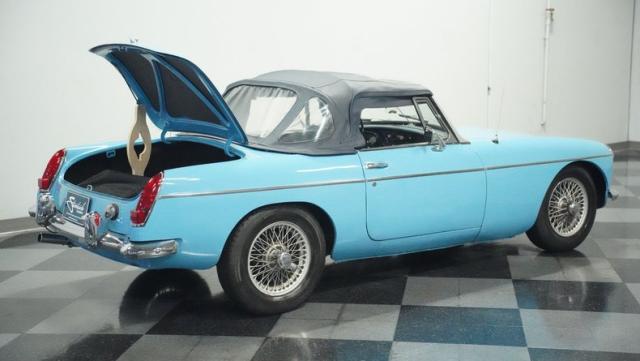 Racing through time from Britain\'s golden age of motorsport, this 1965 MGB showcases a sophisticated triple-blue configuration - a rare specification that brings royal elegance to its competition-bred lineage. The Iris Blue finish evokes memories of legendary British racing machines, while genuine 14-inch chrome wire wheels with authentic knockoffs demonstrate proper Abingdon craftsmanship. The coordinated blue canvas top creates an aristocratic profile, and period-correct 165R14 tires maintain this roadster\'s competition-inspired stance.