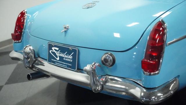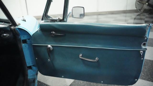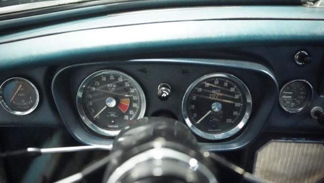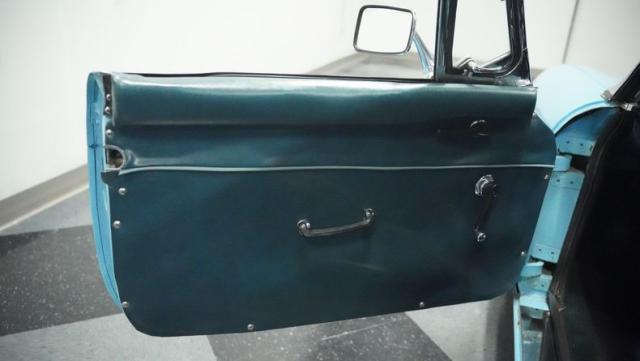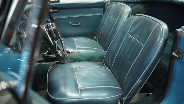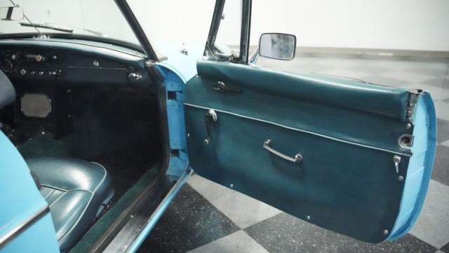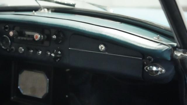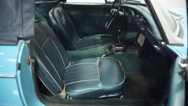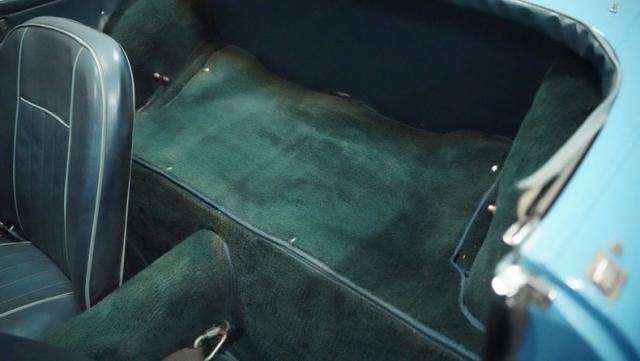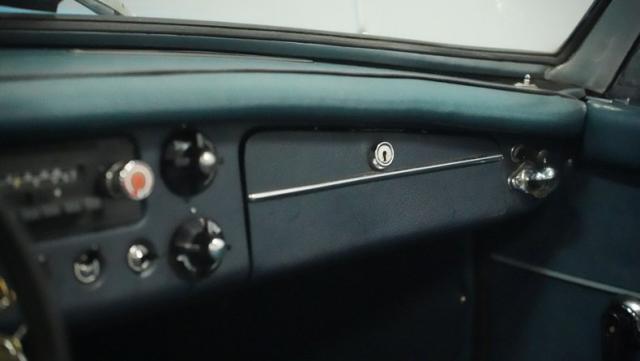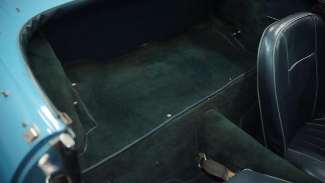The cockpit presents a pure British sports car environment in matching blue vinyl, reminiscent of the famous racing workshops of England. Competition-style bucket seats position you behind a classic wood-rimmed steering wheel - a proper setup for spirited drives through winding country roads. The console-mounted shifter sits exactly where any proper British sports car should have it, while the AM/FM radio adds a soundtrack to your motoring adventures. The gauges display their information with classic British clarity.
