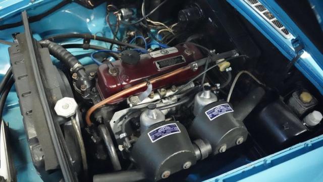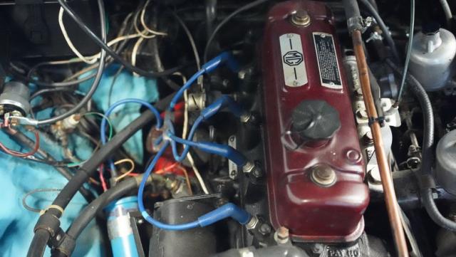 The 1798cc four-cylinder powerplant represents the evolution of MG\'s racing expertise. Dual single-barrel carburetors deliver the fuel mixture with British precision through the 4-speed manual gearbox. Front disc brakes - a significant feature for 1965 - provide proper stopping ability. The coil spring front suspension with shocks and rear leaf spring configuration delivers the handling characteristics that made these cars favorites at tracks like Silverstone and Brands Hatch. The single exhaust produces that unmistakable British sports car symphony.