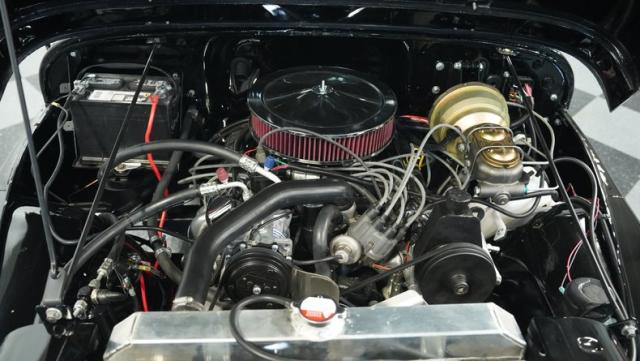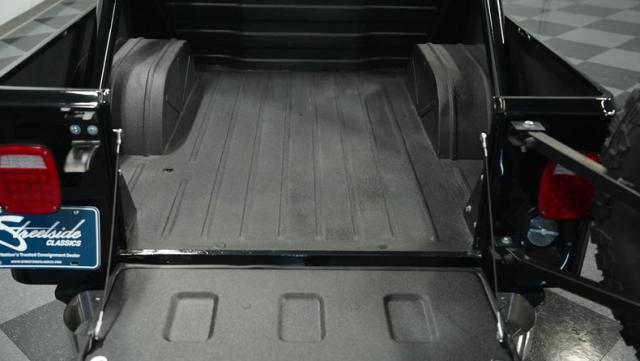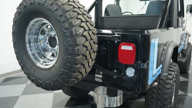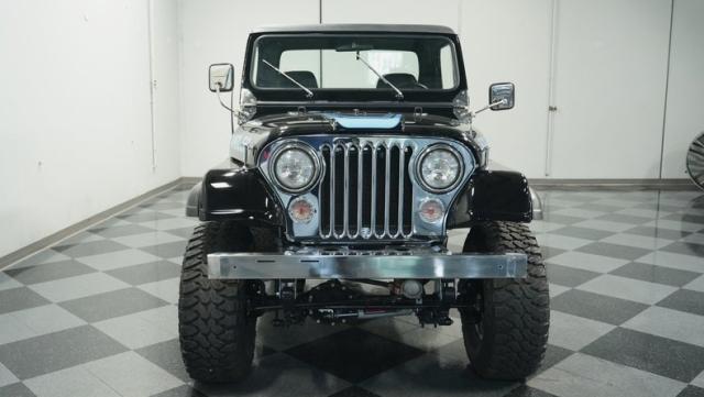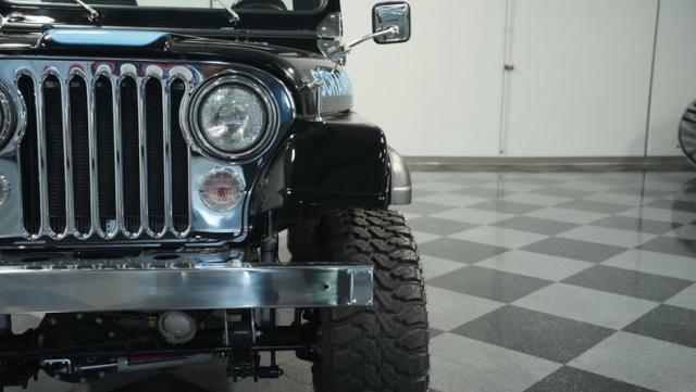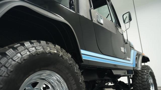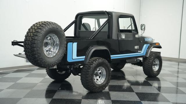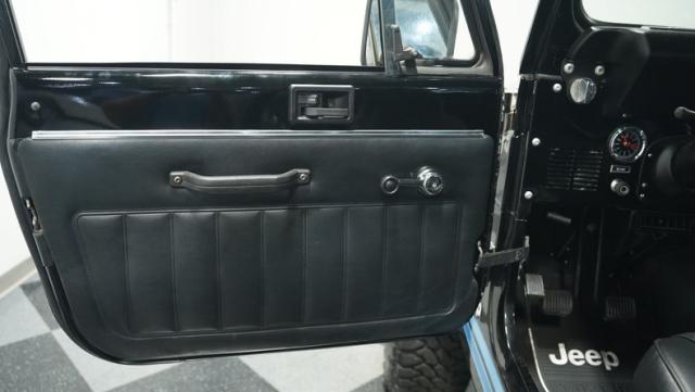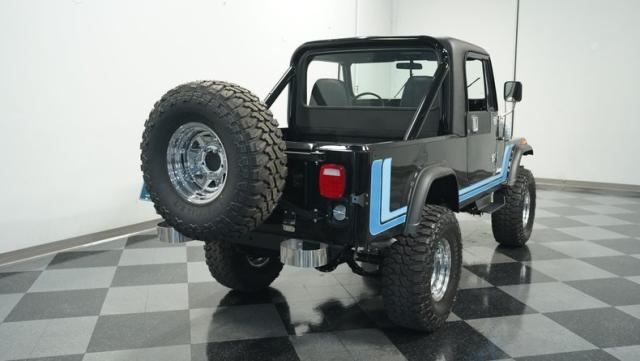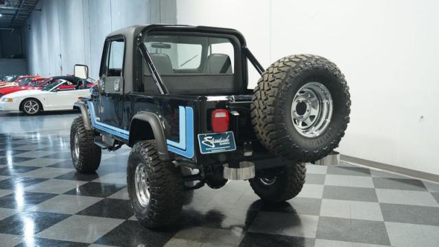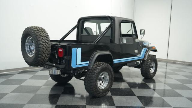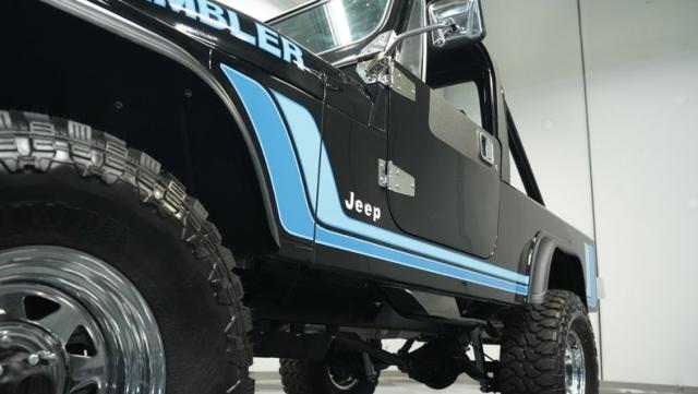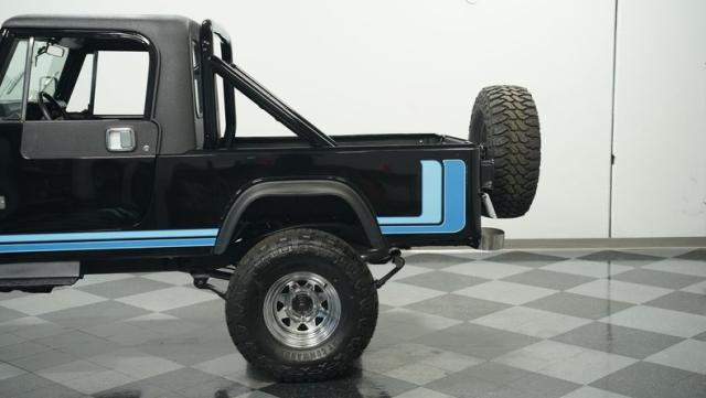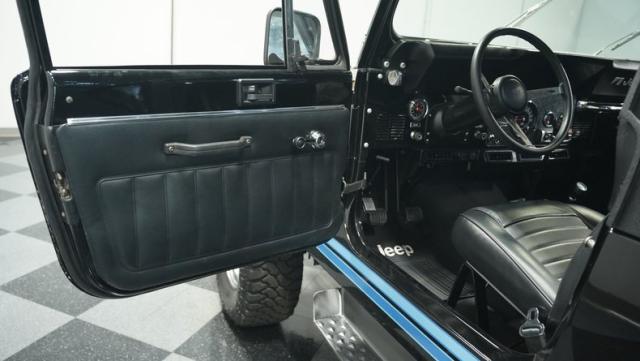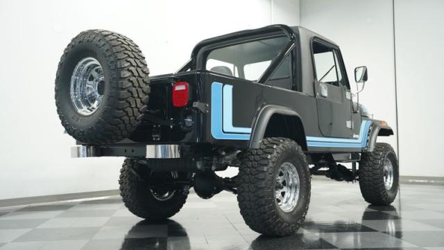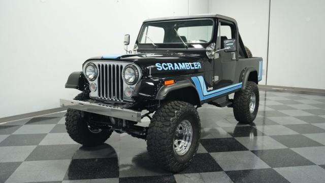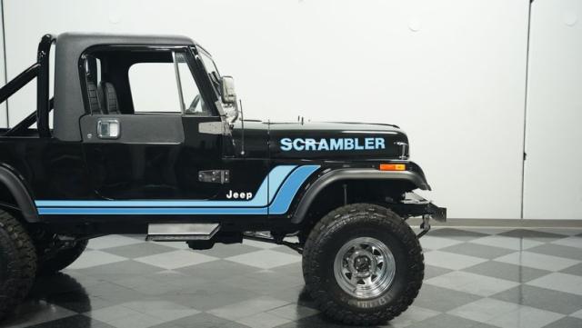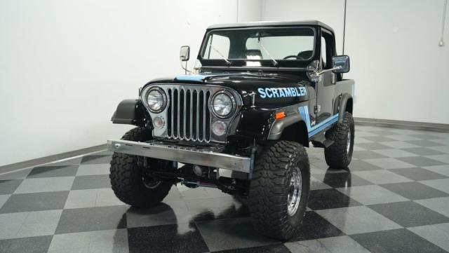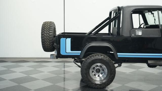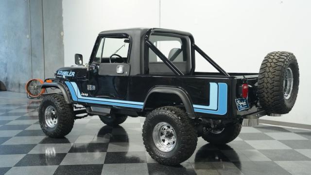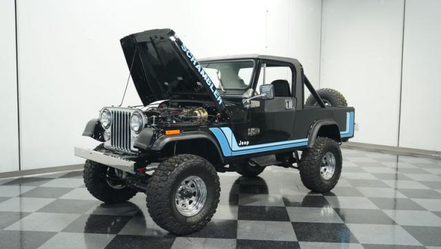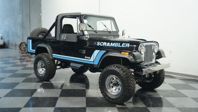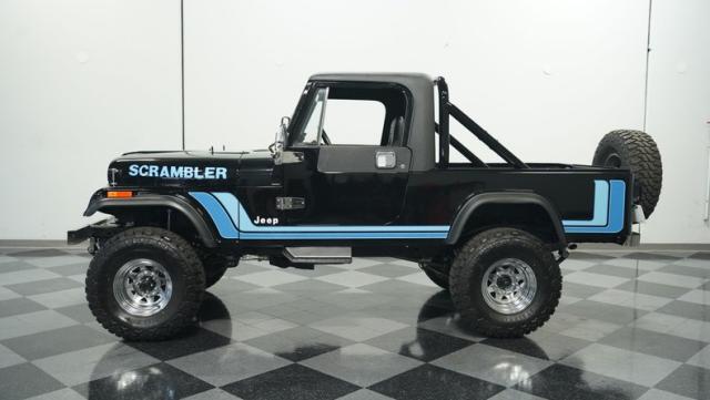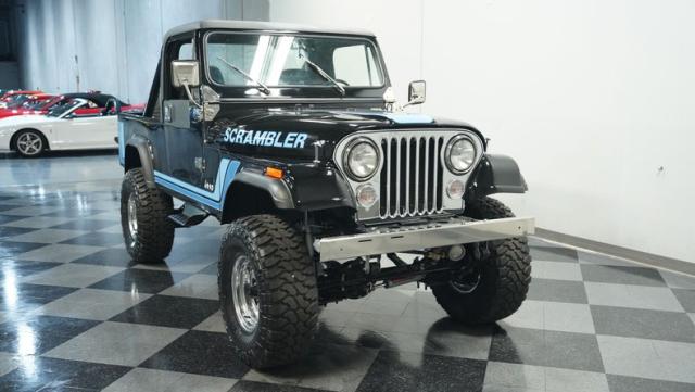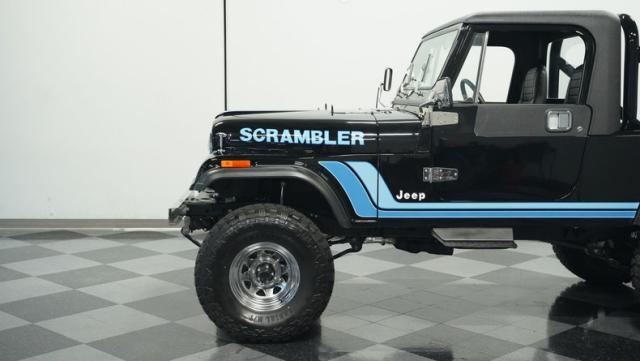 This 1982 Jeep CJ8 Scrambler rolled out of a professional restoration in October 2024. Its black finish, applied in August 2024, creates a bold presence on and off the road. Blue Phoenix Graphics decals provide a striking contrast against the dark backdrop. A 4-inch Rough Country suspension lift combines with 33x12.50R15 tires mounted on 15x8 wheels, giving this Scrambler an imposing profile. Practical upgrades include side steps for easy access and a durable bed liner in the cargo area, enhancing this Jeep\'s versatility for work or play.