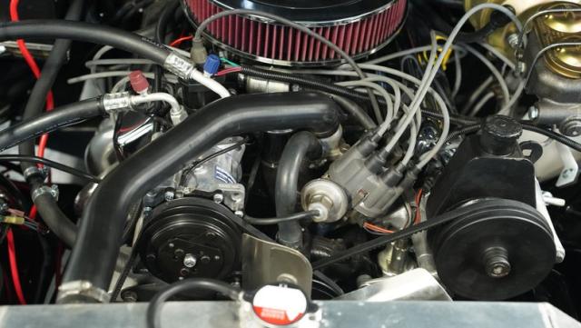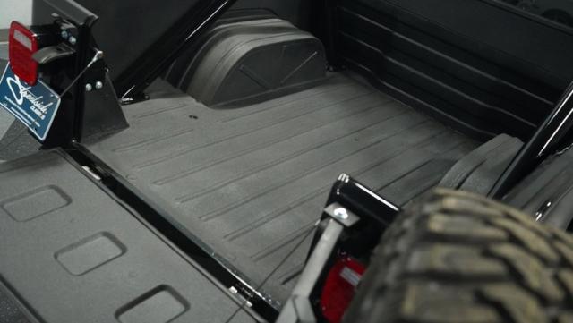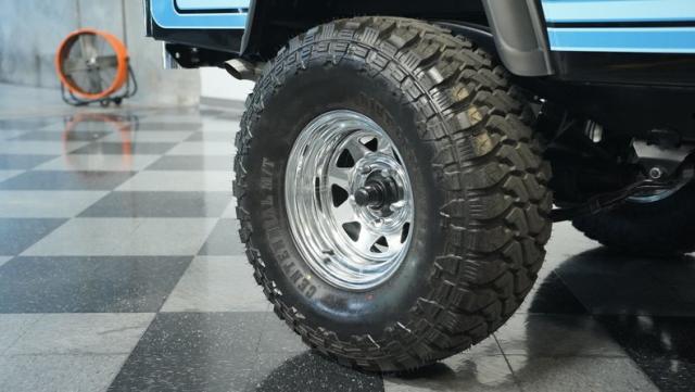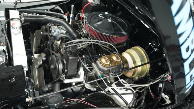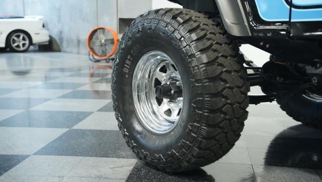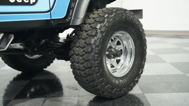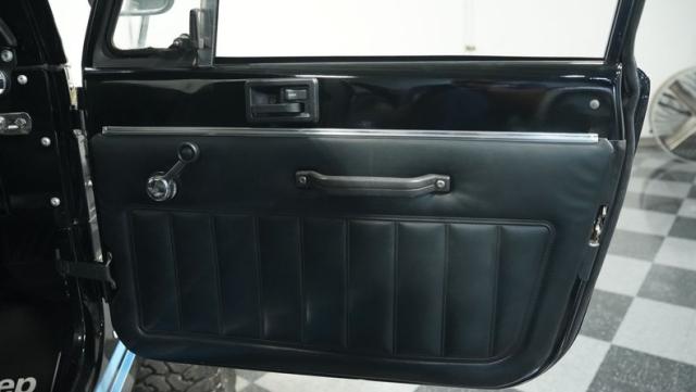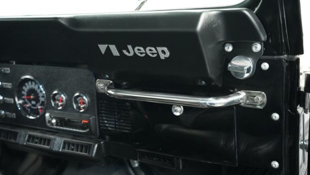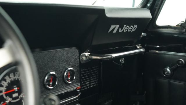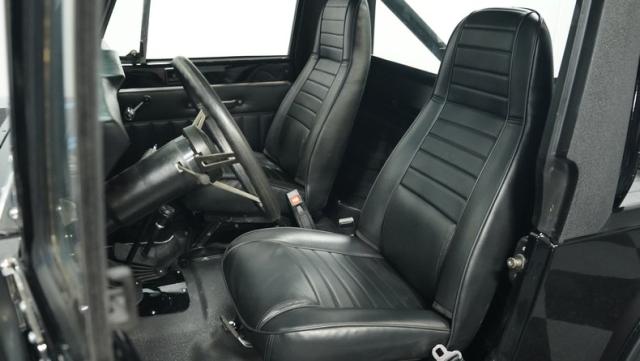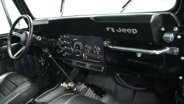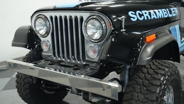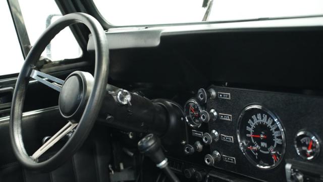 The Scrambler\'s cabin showcases a complete overhaul focused on both style and function. Black highback bucket seats, refoamed and recovered in vinyl, offer sturdy support for off-road excursions. The dash features all-new Speedhut gauges, including a GPS speedometer for precise readings in any terrain. A Retrosound AM/FM radio with Bluetooth capability provides modern audio options while maintaining a classic look. New HVAC controls, steering wheel, and seatbelts round out the interior upgrades. A brand-new Jeep air conditioning system keeps occupants comfortable in all weather conditions. The installation of a Painless wiring harness throughout ensures reliable electrical performance for all onboard systems.