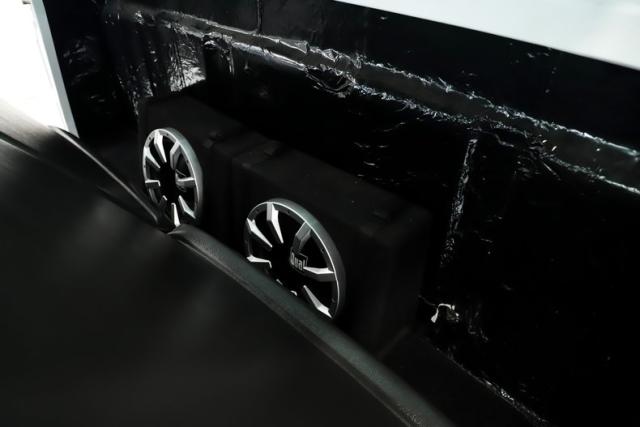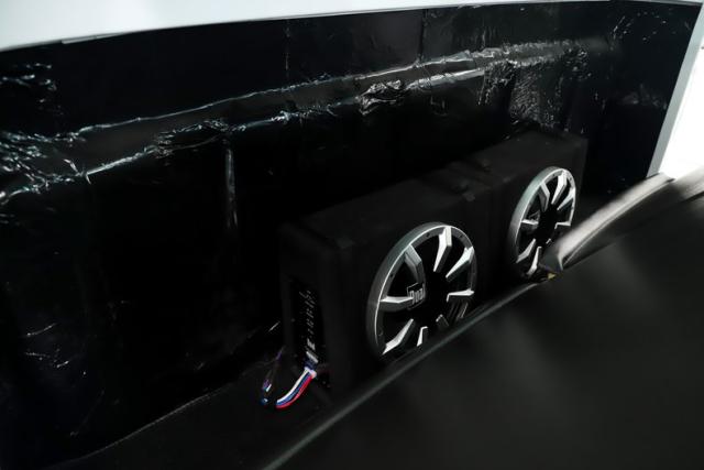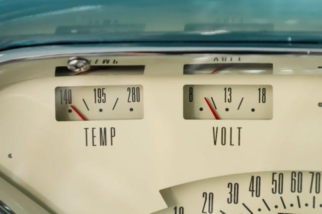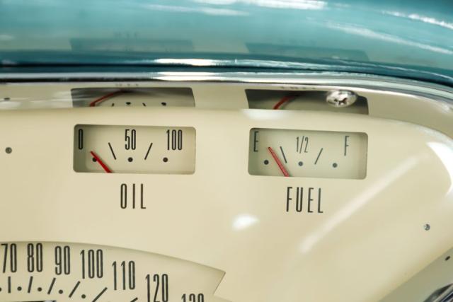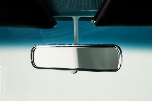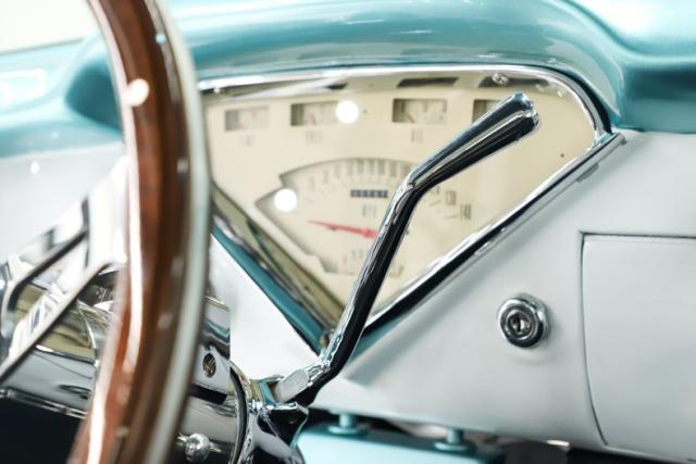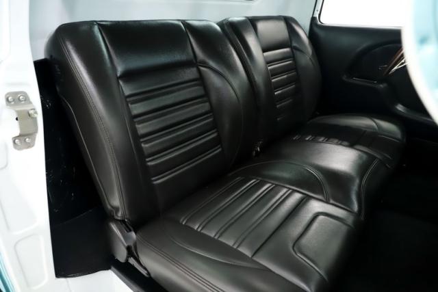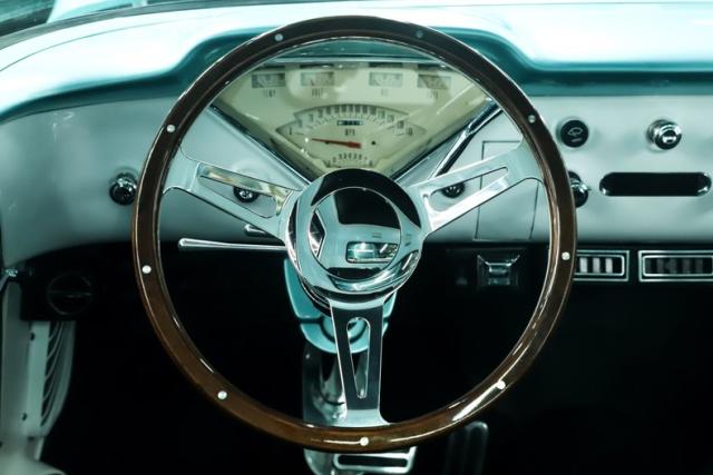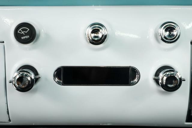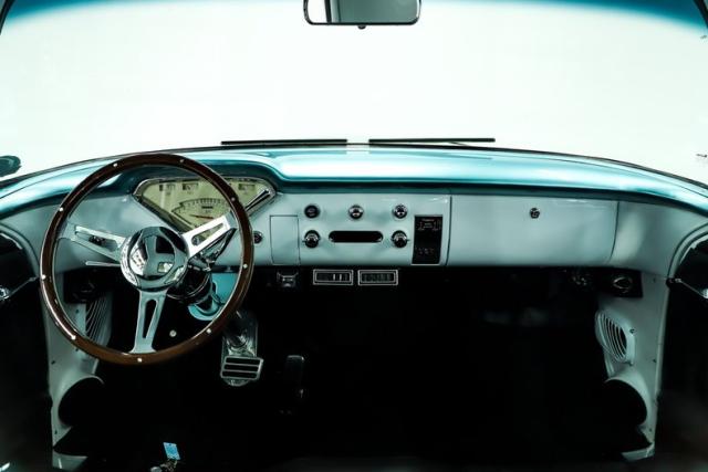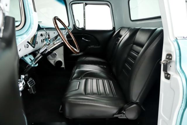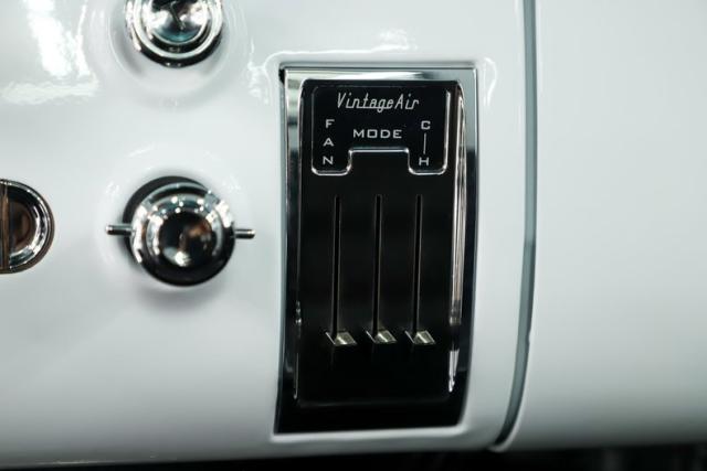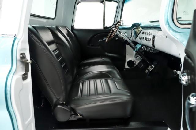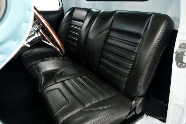 INTERIOR: Check out the custom TMI interior including the contoured seat and molded door panels. It also has a headliner and visors. Don\'t go cranking the window cranks, just gently push up or down and the power windows will do the work for you! The dash is painted slick and was kept vintage looking. It has a really nice looking gauge package including a tachometer. The digital stereo fits in the factory hole and uses stock knobs. Even the Vintage Air electric slide controls look stock! It has a day/night mirror too. The tunes will be coming from kick panel speakers and two 10 inch speakers behind the seat. The tilt column is chrome with a beautiful wood rim wheel. Under the new carpet and behind the seat is lined with sound deadener.