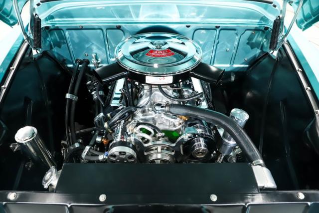 ENGINE COMPARTMENT: It\'s a beautiful motor compartment in at the heart of it is a Hot Rod Company crate motor. It\'s a 383 stroker making over 400 horsepower features aluminum heads polished aluminum intake Edelbrock car with electric choke h e i ignition system and a set of block hugger coated headers The front of the motor is a billet runner system with serpentine pulleys polished compressor and alternator along with a modern power steering is a polished reservoir and braided stainless hoses The motors really dressed up some beautiful chromed Chevrolet valve covers and a dual snorkel air cleaner It runs cool with an aluminum radiator is two electric fans aluminum water pump and a polished overflow bottle Everything is installed neatly The engine bay is painted beautifully and I see stainless hardware used throughout