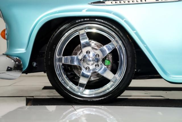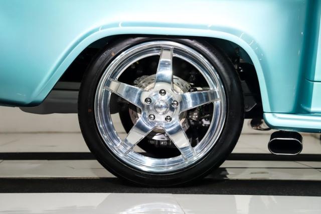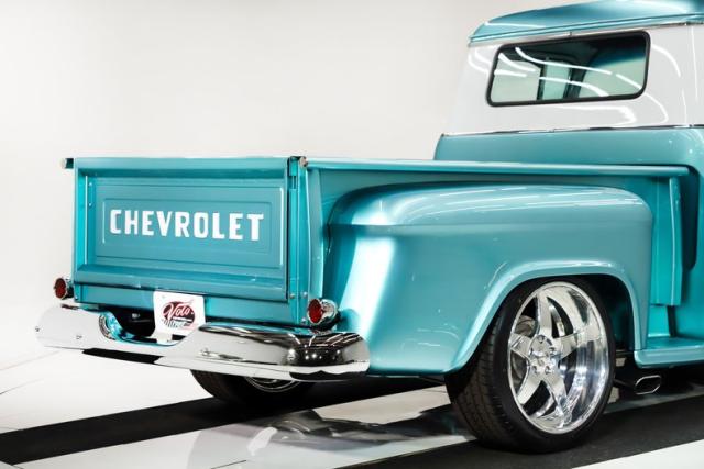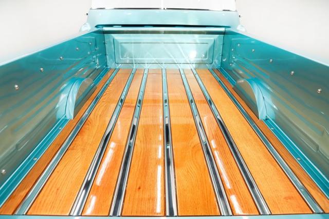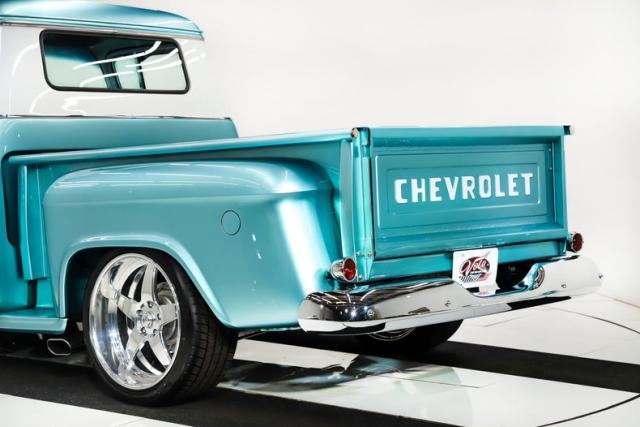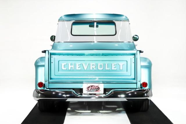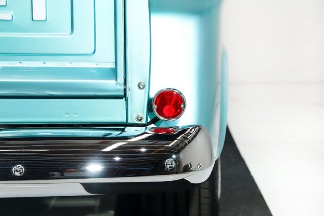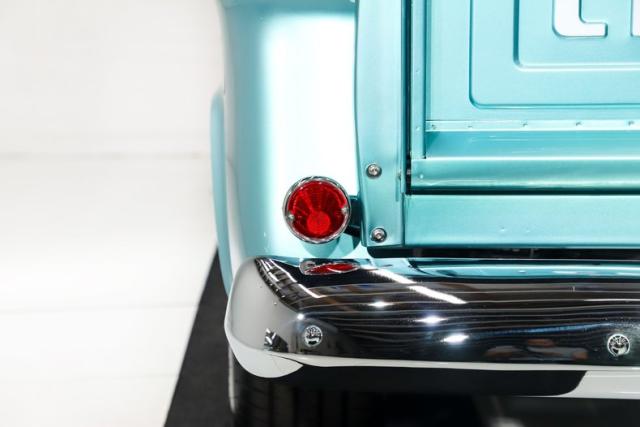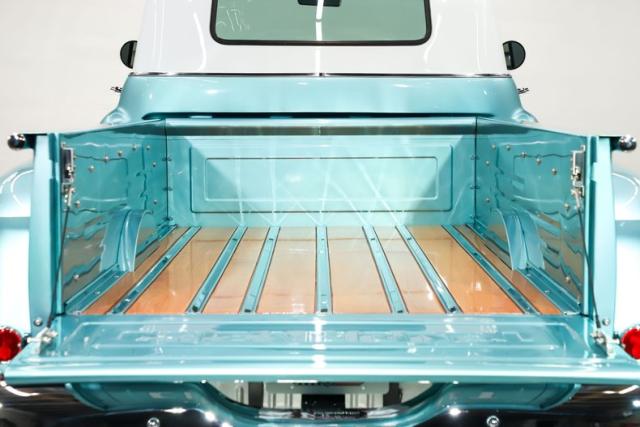 UNDERSIDE: The body was off the frame and flipped upside down and rotisserie, and that\'s because the bottom is painted as beautiful as the top. The frame was prepped and painted black, and it has a Corvette independent front and rear suspension attached to it. Up front it has adjustable coilover gas shocks, aluminum control arms and spindles, heavy duty swaybar, rack and pinion steering. In back it has adjustable coilover gas shocks, aluminum control arms and axle shafts. It has an updated brake system with drilled and slotted disc at all four wheels, a power brake booster and vacuum assist pump. The exhaust is polished stainless steel with Dynomax mufflers, the polished tips are peaking out from under the running boards. The fuel system was completely replaced, and the tank was relocated to under the truck. Looking up at the motor it has a high torque starter, chrome oil pan and flywheel cover. The transmission is a 700R4 overdrive automatic with a finned aluminum pan and an aluminum finned remote oil cooler. The driveshaft goes through a safety loop before connecting to the aluminum Corvette rear end.