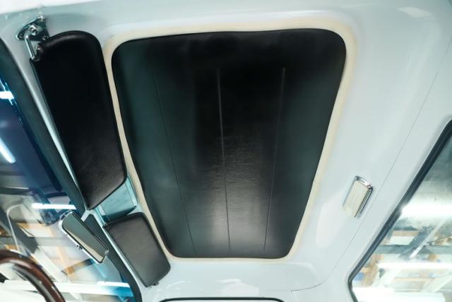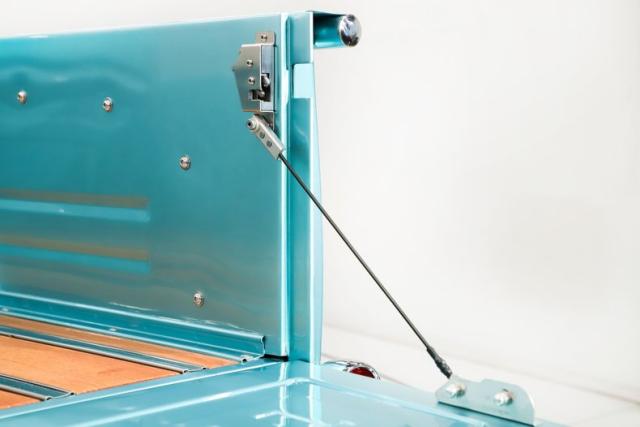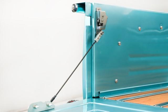 TRUNK COMPARTMENT: Inside the box is painted just as pretty as the outside of the box. It has a refinished oak floor with polished stainless strips and polished stainless hardware was used throughout. It is also upgraded with modern latches and cables.