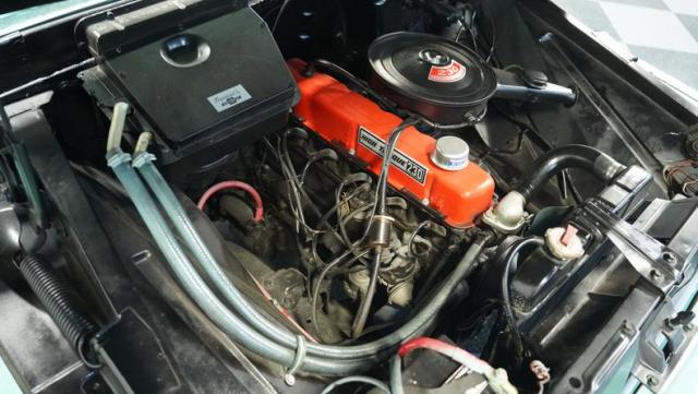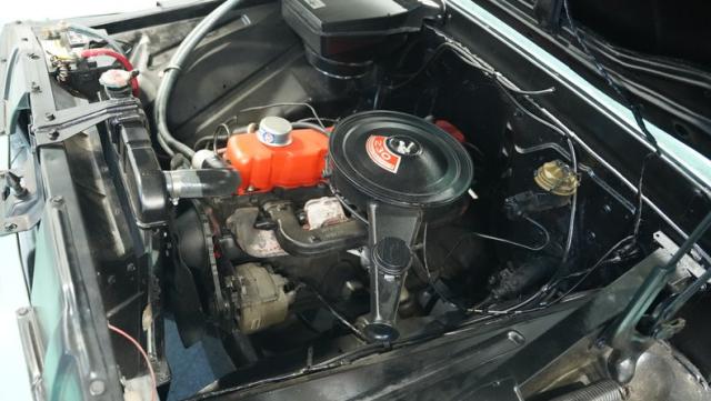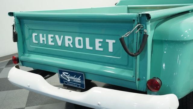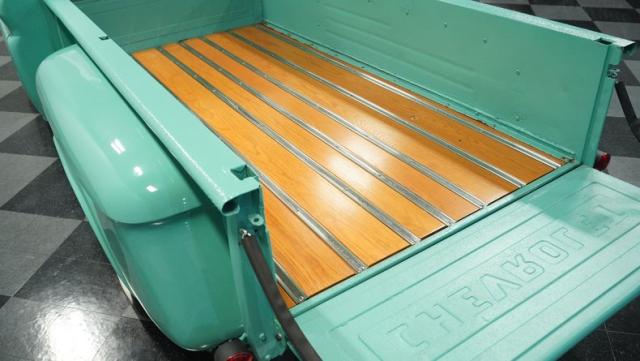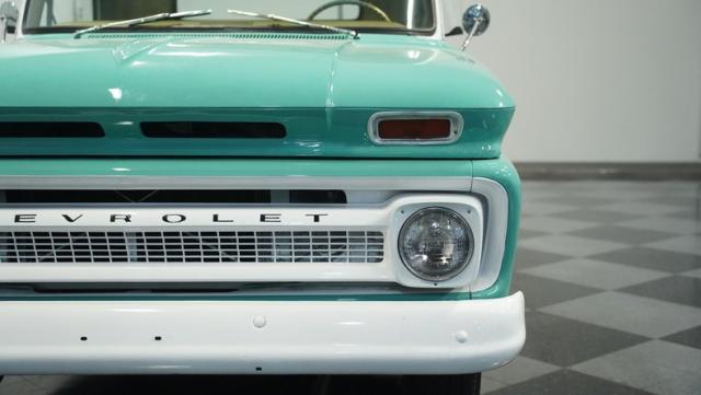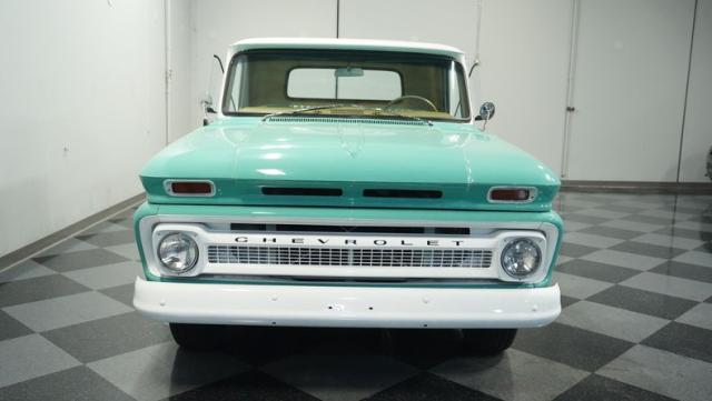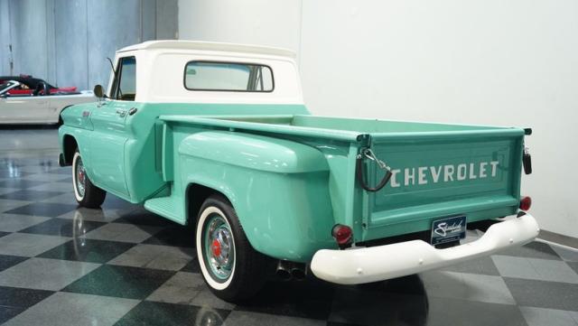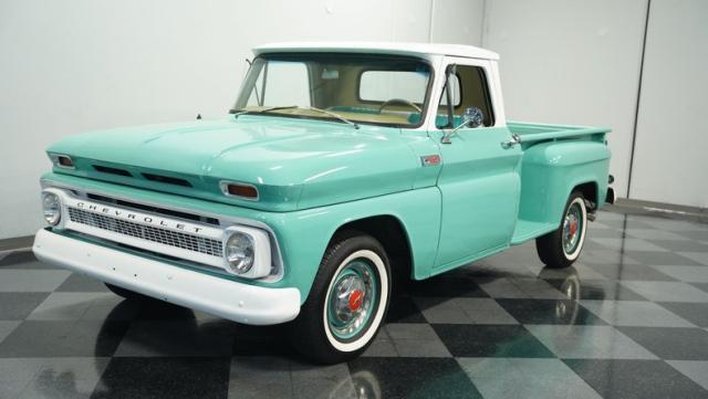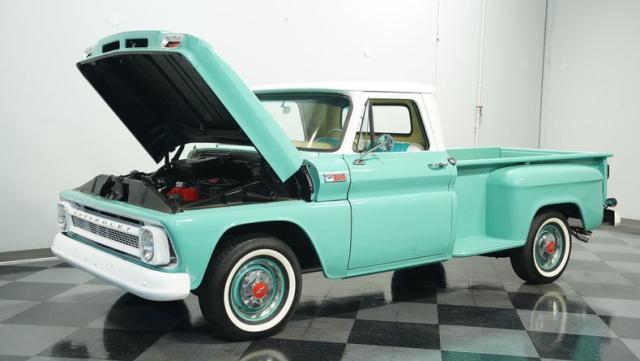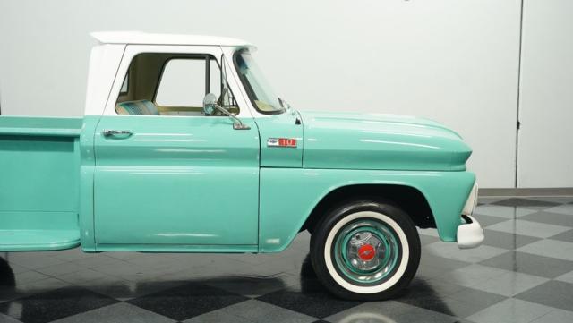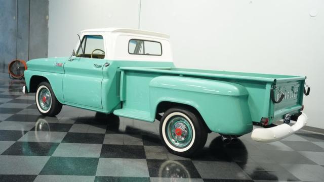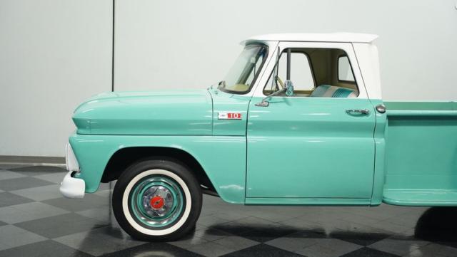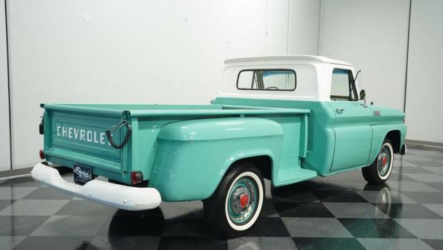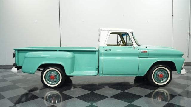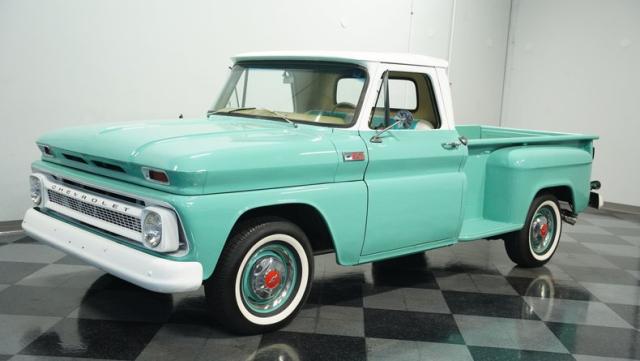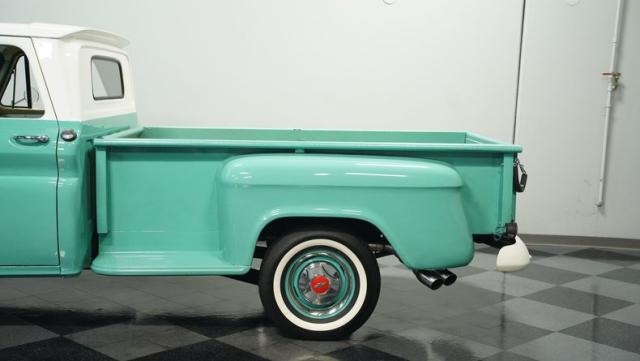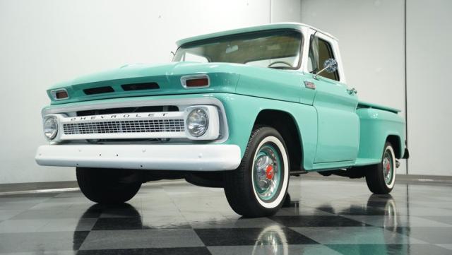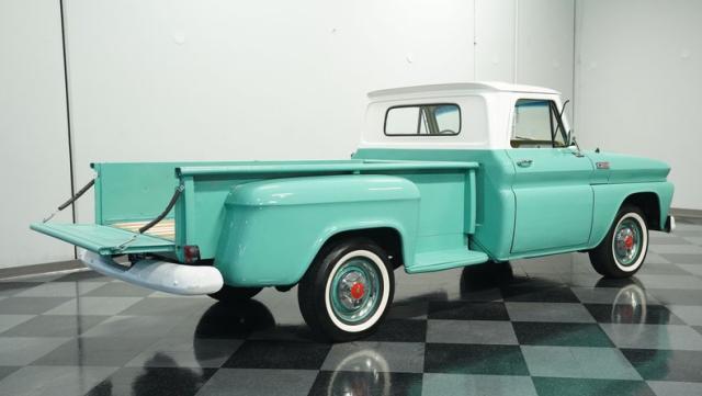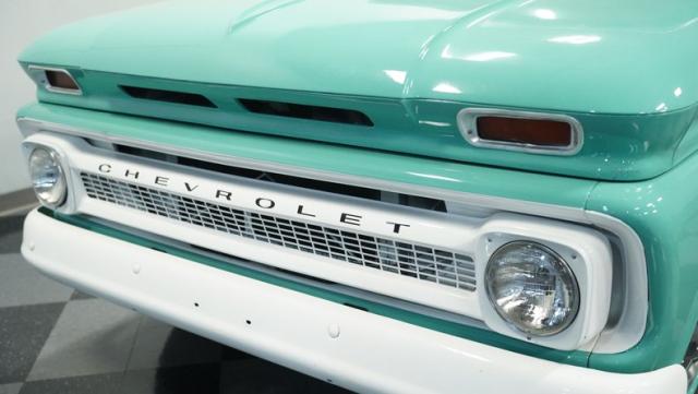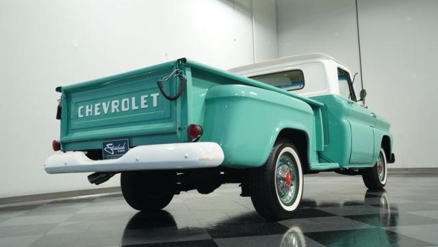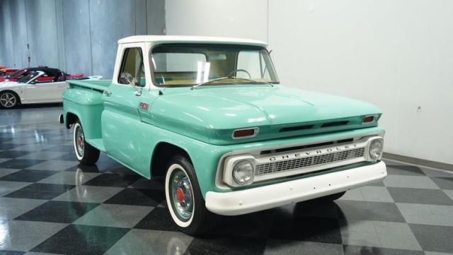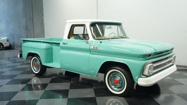 This 1965 Chevrolet C10 Stepside showcases a bold teal and white two-tone paint scheme. The long 127-inch wheelbase creates an impressive road presence. Its stepside bed design adds functionality and classic appeal. Riding on 15-inch wheels wrapped in P235/75R15 tires, this truck sits with authority. A fiberglass hood reduces front-end weight, while a single exhaust with an aftermarket muffler provides a subtle auditory accent. The C10\'s exterior combines vintage aesthetics with practical upgrades, resulting in a truck that\'s both a workhorse and a showpiece.