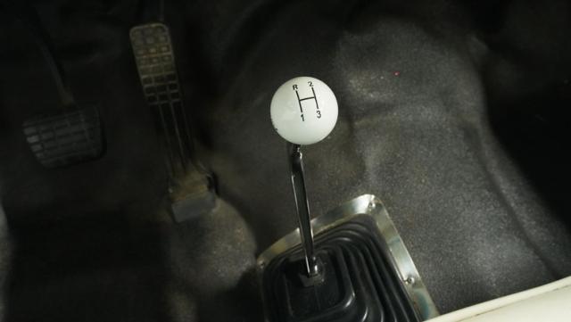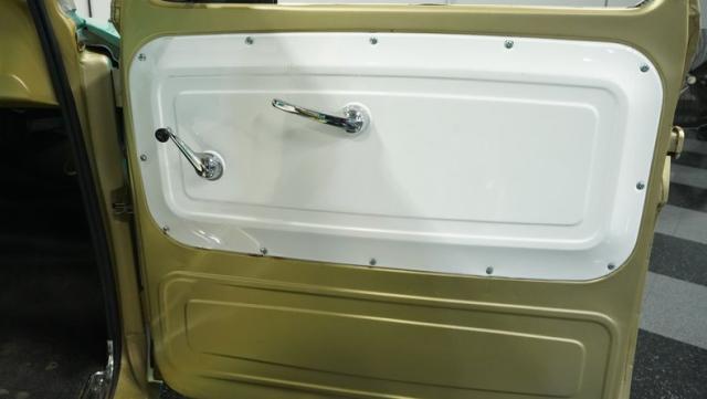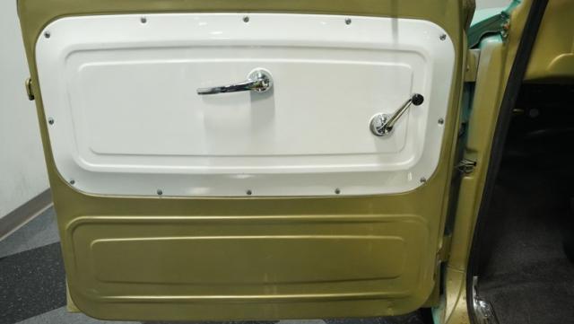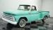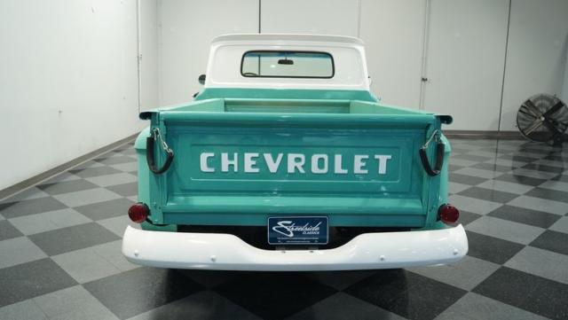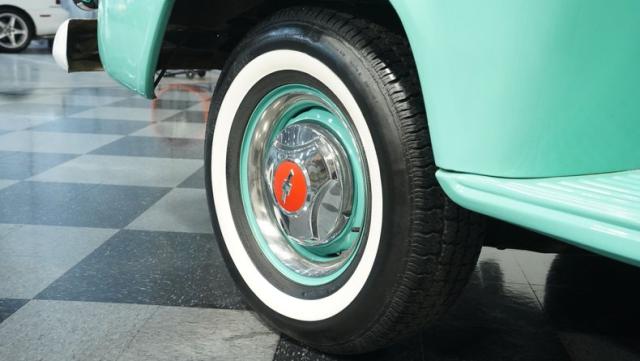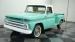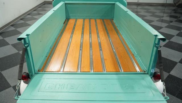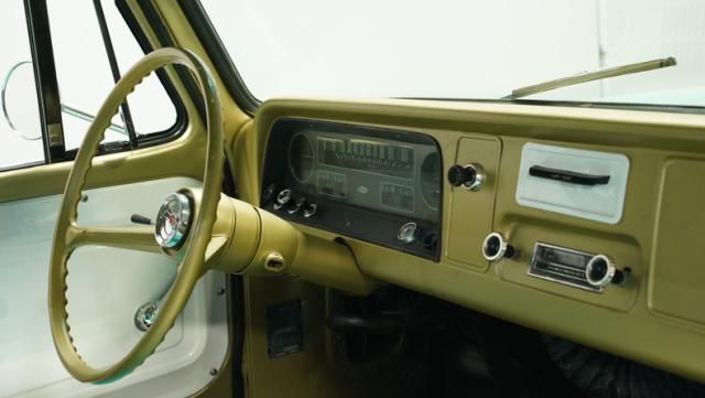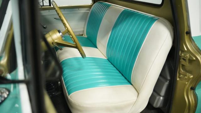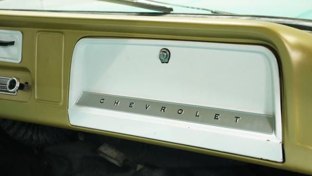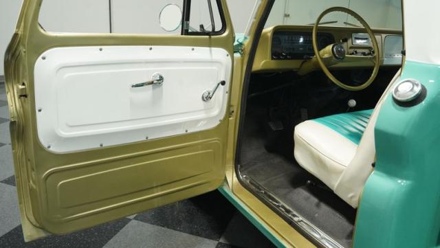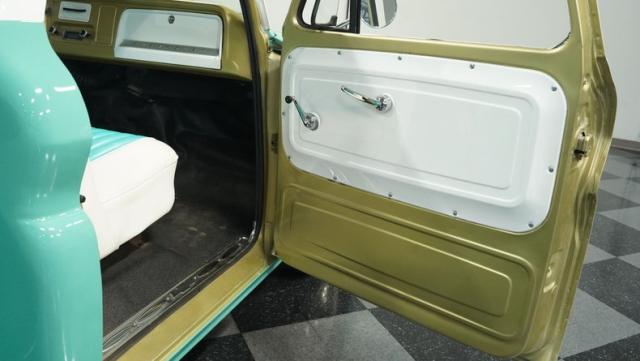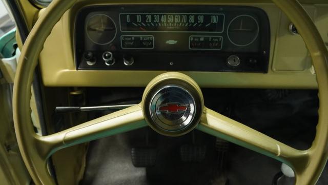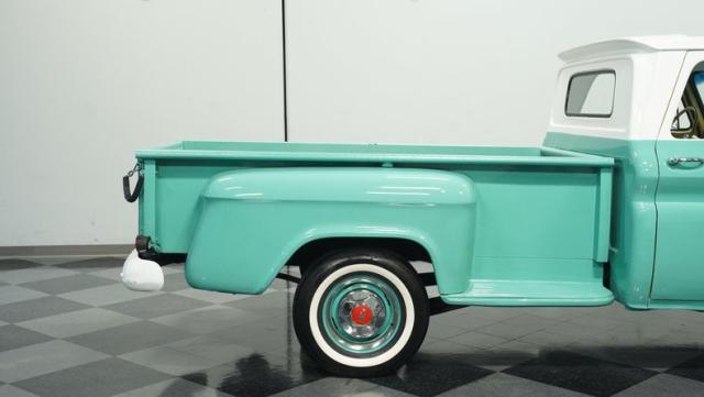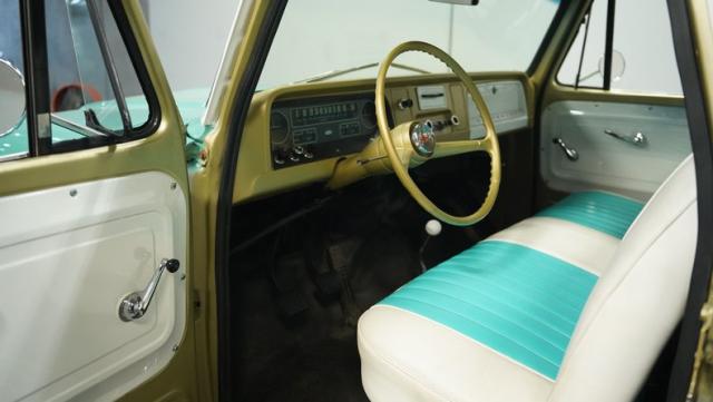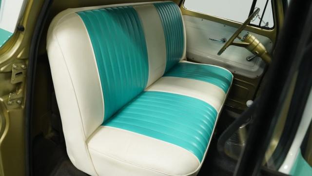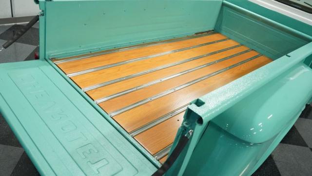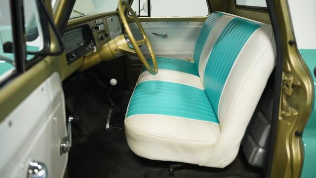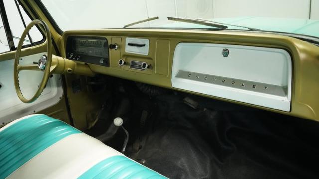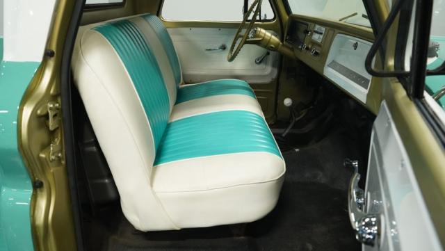 Inside, the C10\'s cabin continues the exterior\'s color theme with white vinyl seating adorned by teal accents. A Hurst floor shifter replaces the original column-mounted gear selector, offering improved control and a sportier feel. The dash houses an AM radio, ready to provide period-correct tunes. Absent are modern amenities like power steering and air conditioning, preserving the authentic driving experience of a classic truck. Custom floor mats add a personal touch while protecting the interior surfaces.