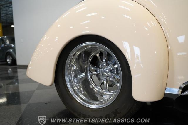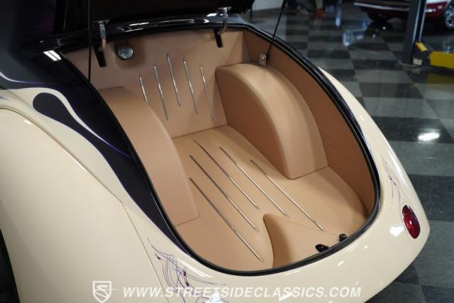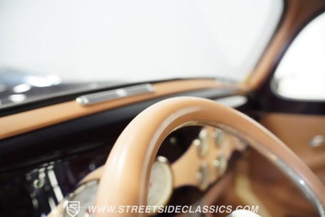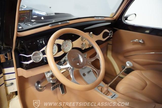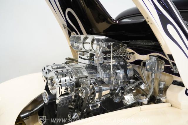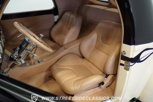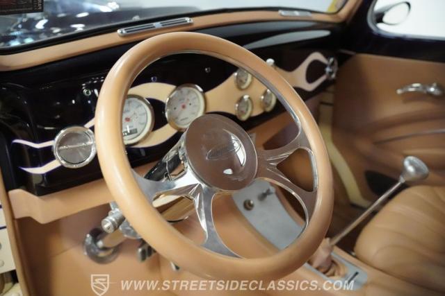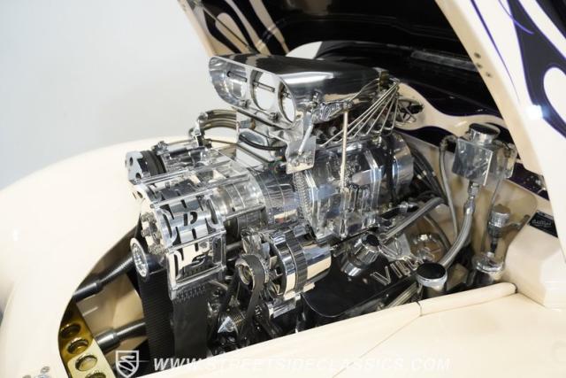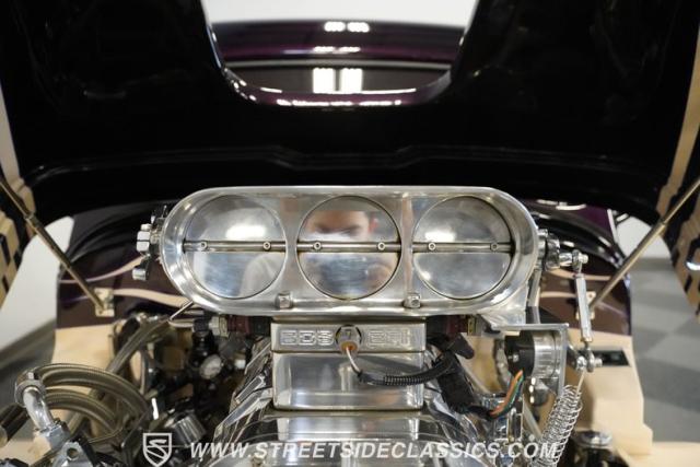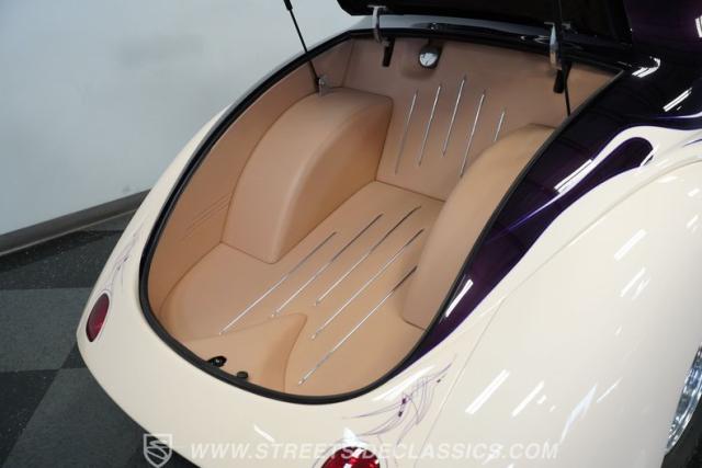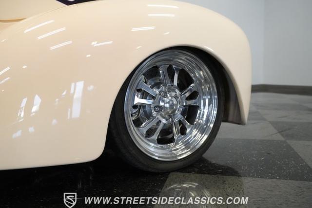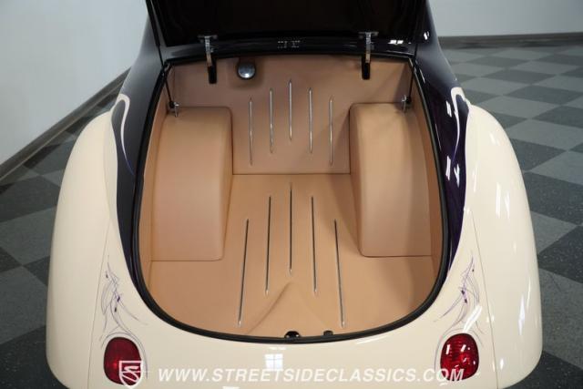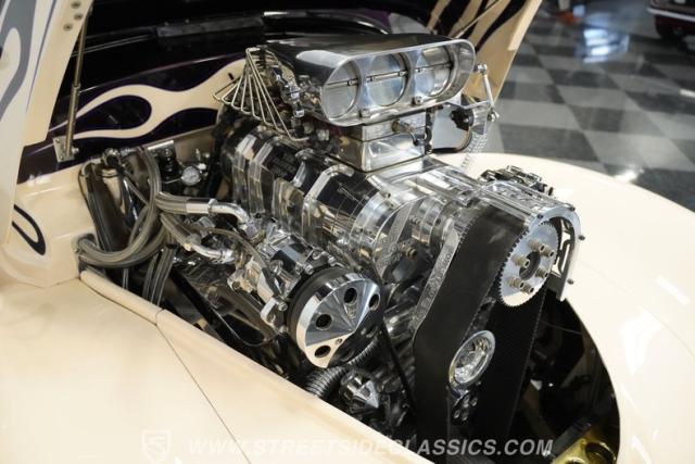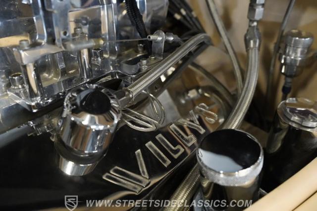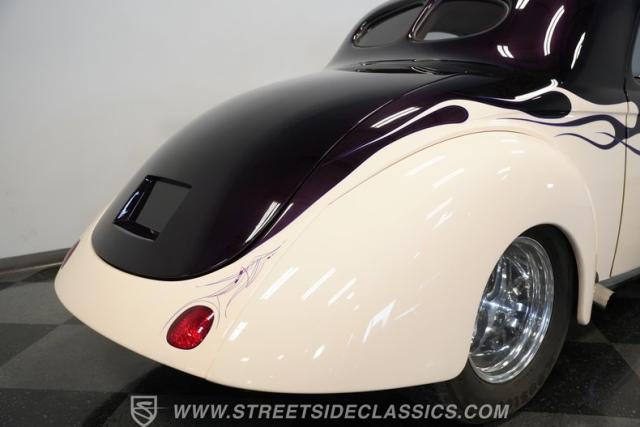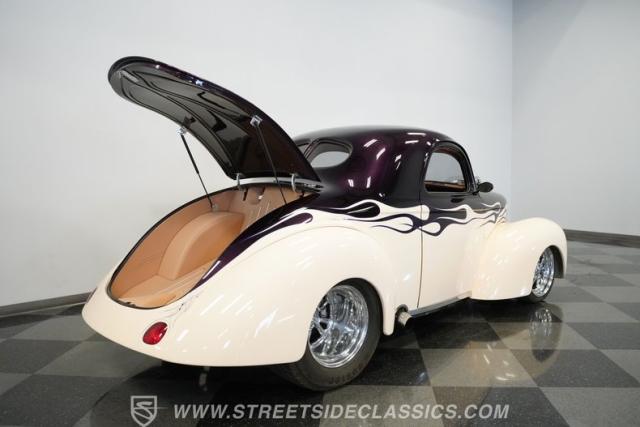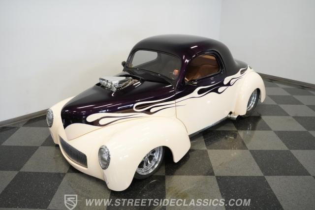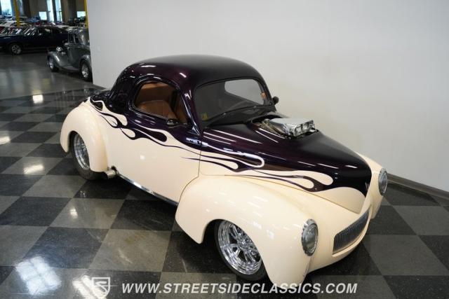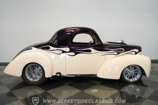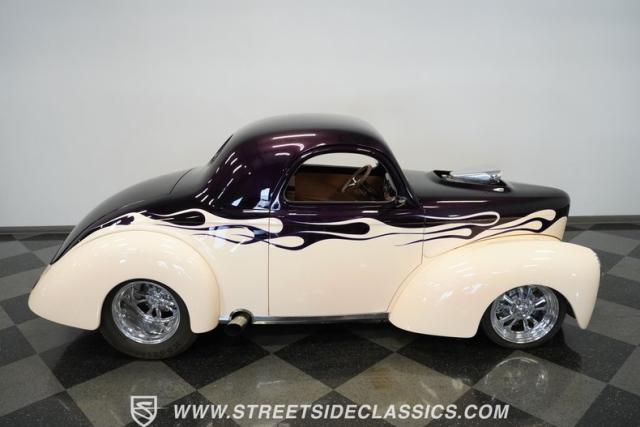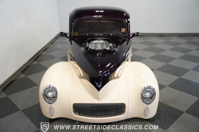 Finished in 2014 after a 5-year build, the 1941 Willys Coupe features an Outlaw fiberglass body adorned in a striking two-tone paint scheme. Deep plum candy and Sweet Georgia peach pearl colors flow across the curves, complemented by expert hand pinstriping and a white gold leaf hood logo. Six layers of base and six coats of clear create remarkable depth after wet sanding between each application. The dual side-exit exhaust adds aggressive visual appeal, while the 17\" Aluminum Budnick wheels wrapped in 215/40R17 front and massive 31x16.50R17 rear tires give the Willys its perfect stance.