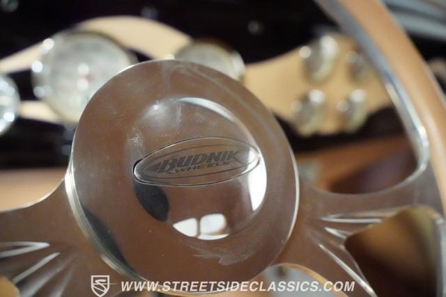 The coral European leather interior continues the custom theme with meticulous attention to detail. Comfortable bucket seats provide excellent support, complemented by a full-length floor console upholstered to match. The custom-painted dash features flames that echo the exterior design, while white-face Dolphin analog gauges display vital information. The billet shifter rises from the center console, accompanied by matching billet pedals. A chrome tilt column topped with a Budnick chrome wheel completes the control setup, and even the trunk receives matching upholstery treatment.