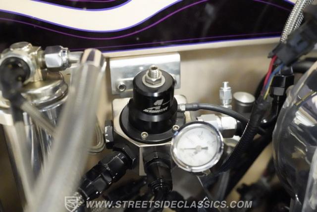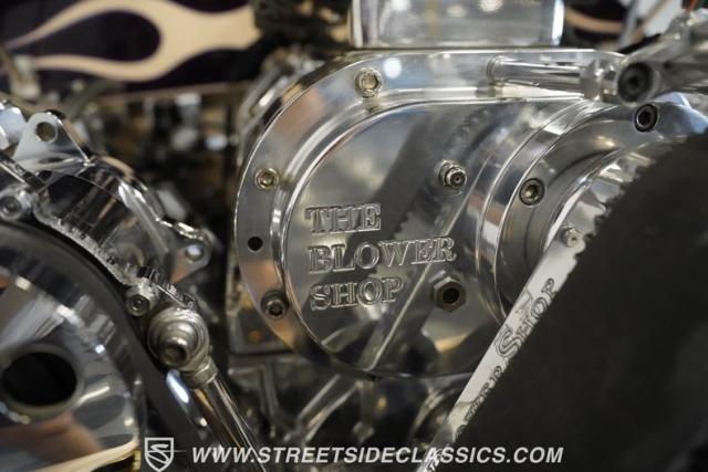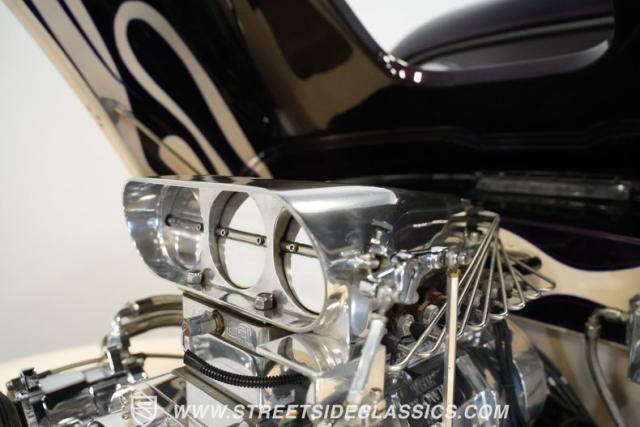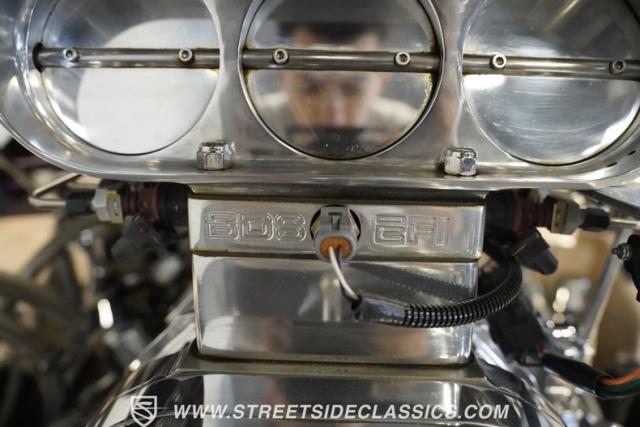 The massive 502 cubic inch V8 engine dominates the engine bay, topped with a BDS 871 supercharger and Fast fuel injection system utilizing 16 injectors. Edelbrock aluminum heads enhance performance, while Sanderson long-tube headers feed into glasspack-style mufflers on the side pipes. All this power channels through a TH400 3-speed automatic transmission to a 9-inch rear end with 3.70 gears. The full Outlaw chassis features independent front suspension with tubular control arms, rack and pinion steering, and a four-link rear with Z-bar. Air ride suspension allows adjustable height, while four-wheel disc brakes with drilled and slotted rotors provide stopping power.