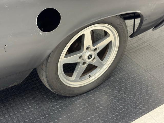 What you might expect from an old racer, some typical surface rust, some custom cuts, extra braces, and a bit of oil on the pan. Disc brakes are at the front wheel and drums in back. Dual exhaust runs from the headers and runs fully intact to exit just behind the rear wheels. Suspension consists of coil springs up front and ladder bars and coilovers in the back