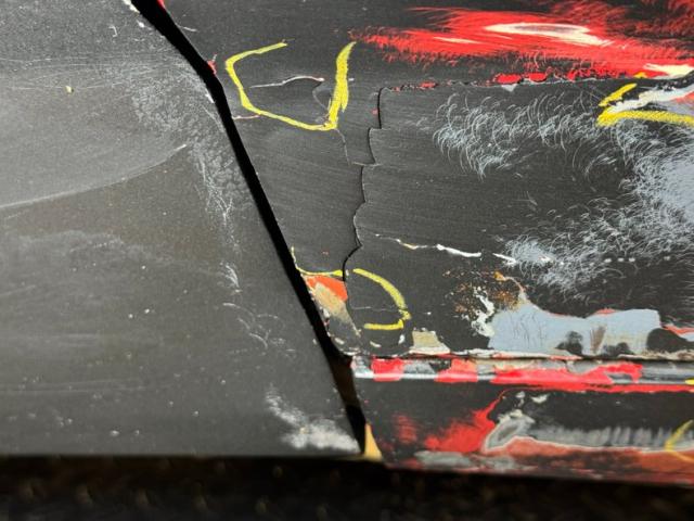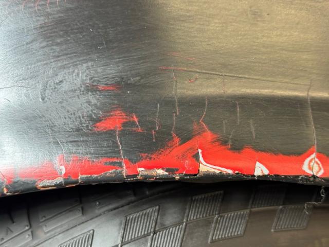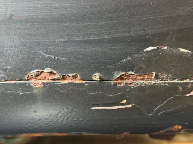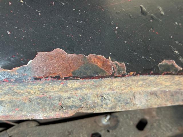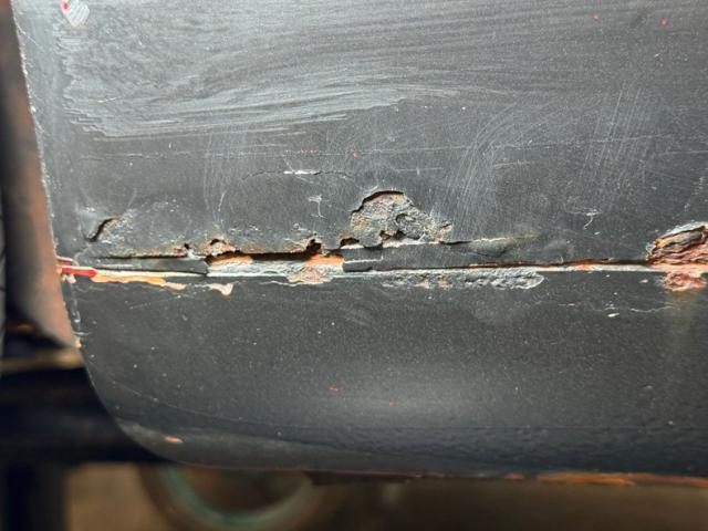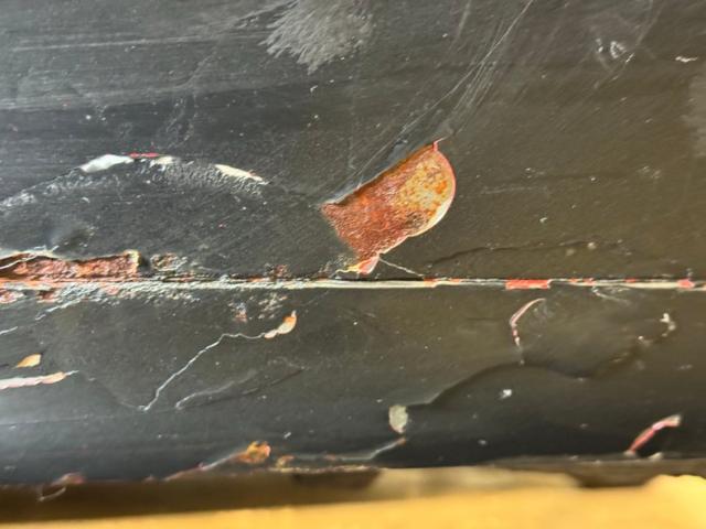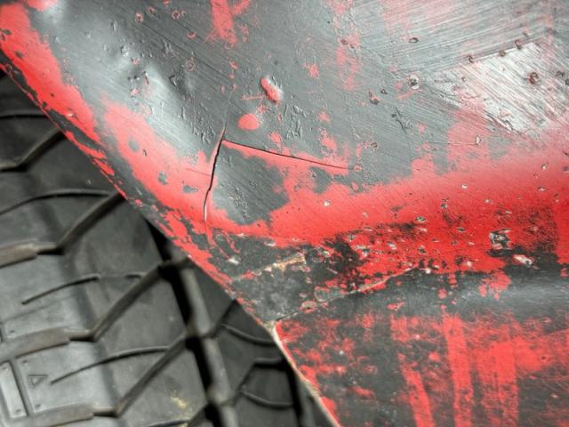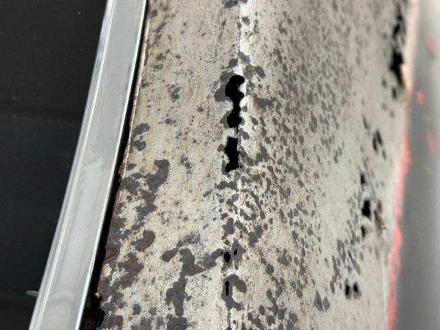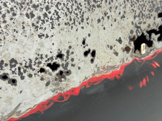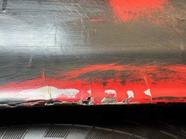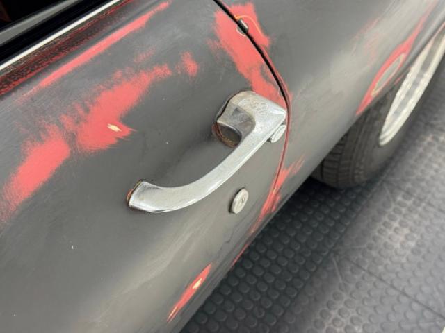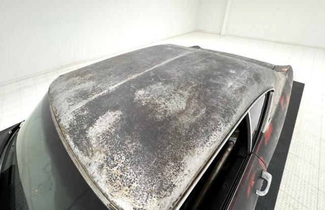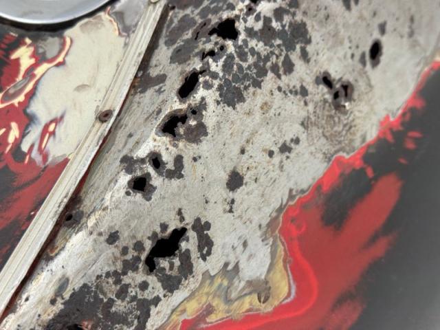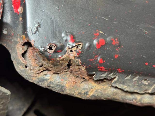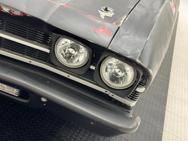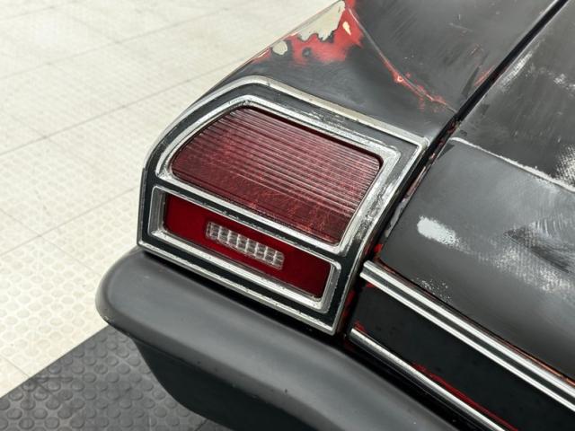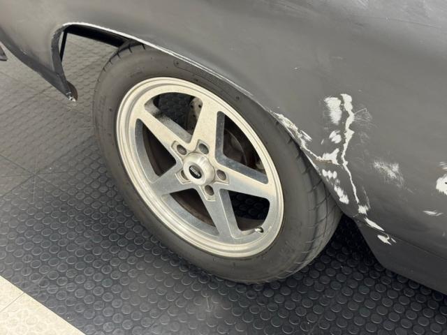 Here we have a combination of satin black, bare metal, and all kinds of patina and body work. Richard Rawlings might call this one rougher than a stucco bathtub, but maybe it\'s not that bad! There are areas where filler has been sanded down, exposing the red primer below and it shows a kind of patina people will purposely paint on their car. The roof is bare and there\'s quite a bit of rust through on the C-pillar and a gaping hole in the passenger\'s fender. That\'s what Derek from Vice Grip Garage would call weight saving. There\'s rust on the latch panel as well. For shoes, we have Jegs Sport Star wheels, 17-inch front and 15-inch rears and a modern touch is added with LED lights up front along with some old school hood pins.