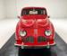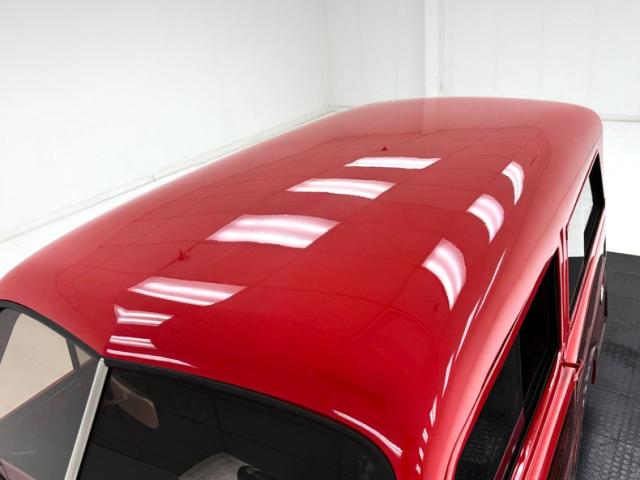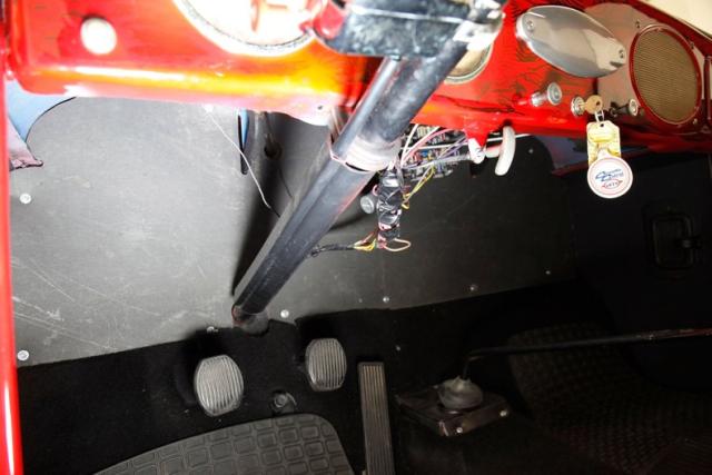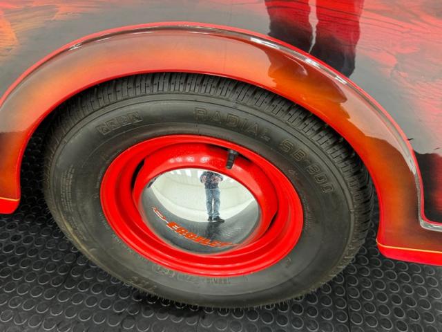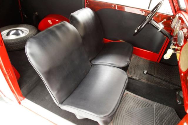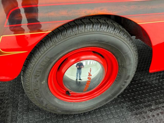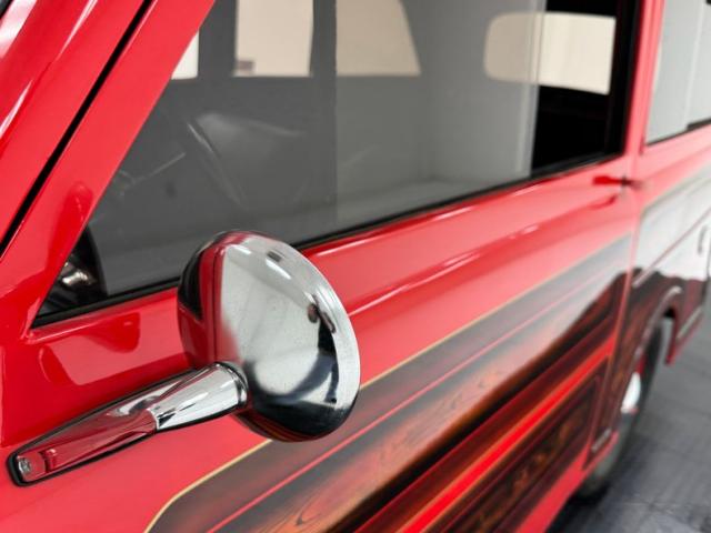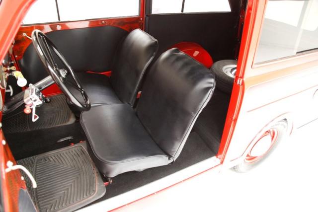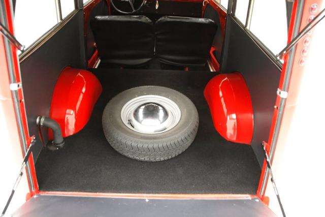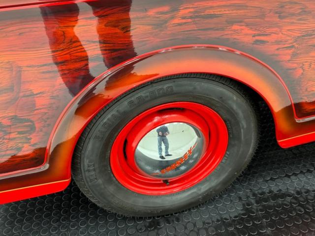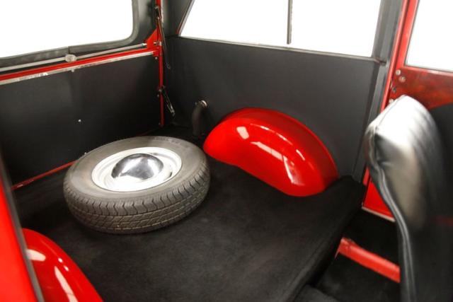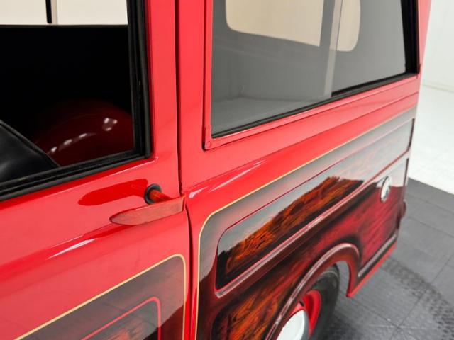 Swinging open the light but long, again relative, doors we see 2 low back buckets covered nicely in black vinyl and in the back we see simple black covered panels along with the red wheel houses and a full size spare tire. These are fronted by a red metal dash with more custom woodgrain airbrush work along with twin round gold faced Crosley gauges in front of the driver. In the center is a brushed metal finish radio delete plate along with a few knobs and the ignition. Facing the passenger is a gold mesh speaker grille. Clean black carpeting floods the floors and from under the dash rises the long arm black shifter. More black vinyl for the inserts on the doors, which are surrounded by red steel with a spattering of airbrushed wood. Chrome actuators grace these doors but alas, the windows don\'t wind down, they just slide halfway open. Rounding out the tour, a black headliner hangs tightly above and is highlighted by chrome divider strips.