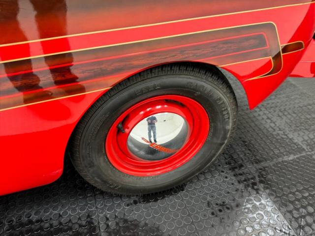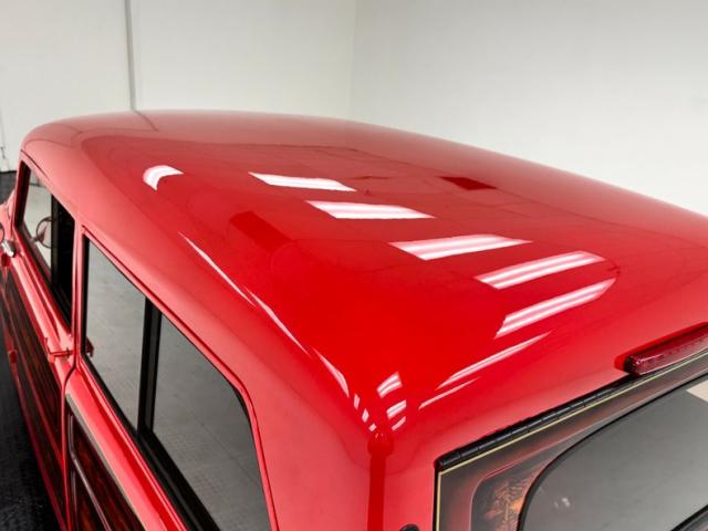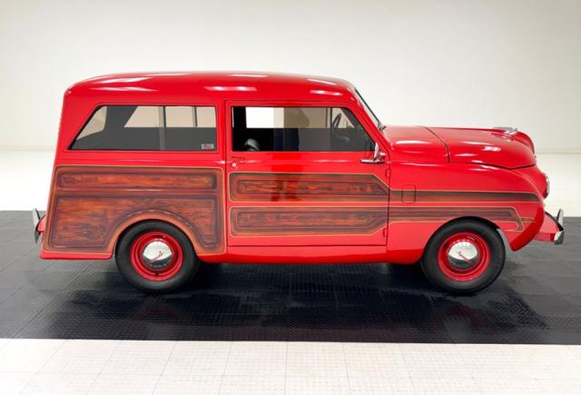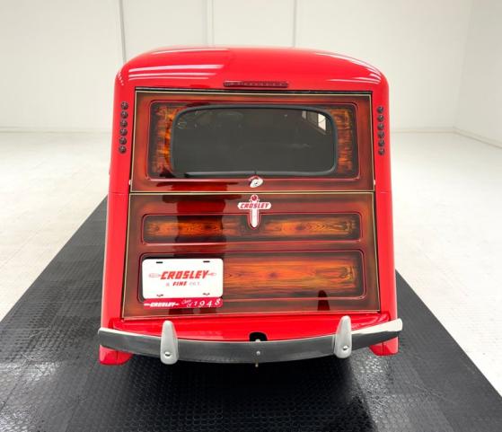 Small but any stylish would best describe this half scale station wagon. This example, well restored and bathed in red, shows a few flaws in the form of pops in the clear coat of the roof but still retaining a deep lustrous shine. Otherwise, all straight steel with well minded gaps present nicely as this mini wagon does a splendid job emulating the looks of the wagons produced by the larger, (both in size and volume), automakers of the day. Much smaller scale though but still using the curved hood, integral fender mounted rounded headlights and split mesh style grille. Long, (think relatively), slab sides are now adorned with custom airbrushed woodgrain inserts, starting small at the front fender and sweeping out along the doors before culminating into beautiful reddish brown mahogany, fitting perfectly into the indented rear quarter panels. Chrome is kept to a minimum with only the bumpers, mirror, and emblems shining brightly in the sea of red. Lightly smoked glass surrounds the passenger compartment and on the back is more airbrushed wood on the dual opening tailgate which is flanked by custom LED tail/signal lights. Red painted 12-inch wheels with chrome Crosley moon capped centers are on all 4 corners and are wrapped in blackwall 155R12 rubber.