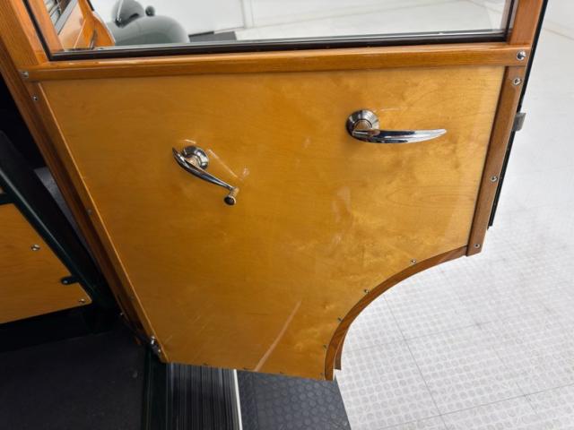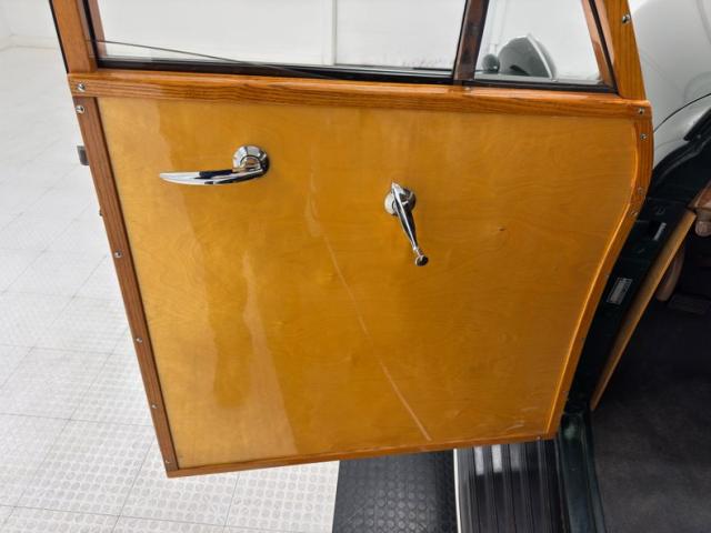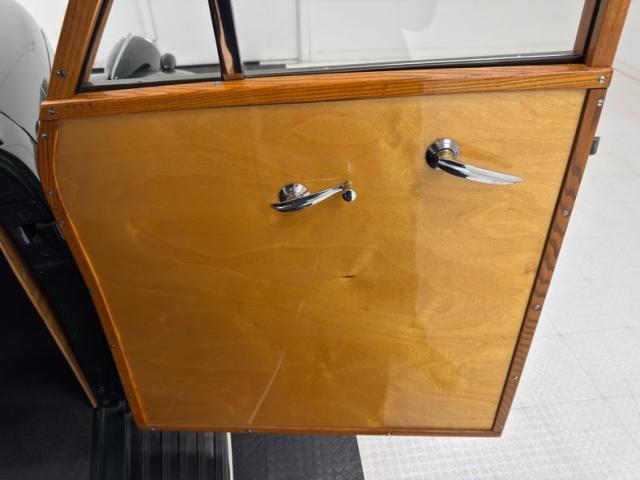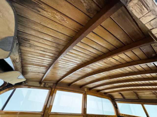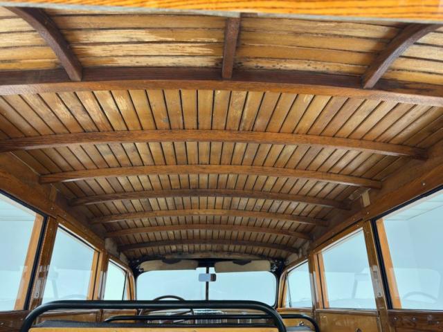 Let\'s start on the ceiling where a lath-like construction of wood runs the length of the large top. The inner doors are constructed with seamless wood panels trimmed in oak and housing basic hardware. It\'s all wood on the way back and on the rear hatch as well and if there\'s ever been a treehouse on wheels, this is it! Sidewalls, seat backs, and door jambs, all wood. The front bench is a tubular framed black vinyl affair in fine condition while the shorter back seat is of the same construction and materials. A wonderfully flat floor with a step down is underfoot, unimpeded by carpet or large humps, (there is a small one). A chocolate brown steering wheel leads to an amazing wood dash with a wood applique framed gauge cluster that matches the frame in color precisely, a perfect blend with art deco fonts. A metal grille takes up the center while a glorious clock is embedded on the glove box door. A Super Deluxe branded heater is in the footwell in front of the passenger looking as clean as it did on day one.
