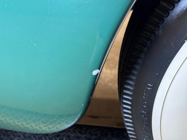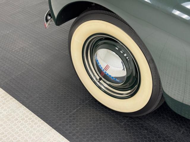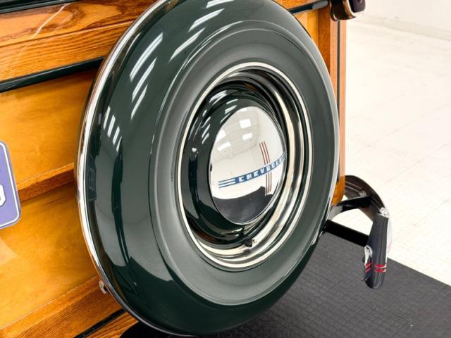 What color goes best with wood? Many will argue but few can deny that green, in this case Ridge Green Metallic, is a stunning choice to contrast with the honey colored wood of the body. This green covers the steel body from the nose to the firewall and again over the rear fenders. A grain patterned vinyl cover over canvas creates the roof and its dark color also provides a great counter to the light wood and blends well with the header areas above the windshield, which is green. The chrome grille and hood ornament, along with other metalwork on the car is spectacular and upstaged only by the glossy wood of the exterior which looks positively wet. The wonderfully square rear of the car contains high windows and an encased spare tire, the case pinstriped and containing the same hubcap that appears on the 16-inch wheels the car rides on. Chrome bumpers are adorned with a twin red stripes which is picked up in the Chevrolet emblem and seal on the nose. An amazing exterior with the only flaws being a chip and a scuff on a fender.