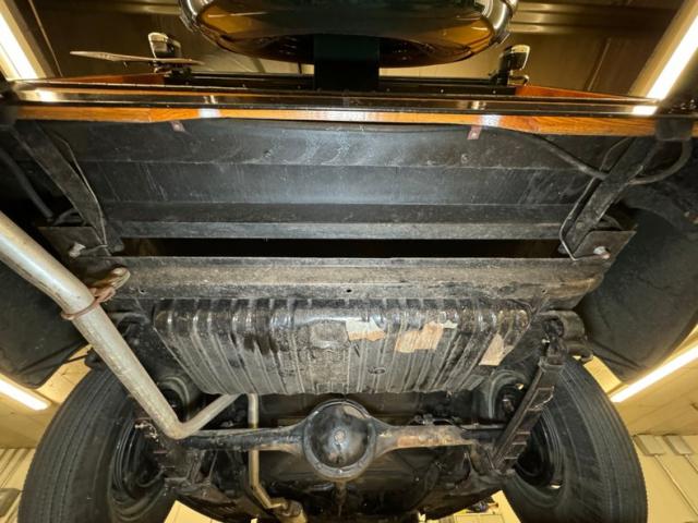 Generally clean underneath with surface rust and flaking paint on numerous components and a bit of residual oil on the transmission, a single drop on the oil pan plug. There\'s road spray throughout but no grease build up on steering and brake components. A single exhaust finds a stock style muffler before exiting out back. Suspension consists of coil springs in front and leaf springs in the back. Looking under the doors, we see no rust of course, and also no sign of wood boring insects.