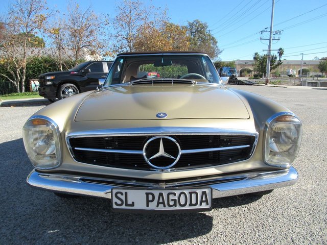 The 280SL is a class act and gets noticed and admired at every street corner! This original Blue plated California car is finished in a beautiful Tunis Beige Metallic and comes with a Dark Brown canvas Soft Top, removable Hard Top, the original 14 inch steel wheels with color matched wheel covers and a set of classic white wall radial tires. The chrome and and brightwork are in amazing condition and although it is a U.S. model it has a nice set of European Headlights which are a little brighter then the stock ones. Under the hood sits a recently rebuilt 2.8 Liter 6 cylinder fuel injected engine with less than 2k miles on it, 4 wheel power disc brakes, power steering and factory A/C with updated R134 Freon. The interior is finished in Cognac MB-Tex with bucket headrest seats, Vintage Coco mats, floor shifter, original Becker Europa AM/FM stereo and original steering wheel. The previous owner lovingly pampered this Pagoda for the last 25 years and it has a stack of service records to prove it. You are sure to be parked right in front if you valet this one!