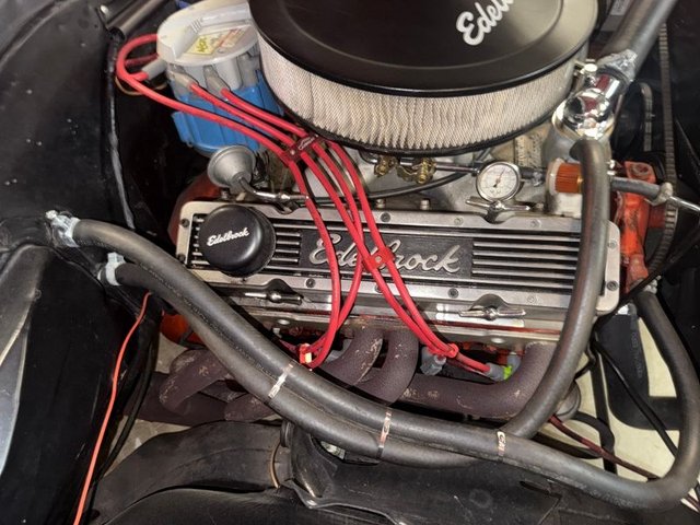 Powered by a 350 engine with 4-speed transmission, Edelbrock Victor Jr aluminum intake, Edelbrock carb, Edelbrock finned valve covers in aluminum. Black Edelbrock breather caps. Power steering with chrome cap, chrome alternator bracket, headers, windshield wash bottle is glass. The windshield washer is a plastic tank. Accel EI Supercoil with Red wires. Sway bars, 10-bolt in rear with dual exhaust. Runs good! Visit our website at www.ecoastcc.com for more info.