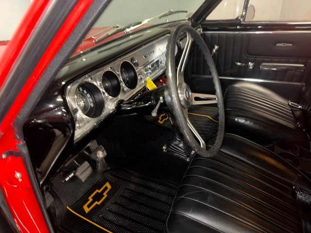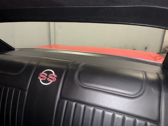 All black interior on bucket seats. There is 'SS' embroidered on the bucket seats and center of back seat. The door panels, rear side panels, package tray, carpet arm rest base arm rest headliner, Sunvisor’s, rearview mirror, dash cluster, gauges-Tach-fuel-amp-temp-oil. Aftermarket radio, rubber floor mats in front and back, steering wheel, horn button, window cranks, door handles, door sill plates, back arm rest and bases with ash trays, kick panels. Hurst 4-speed shifter with white knob, boot and trim, chrome Sunvisor supports. Dash is painted Hi Gloss Black, console still in box, dome light, fuse box and wiring. All looks new inside this car.
