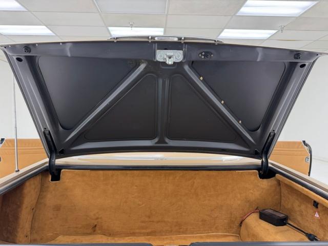 When we open the door, we note some cracks in the plastic door sill cover. But, in general, Mercedes is known for their well done interiors and tan MB Tex, covers our door panels with elegant simplicity and this spills onto the robust bucket seats is a pleated pattern below a handsome headrest and based in a highly polished metal frame with adjustments. The package shelf on the back is carpeted and houses a first aid kit. A textured and rubberized black steering wheel presents to the driver and an all business triple gauge package is in their sightline. No fancy graphics or electronics here as the gauges relay nine bits of information including the time, all in analog goodness. Burl wood, always a welcome sight, occupies the dash horizontal strip and back the center stack where climate controls and a Becker AM/FM/Cassette player is mounted. The wood continues onto the center console where we find the stout shifter and armrest, all in very nice shape. The low pile plush gold carpet looks great and is topped with carpeted mats. The headliner of the accessory hardtop presents cleanly and the trunk is lined with plush tan carpet.
