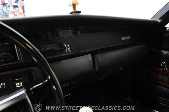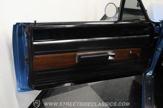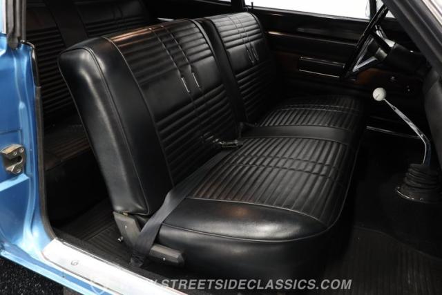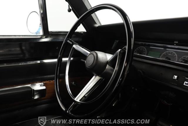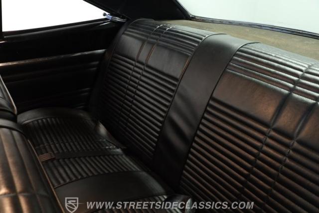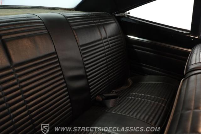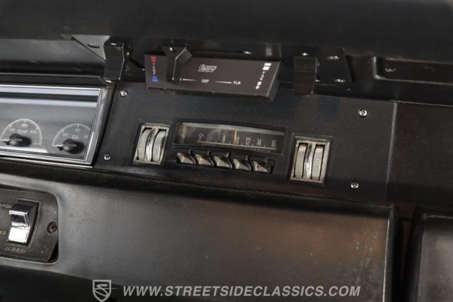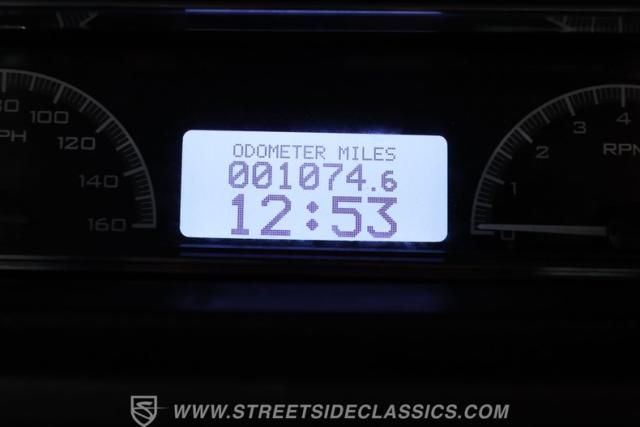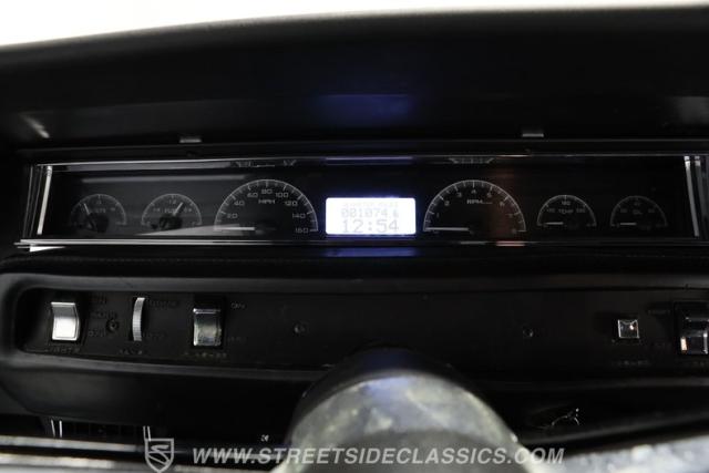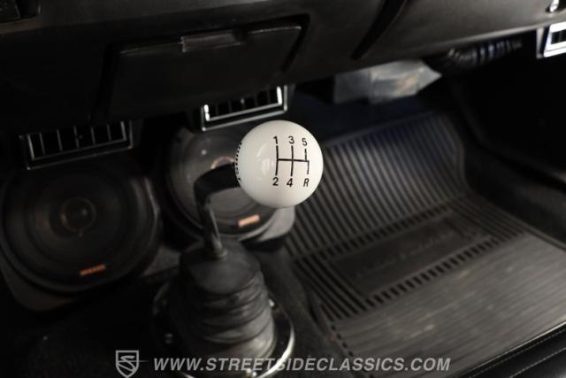 Inside, we find a black vinyl interior that has been restored to its original specifications, with the exception of a few tasteful improvements. A roomy split-bench front seat sits in front of a three-spoke, power-assisted steering wheel. An upgraded analog/digital gauge cluster features a 160-mph speedometer and 8,000-rpm tachometer, with a digital display front and center. Two big speakers are mounted under the dashboard and are connected to a hidden Bluetooth radio, while the cueball shifter knob provides even more entertainment than anything on the radio.