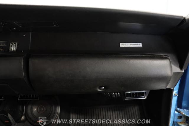 Riding on a factory-style suspension that has been modified with subframe connectors and upgraded front and rear sway bars, this 1968 Plymouth Road Runner also benefits from power disc brakes at all four corners. If you\'ve been on the hunt for a truly head-turning legend that commands both admiration and alarm from Mustang and Camaro owners everywhere, then this first-year Road Runner is the one you\'ve been waiting for. Don\'t wait, because just like its namesake, it will be gone in a cloud of dust before you know it Beep Beep! Call today! Be sure to ask about our services offered; Financing, Vehicle Protection Plan, Insurance, and Transportation to your driveway!