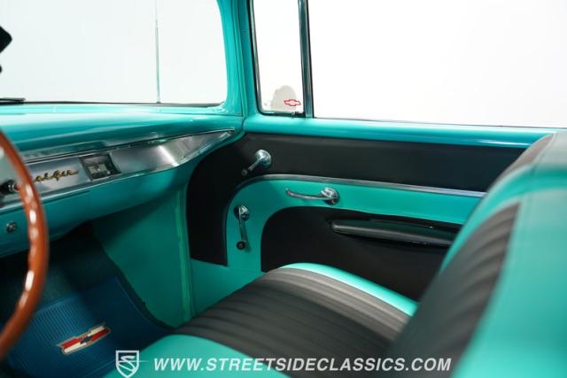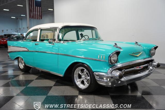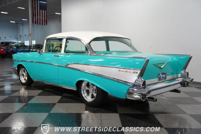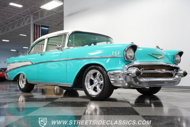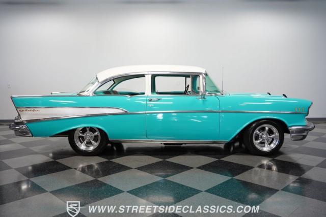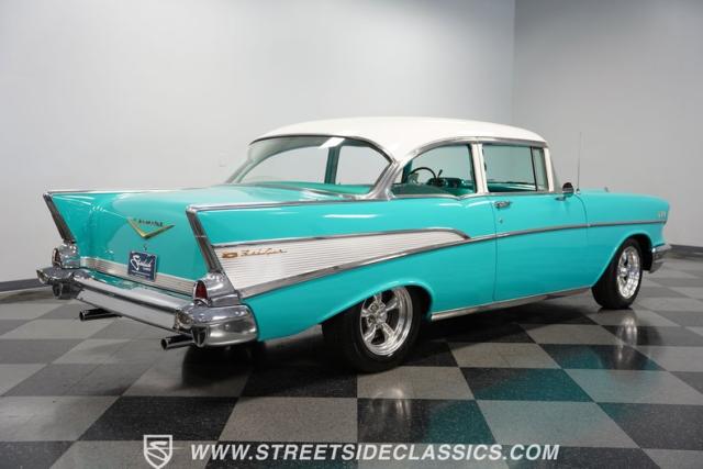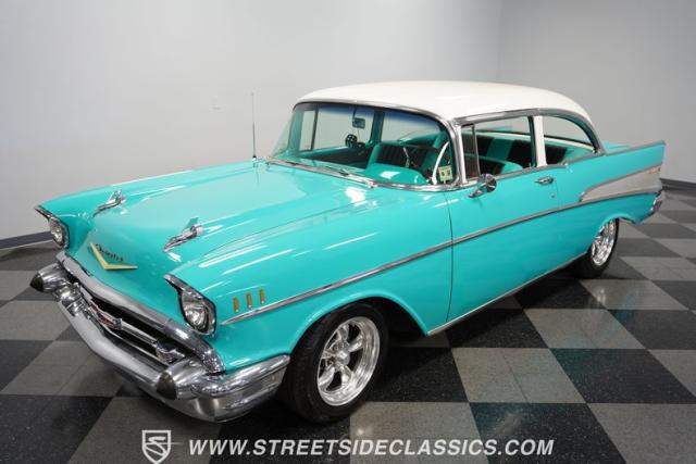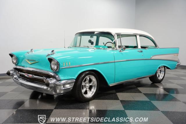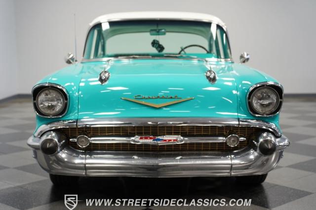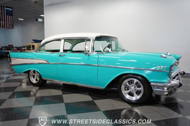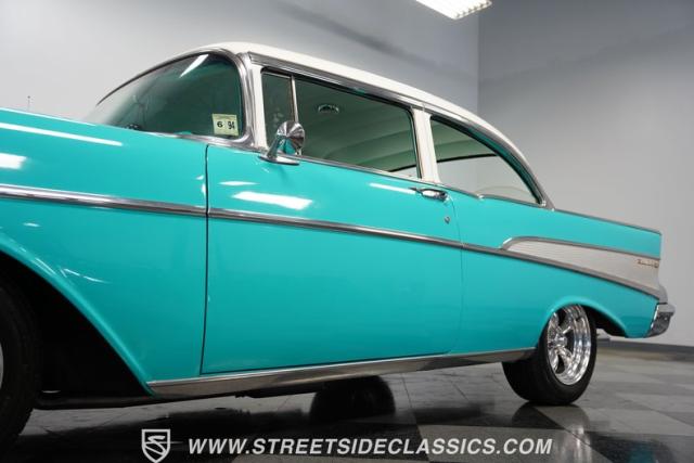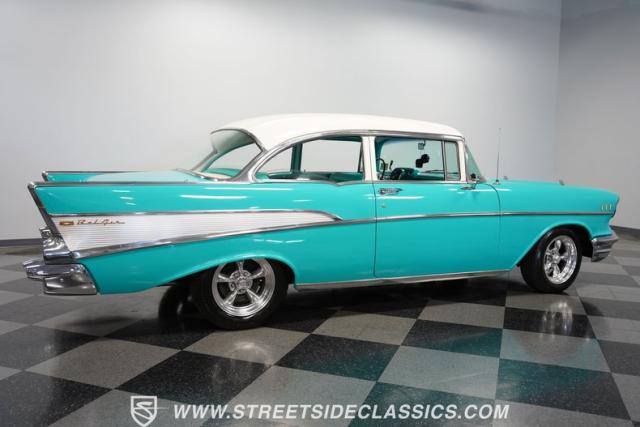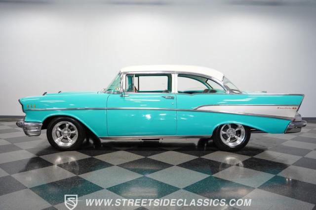 This 1957 Chevrolet Bel Air is among the most recognizable American automobiles of all time, an icon of its age. In the final year of the model\'s third generation, it offered an intoxicating blend of style, performance, and features with its freshly designed front end and tastefully executed tailfins. Finished in the eye-catching colors of Tropical Turquoise and India White, this clean classic Tri-Five Chevy is stunning. The factory-style accessory ribbed aluminum trunk molding adds to the nostalgic look of this super-clean Bel Air. The car is slightly lowered with proper lowering springs, which complements the 16-inch polished American Racing Torque Thrust wheels wrapped with BF Goodrich Advantage tires staggered 20560R16 front and 225/60R16 rear for just the proper stance.