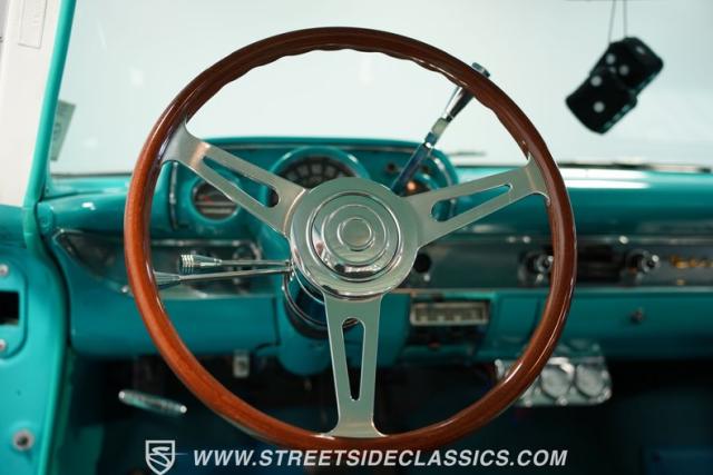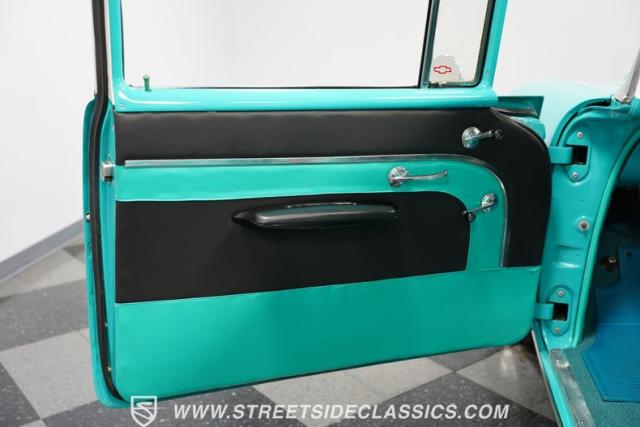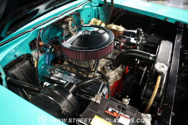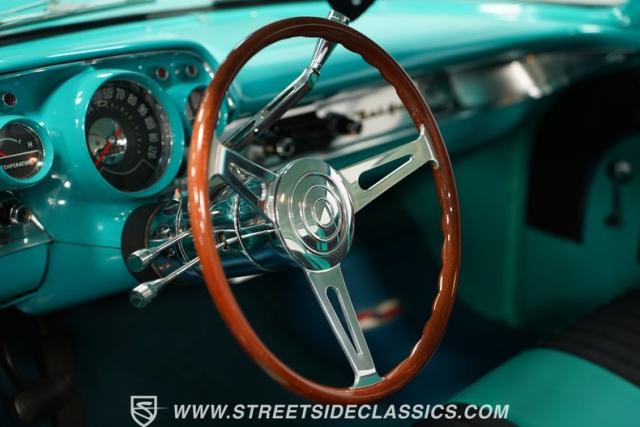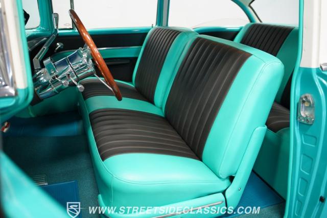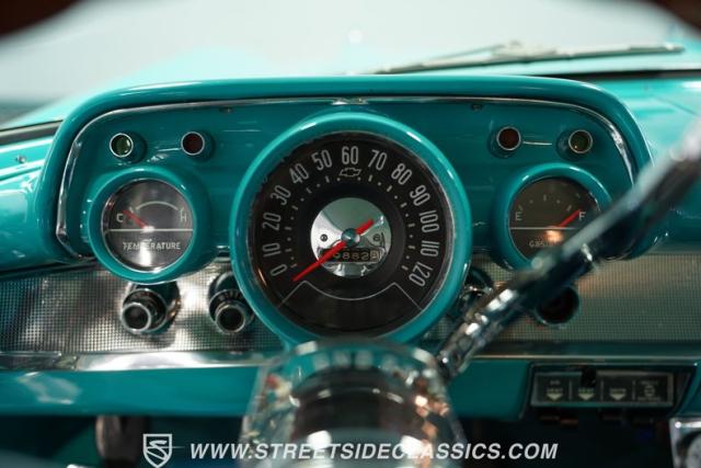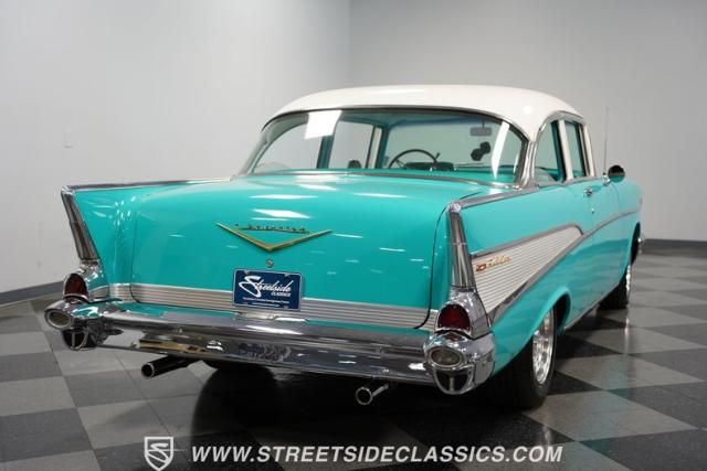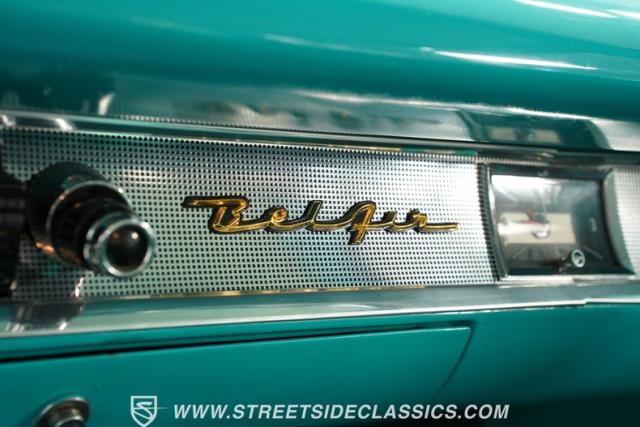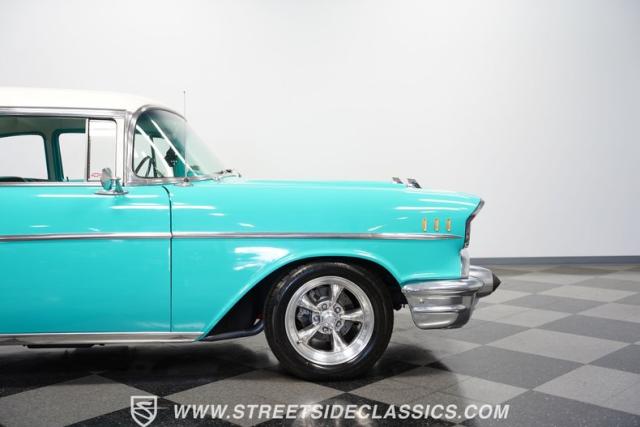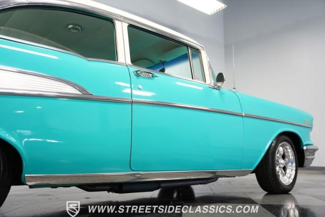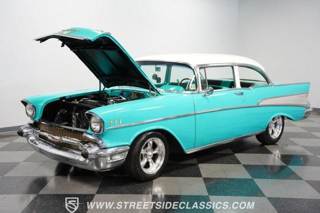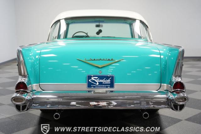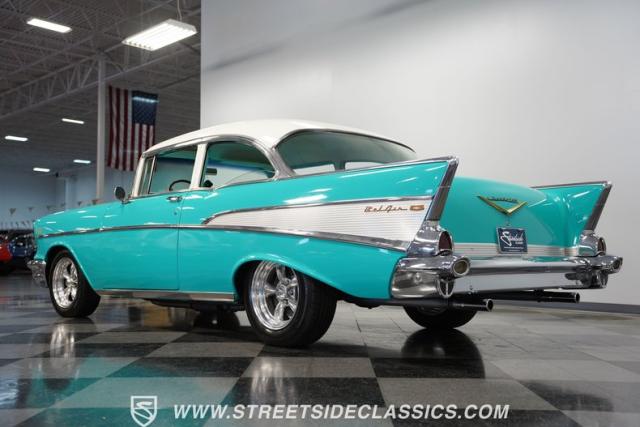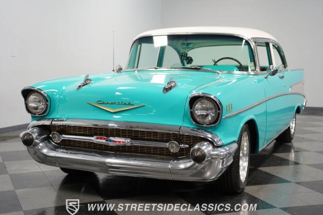 This 1957 Chevrolet Bel Air is among the most recognizable American automobiles of all time, an icon of its age. In the final year of the model\'s third generation, it offered an intoxicating blend of style, performance, and features with its freshly designed front end and tastefully executed tailfins. Finished in the eye-catching colors of Tropical Turquoise and India White, this clean classic Tri-Five Chevy is stunning. The factory-style accessory ribbed aluminum trunk molding adds to the nostalgic look of this super-clean Bel Air. The car is slightly lowered with proper lowering springs, which complements the 16-inch polished American Racing Torque Thrust wheels wrapped with BF Goodrich Advantage tires staggered 20560R16 front and 225/60R16 rear for just the proper stance.