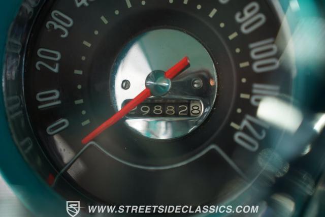 The interior is beautifully custom-trimmed in turquoise and black vinyl with a Tropical Turquoise painted dash that matches the exterior. Desirable features include a chrome tilt steering column, a custom three-spoke wood-rimmed wheel, and a JVC cassette AM/FM radio. Three under-dash mounted gauges also monitor engine oil pressure, water temperature, and voltage.