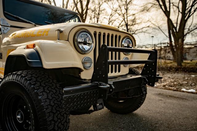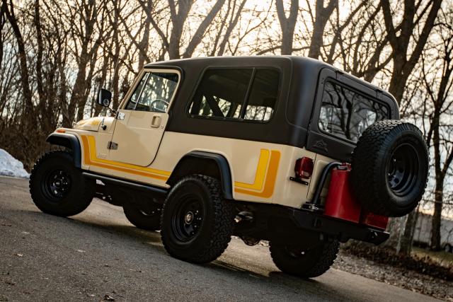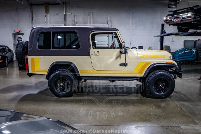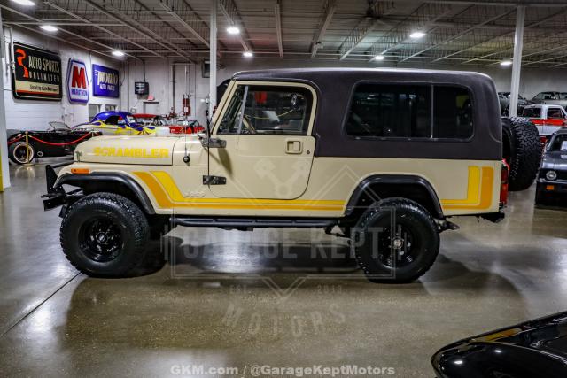 1982 Jeep CJ8 Scrambler- California 4x4- Sold New at County Wide Chrysler of Garden Grove, CA- Jamaican Beige Exterior with Scrambler Graphics over Nutmeg Denim Interior Upholstery- 350ci V8 with Fuel-injected TBI System- California BAR-Certified Engine Conversion (full emissions compliant)- 5-Speed NV4500 Manual Transmission- Bushard Clutch and Dana Axles- Full-Float Rear End with ARB Rear Air Locker- Onboard ARB air compressor- Magnaflow Exhaust and Lifted Suspension- Conn-Ferr Springs and Shackles with Rancho shocks- Baja Rockcrawler Wheels- 32x11.50x15 BFGoodrich All-Terrain Rires- Super-rare Full-size Hardtop- Factory Roll Bar and RCT Front and Rear Bumpers- Swing-Away Rear Tire Carrier with Full Size Matching Spare- Dual Rear-Mounted Jerry Cans- Full Stainless Hardware Package (hinges, latches, etc.)- Upgraded LED Headlight Kit- Bestop Low-Back Seats- Tilt Steering Wheel and Full Gauge Package- In-Dash Tachometer and Billet Dash Knobs- Kenwood CD Player with Bluetooth- Convenience Group- Original Bill of Sale, Window Sticker, and Promotional Brochures- 686 Miles Recorded Since Restored This 1982 Jeep CJ8 Scrambler represents a rare and exceptionally well-executed example of Jeep\'s long-wheelbase classic, combining California provenance, period-correct style, and thoughtfully engineered upgrades. Sold new at County Wide Chrysler of Garden Grove, California, this lifelong 4x4 benefits from a dry-climate history and remains accompanied by its original bill of sale, window sticker, and promotional brochures, documentation seldom seen with Scramblers today. Showing just 686 miles recorded since its restoration, this CJ8 presents as a collector-grade example that is equally capable on the road or trail.Finished in striking Jamaican Beige with factory-style Scrambler graphics, the exterior captures the unmistakable character that made the CJ8 iconic. A super-rare full-size hardtop adds both desirability and year-round usability, while factory roll bar, RCT front and rear bumpers, and a swing-away rear tire carrier with a full-size matching spare reinforce its rugged, purposeful stance. Dual rear-mounted jerry cans, upgraded LED headlight kit, Baja Rockcrawler wheels, and 32x11.50x15 BFGoodrich All-Terrain tires complete the look, blending classic Jeep aesthetics with modern functionality.Under the hood lies a powerful 350ci V8 equipped with a fuel-injected TBI system, delivering reliable performance with improved drivability. Importantly, this engine conversion is California BAR-certified, meaning it is fully emissions compliant, an extremely rare and valuable feature for a V8-swapped CJ in today\'s regulatory environment. Power is routed through a stout 5-speed NV4500 manual transmission, paired with a Bushard clutch and durable Dana axles, making this Scrambler as robust as it is enjoyable to drive.The drivetrain is further enhanced by a full-float rear end with an ARB rear air locker, offering exceptional traction when conditions demand it. An onboard ARB air compressor allows for quick locker engagement and tire adjustments on the fly. A lifted suspension featuring Conn-Ferr springs and shackles, combined with Rancho shocks, provides confident off-road capability while maintaining stable road manners. A Magnaflow exhaust adds a refined yet authoritative V8 tone befitting this classic Jeep.Inside, the cabin blends classic CJ simplicity with tasteful upgrades. Nutmeg denim upholstery is complemented by Bestop low-back seats, a tilt steering wheel, and a full gauge package with an in-dash tachometer and billet dash knobs. A Kenwood CD player with Bluetooth adds modern convenience, while the factory Convenience Group enhances everyday usability without detracting from the Scrambler\'s authentic feel.Finished with a full stainless hardware package throughoutcovering hinges, latches, and exterior details, this CJ8 Scrambler stands out for both its attention to detail and its rarity. With low post-restoration mileage, exceptional documentation, and a carefully engineered, emissions-compliant V8 conversion, this 1982 Jeep CJ8 Scrambler is a standout example that appeals equally to collectors, enthusiasts, and those seeking one of the most versatile and desirable classic Jeeps ever produced.