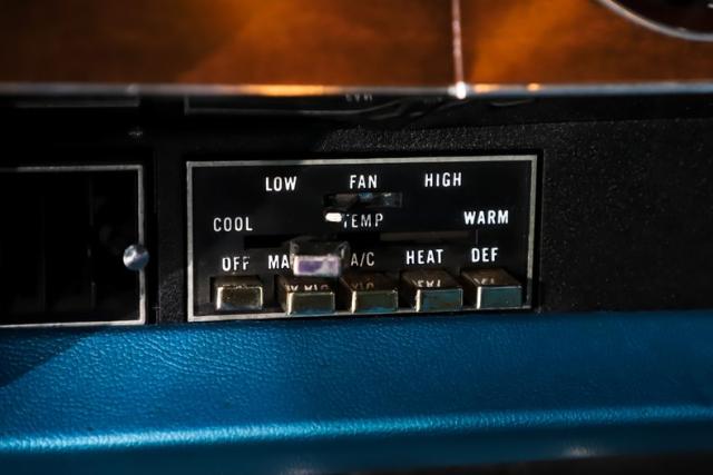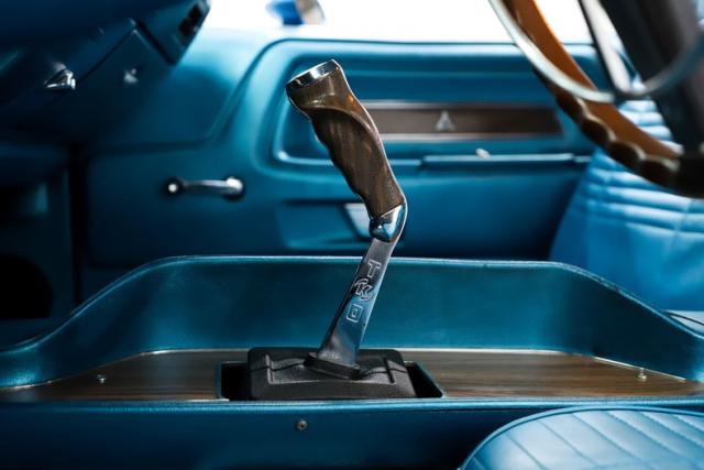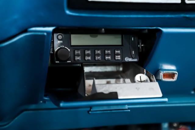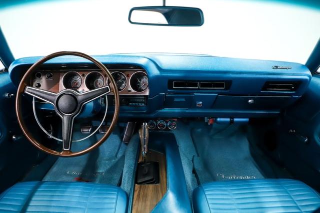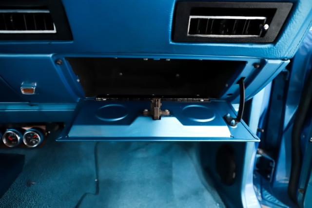 INTERIOR: Beautiful matching bright blue interior. The center console is home to a 5-speed Pistol Grip shifter. Down on the floor is bright blue carpet with matching embroidered floor mats. The seats are reupholstered. All the plastic trim is in excellent shape, a small amount of blue dye is flaked off in places. The dash pad is mint, has the rally instrument panel with the wood grain and full set of instrumentation. A nice looking wood grain steering wheel too. Below the dash is fire extinguisher and aftermarket gauge cluster. Above is a new headliner and visors. There\'s a secret stereo in the ashtray with kick panel speakers 6x9s in back. Complete set of blue seatbelts.