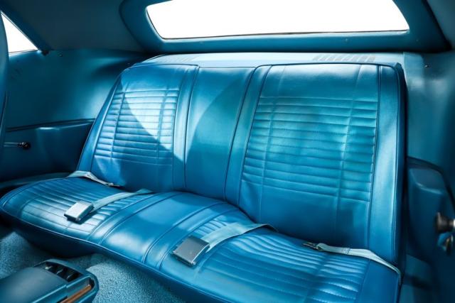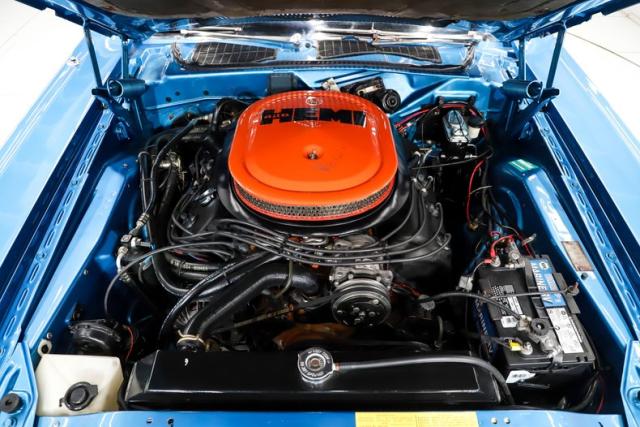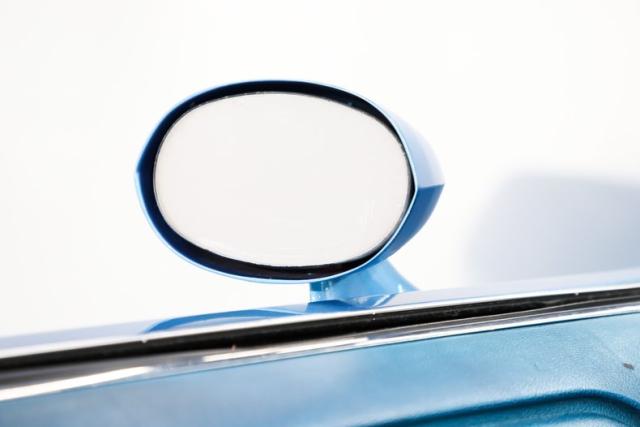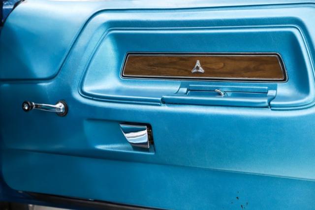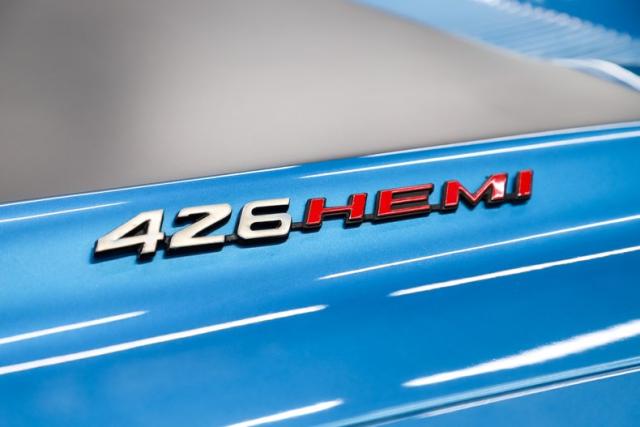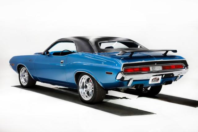 EXTERIOR: They started with a clean California car that has all original body, fenders, doors and trunk. Upgraded with R/T hood and SE smaller rear window. It was stripped to a bare metal shell and put on a rotisserie where every inch was made straight, we have pictures. It was completely painted in the gorgeous B-5 Blue. It has a smooth gloss finish. It also has painted racing mirrors, black hood stripe and a rear spoiler. New vinyl top, weatherstrips, windshield and chrome. I love the stance sitting on some highly polished wheels. It has 17 in Billet Specialties wheels in front, 18s in back and they are wrapped in Firehawk tires.