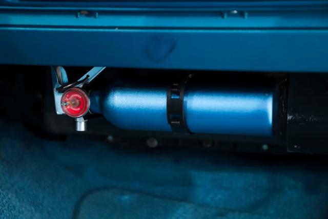 UNDERSIDE: It was flipped on a rotisserie; the underbody is pristine metal painted gloss blue. Every component was replaced with new rebuilt or upgraded parts. PST performance front end rebuild, H.D. torsion bars. Welded in frame rails tie the front to the back. Air shocks and Cal Tracks traction bars in back. Drilled and slotted disc brakes at all four wheels, custom e-brake assembly. Custom fat exhaust with x-pipe, polished Magnaflow mufflers and correct square tips. The fuel system was completely replaced. Bottom of the motor is clean. New Tremec 5-speed with a Ram hydraulic clutch. H.D. Dana 60 with 4.10 Sure Grip gears and aluminum cover.