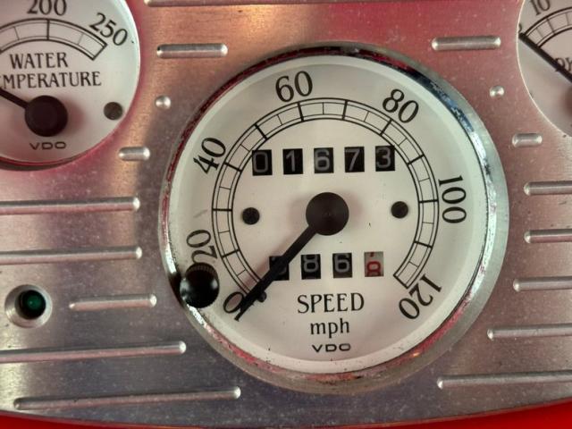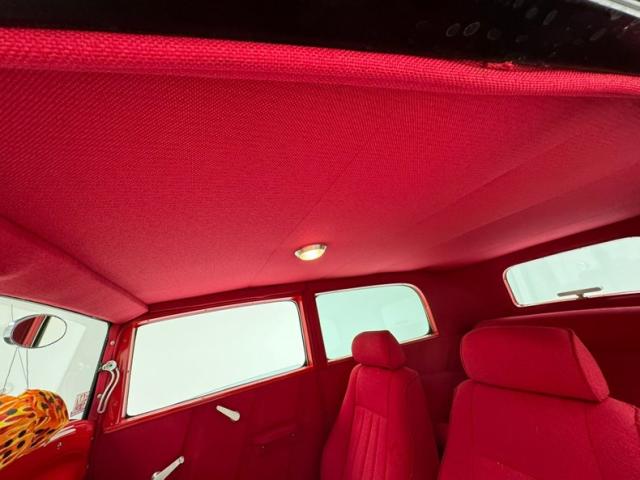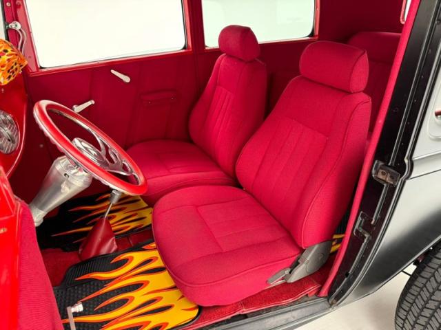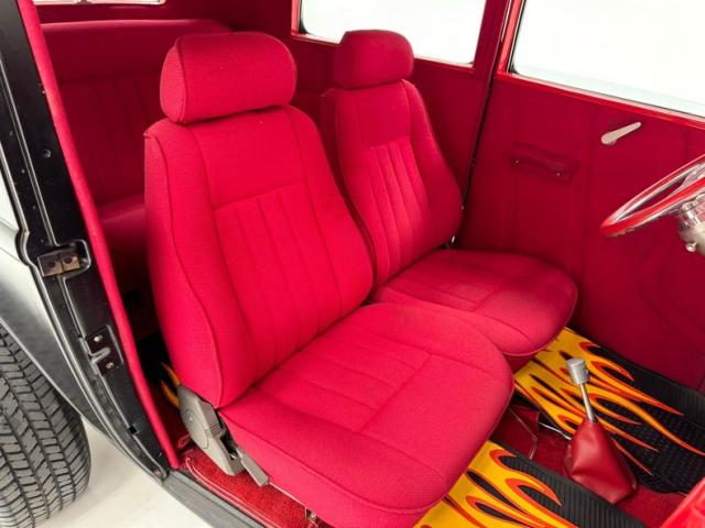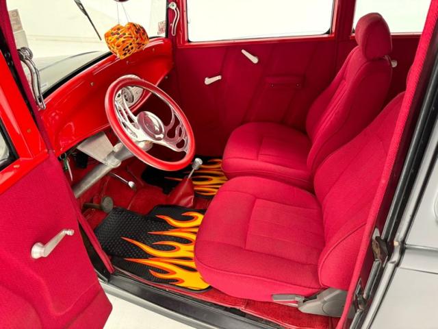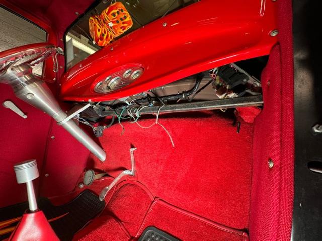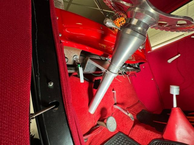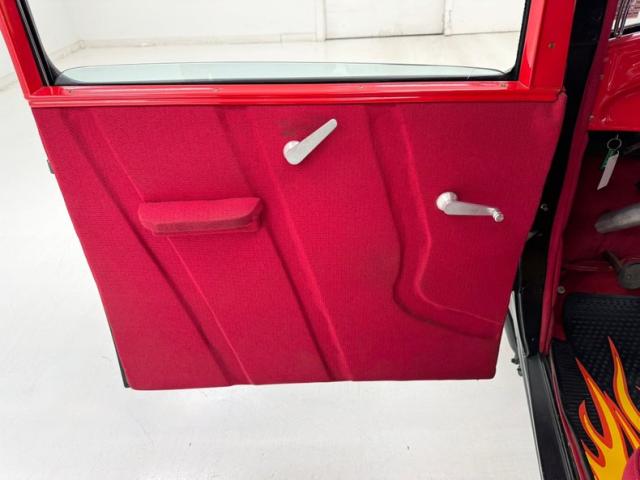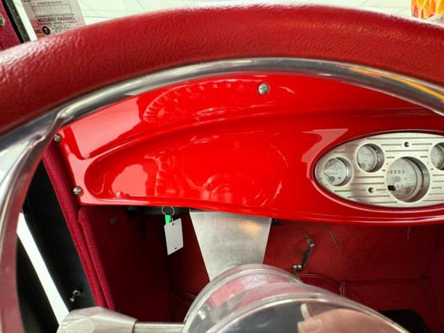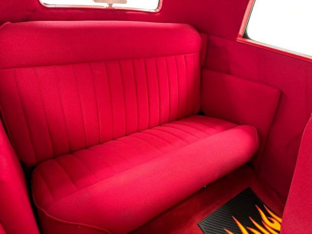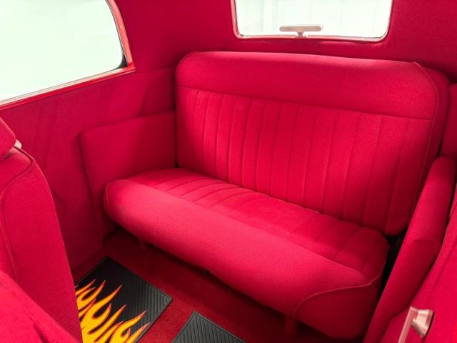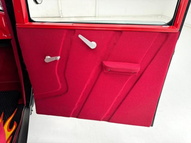 Flame on! for the interior where door panels are molded to a custom design, then covered in a deep red canvas like broadcloth. Some billet cranks and actuators are in the red field. I stepped over flaming floor mats and sat upon high back buckets covered in more of the deep red canvas broadcloth. A nice red \"couch\" if you will is in the backend has side armrests built into it. All vertical surfaces and the headliner are also in the red canvas broadcloth. Hanging from the mirror are flaming dice and these hover over a curved original Henry design steel dash. It has a nicely deep inset aluminum panel that houses the VDO classic looking white faced gauges. Fronting the dash on top of a the column is a flaming billet red rimmed rally steering wheel with Ford oval in its center. A small billet style shifter is in a field of red carpeting on the floors and it has a red leather boot.