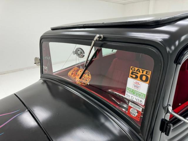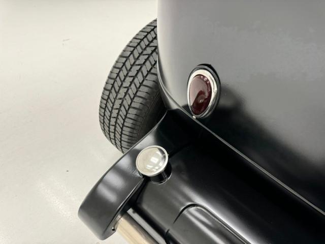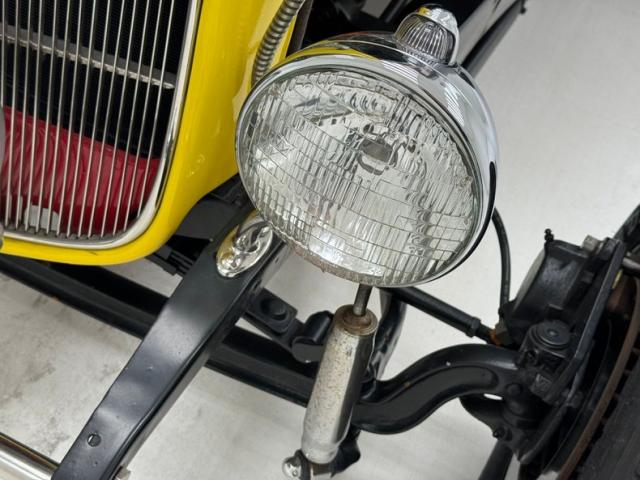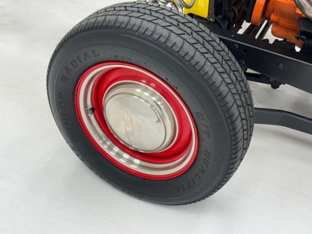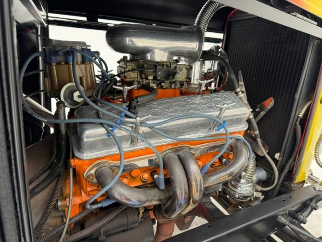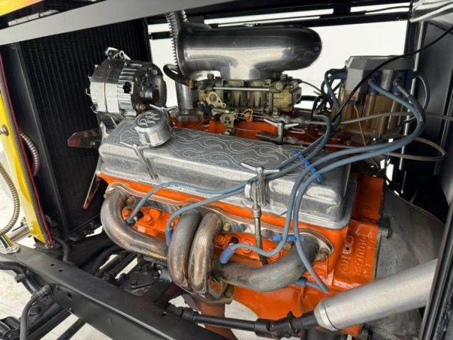 This nice solid all Henry factory steel car has smooth body panels and well minded gaps to make it a really nice rod. With a stainless horizontal mounted tank in front of the vertical ribbed grille and chromed headlight casings on either side, dropped front suspension all exposed it is looking lighter in weight to obviously go faster and play the hot rod part. Yellow to orange flames are lit up on the radiator cowl and hood and as they go to the windshield fade into a beautiful satin black. The passenger tub and rear of the car is all bathed in the satin black, and is rust free. A few small cracks are seen in this paint but they are sporadic. On back fenderless sides and a rear tank with just a small chromed bar for the bumper we see teardrop tail lights and a third brake light in the rear glass. Wheels are 14-inch front and 15-inch rear red painted steel with nice shiny trim rings in their edges and F O R D badged moons caps in the centers.