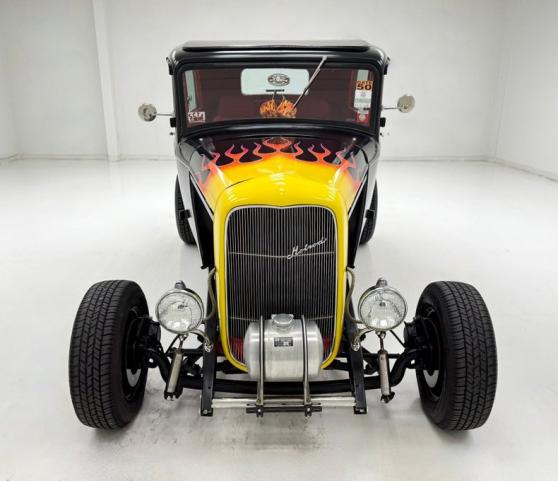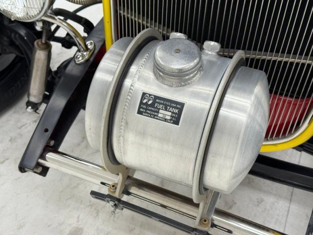 For consignment, a \"Deuce\" hot rod. It has been modified a bit with a shaved hood ornament, stainless steel tank in front of the grille, no side cowls and fenders along with some hot flames licking rearward from the grille. Salt flats here we come.
