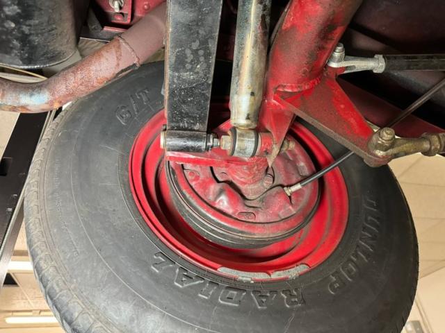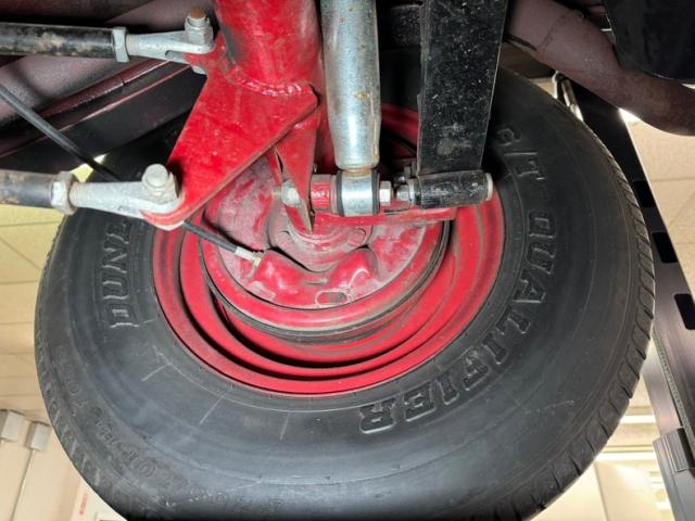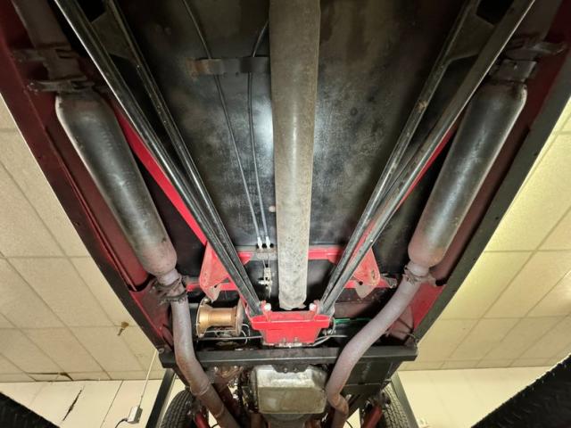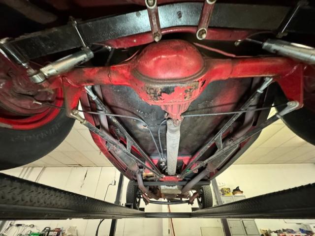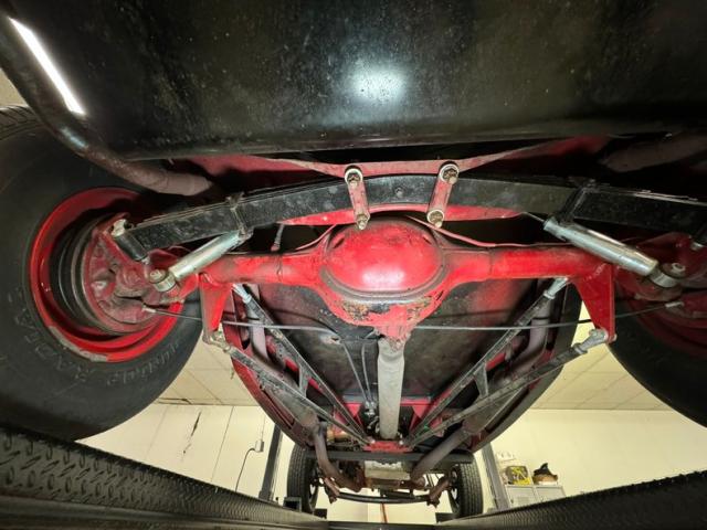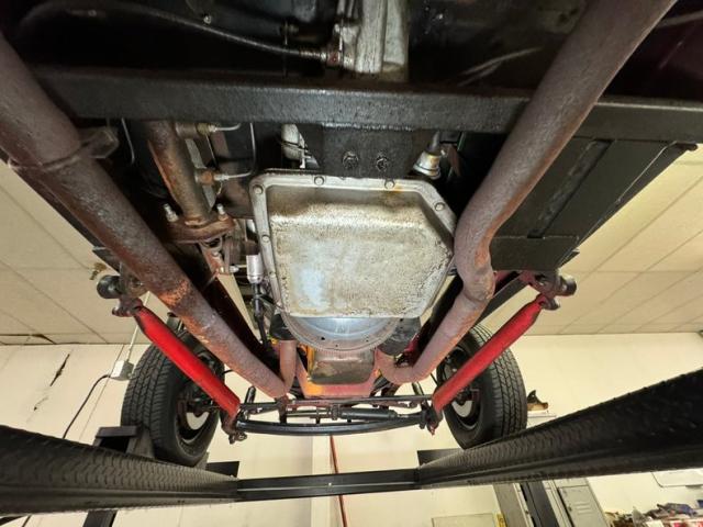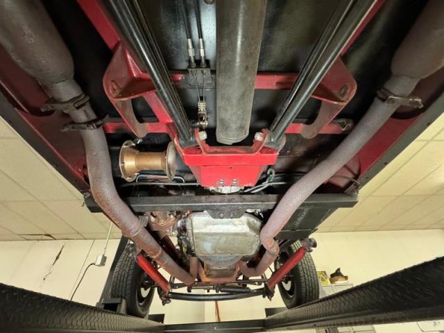 Underneath is solid steel floor pans and framing which has slight areas of surface rust and road dirt. Since this car was built in the 90\'s it has some aging but overall remains nicely reserved. Glasspack style mufflers are on, and transverse front leaf springs with wishbones are there for the ride. In back, a 4 bar with transverse leaf springs keep the tires glued to the pavement. Disc brakes are in front and drums for the back.