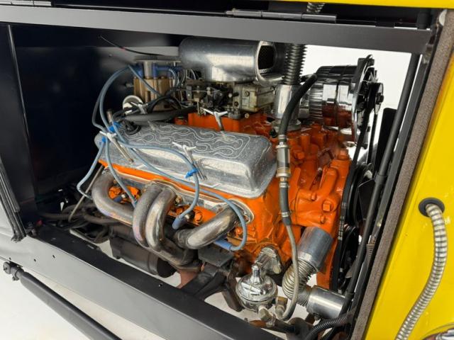 Under the open side cowled hood is a 350ci V8 with an orange block and some flame engraved valve coverings. For some added bling we see a cast scoop on top and it is covering a Holley 4-barrel carburetor. Also, a chromed alternator is in this playing field as are shiny headers and ribbed stainless hoses throughout. On the back is a Ford 9 inch 3.50 Equalock rear axle and pumpkin. All HOT and ready to roll.