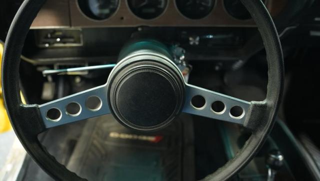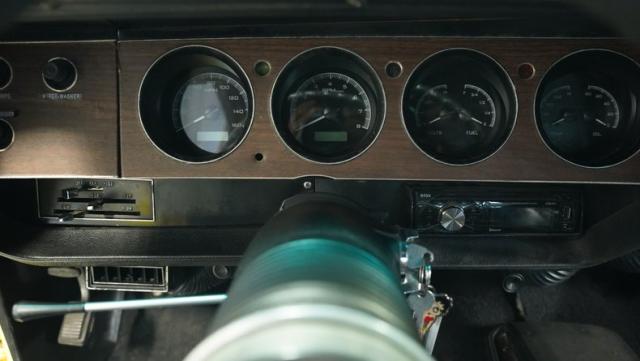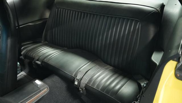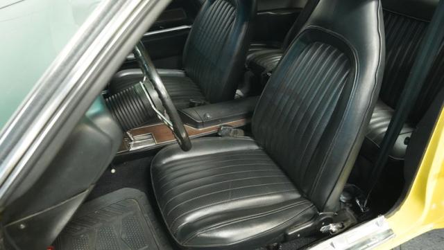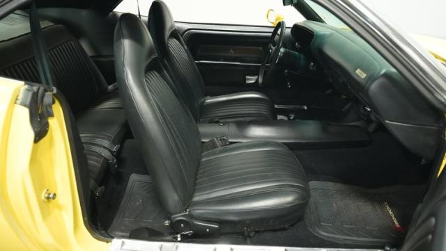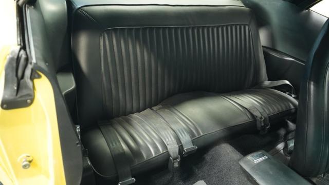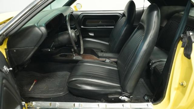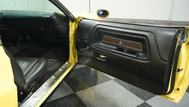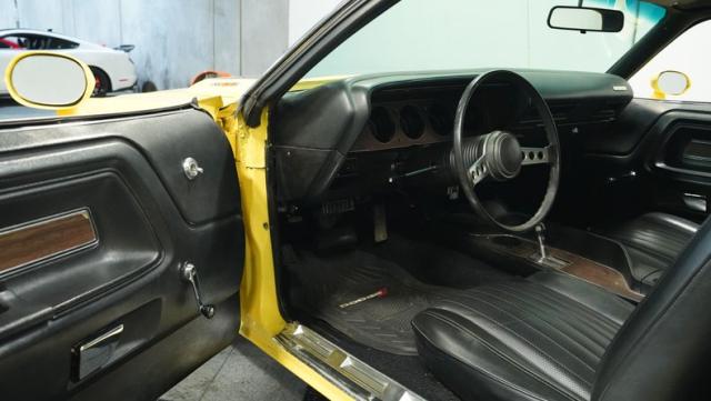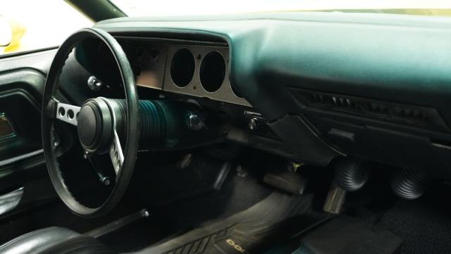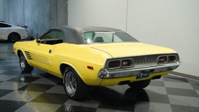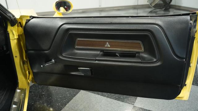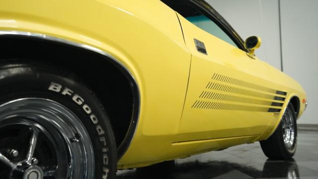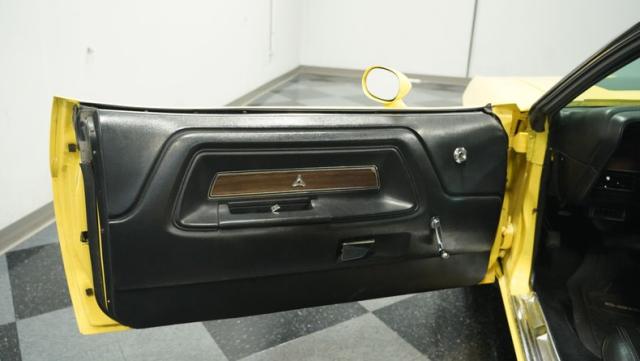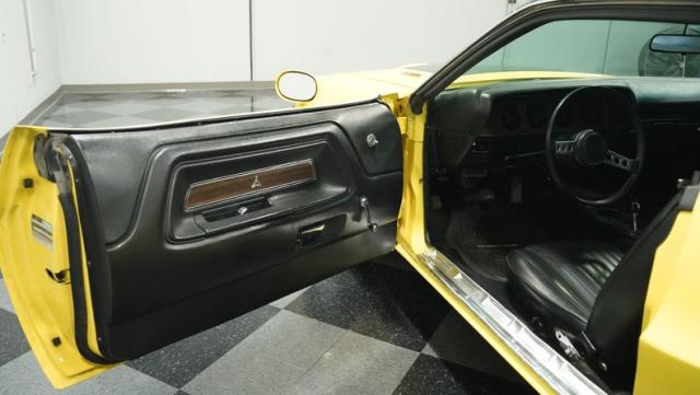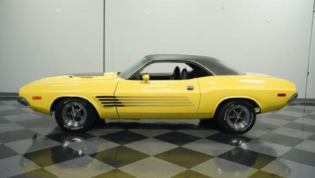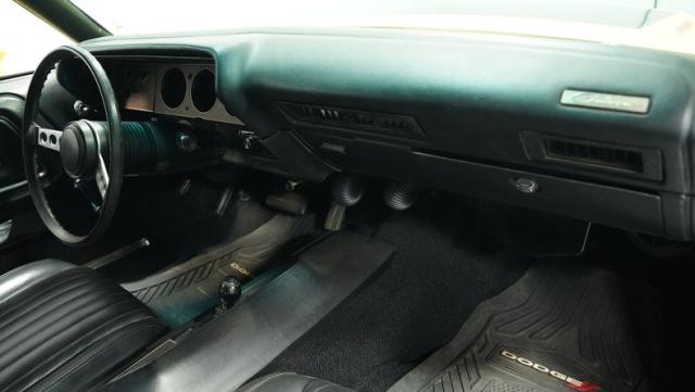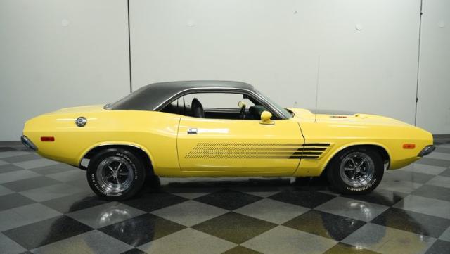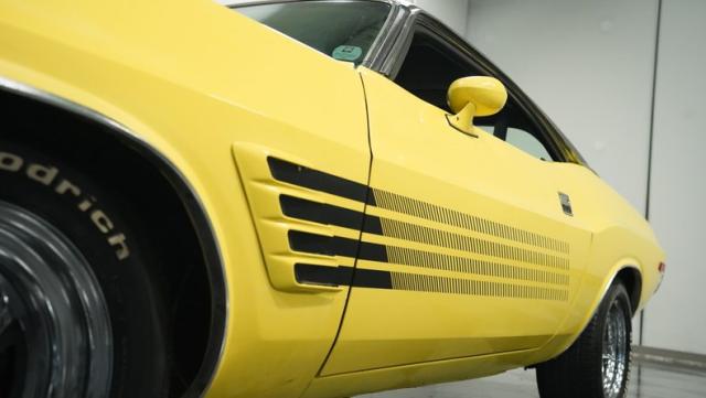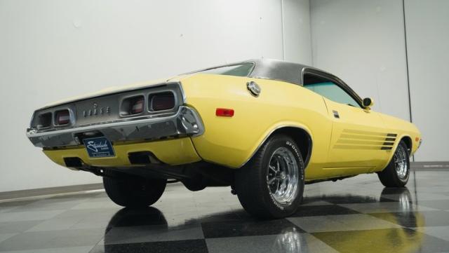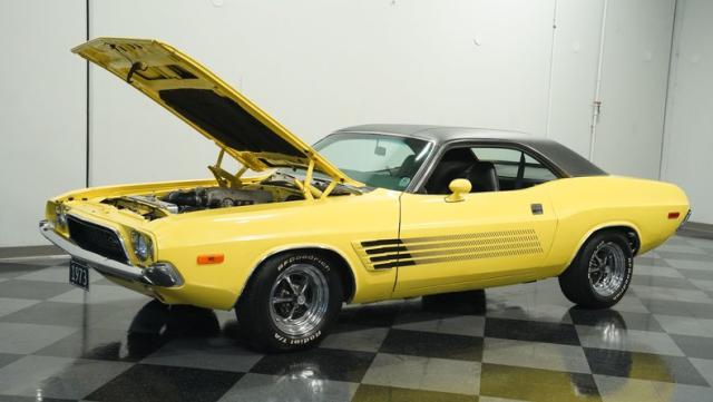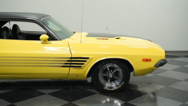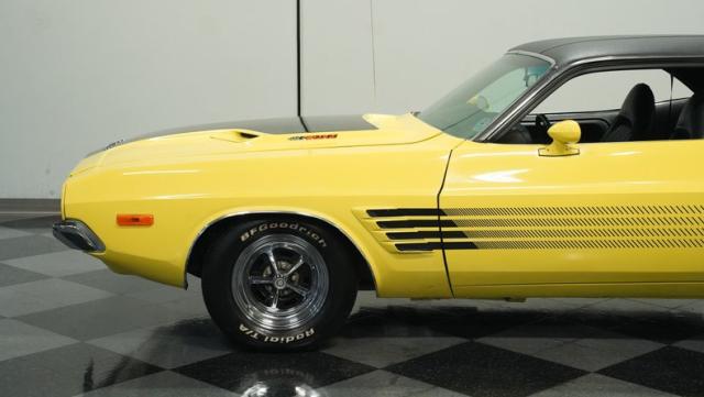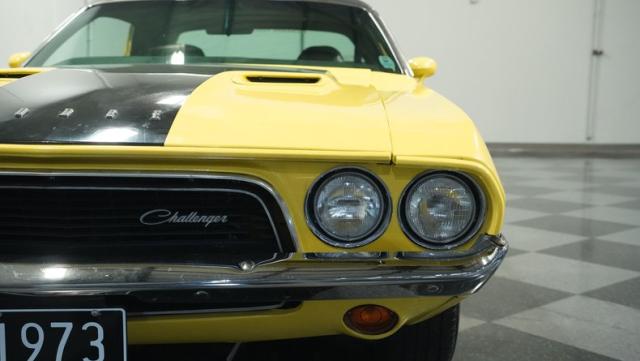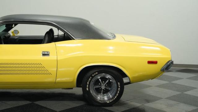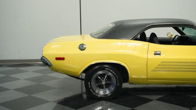 Originally a green 318 V8 car, this 1973 Dodge Challenger now sports a vibrant Top Banana yellow finish. Black stripes accentuate the sides, while a painted hood stripe and black vinyl roof complete the look. The aggressive profile is enhanced by 15-inch wheels fitted with 215/70R15 tires. Slick visual appeal throughout, while dual exhaust with Pypes mufflers contributes to the muscular appearance. This Challenger\'s exterior exemplifies classic American performance, reimagined for today\'s enthusiasts.
