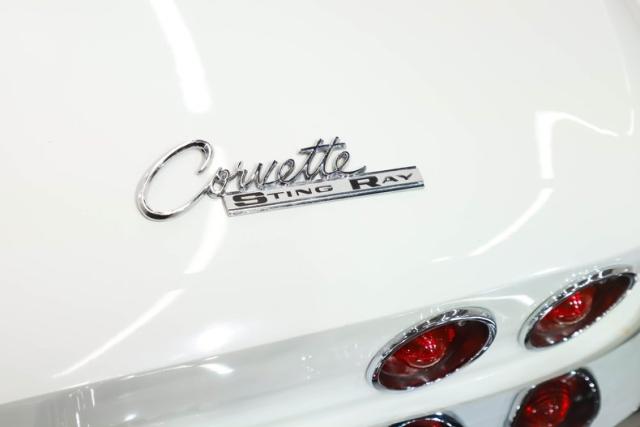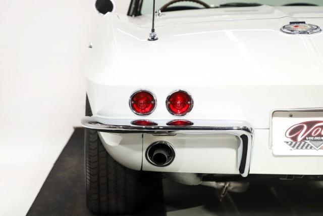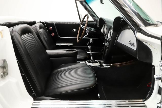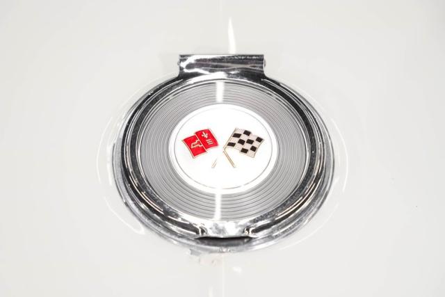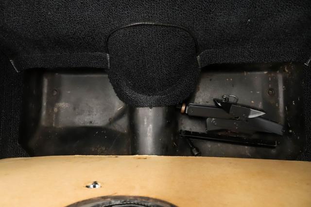 UNDERSIDE: This is the second year for the independent suspension front and back. Under this car appears to be very clean and proper. The steering and suspension has been well maintained, several components look fresh. We just installed a new reproduction exhaust system with the polished tips going out through the valance. The brakes were rebuilt by the previous owner and are in great working condition, e-brake is hooked up. Looking up at the motor it is very fresh and has a correct starter and canister type oil filter. The correct Muncie 4-speed also looks fresh, it was rebuilt by the previous owner. In back is the original 3.36 posi dated properly to this car. The frame is solid and painted black, the fiberglass floors are clean too and it still has its spare tire carrier.
