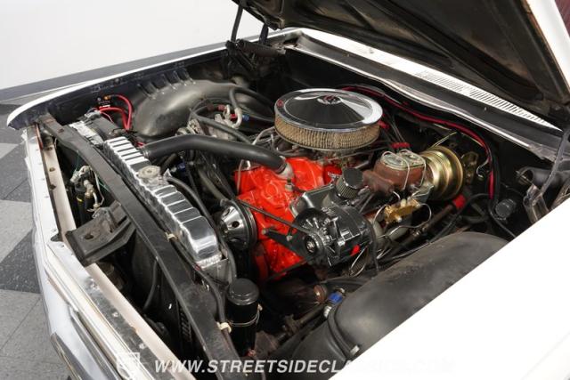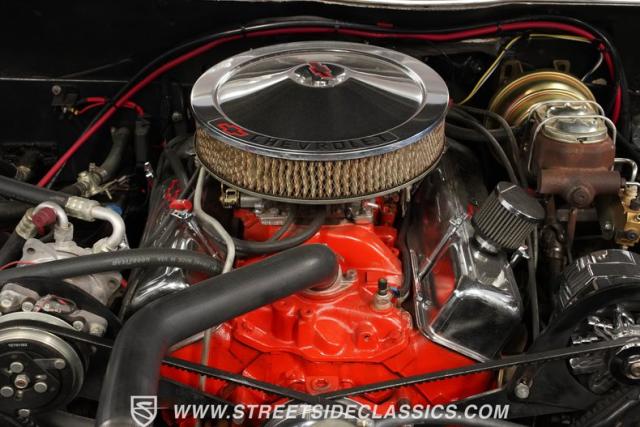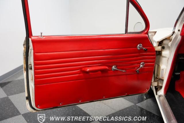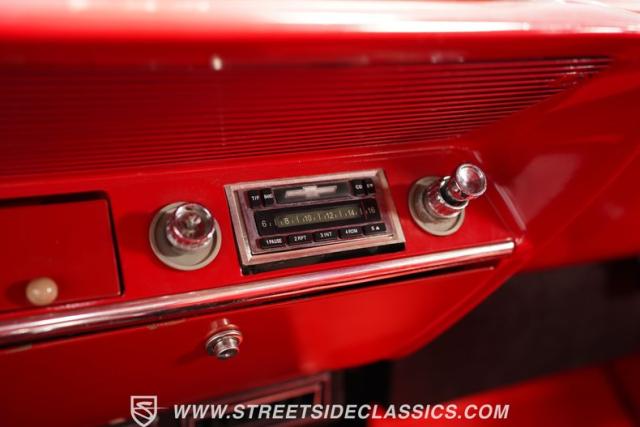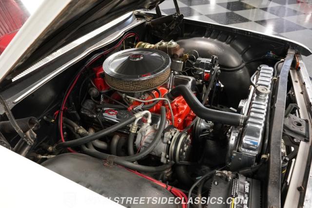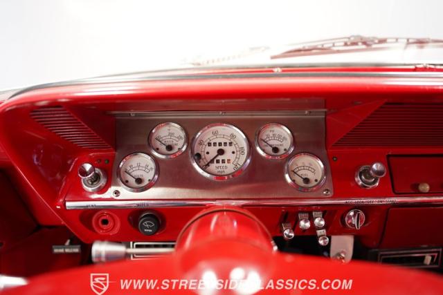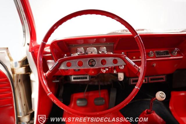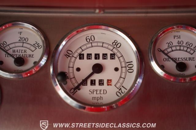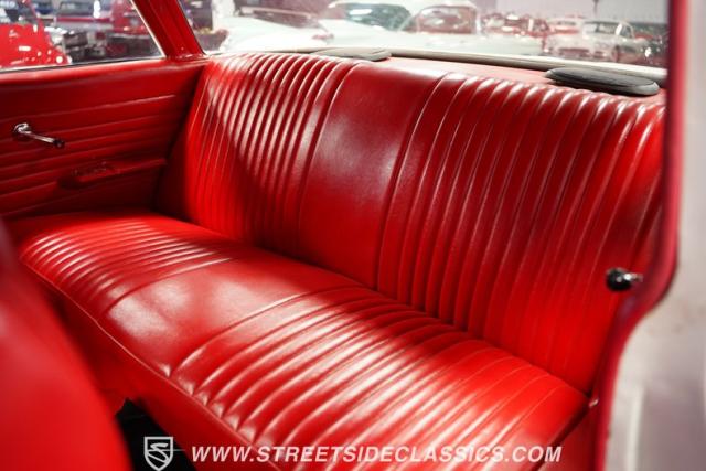 The red and white theme continues with custom bucket seats upholstered vinyl, featuring a touch of tuck-and-roll style for added character. Modern amenities like a retro radio, under-dash mounted AC, tilt steering, and a Hurst four-speed floor shifter blend seamlessly with the classic interior. The painted dash is adorned with a custom gauge bezel lined with VDO white-faced gauges, keeping you informed as you cruise down the road. And when you need some tunes, the aftermarket speakers in the rear deck are ready to provide the perfect soundtrack.