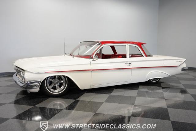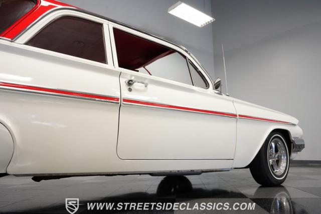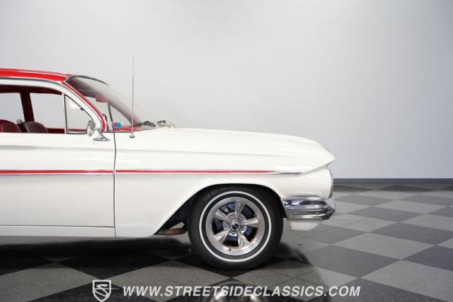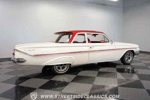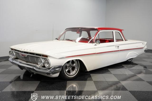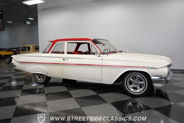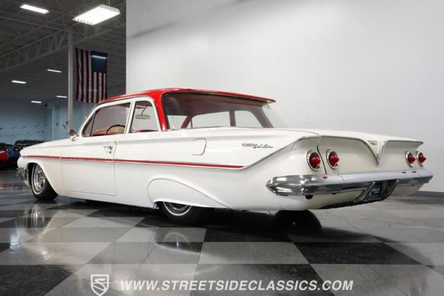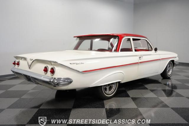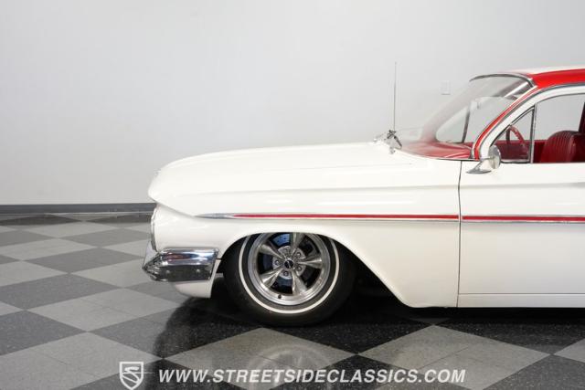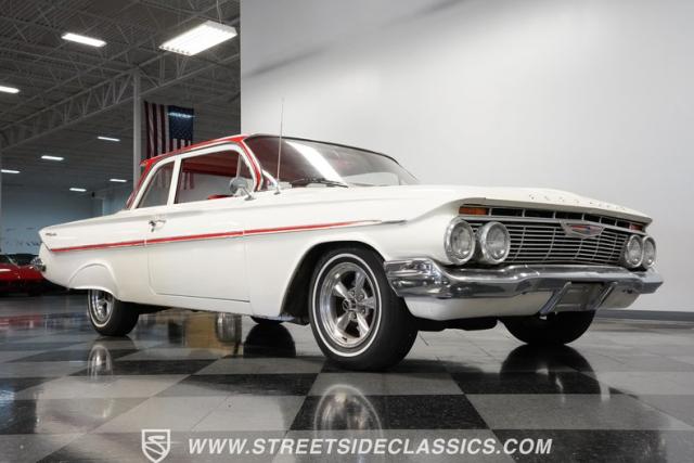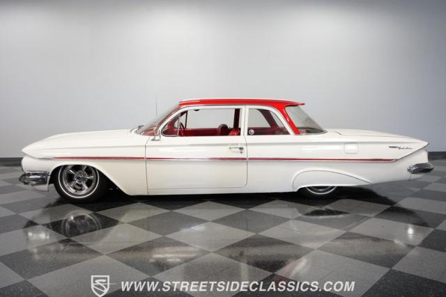 With a color scheme as bold as its personality, this 1961 Chevrolet Bel Air is a \'60s icon that\'s been given a new lease on life. The Ermine White body is accented by a metallic red roof accentuating the car\'s unique rear overhang - a design feature exclusive to the \'61 post coupe and sedan. Completing the look are red-painted stripes, adding a touch of flair to this classic ride. Rolling on chrome 5-spoke Ridler wheels wrapped in thin white wall 205/75R15 tires, this Bel Air has the stance of a true lowrider.