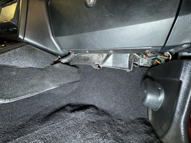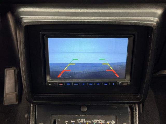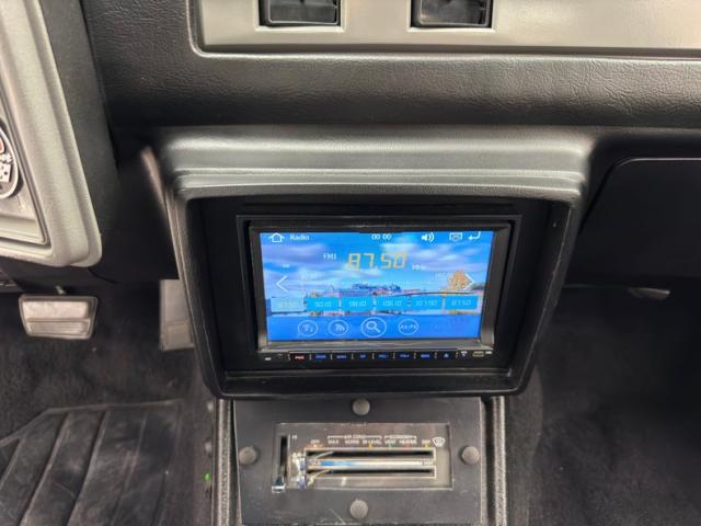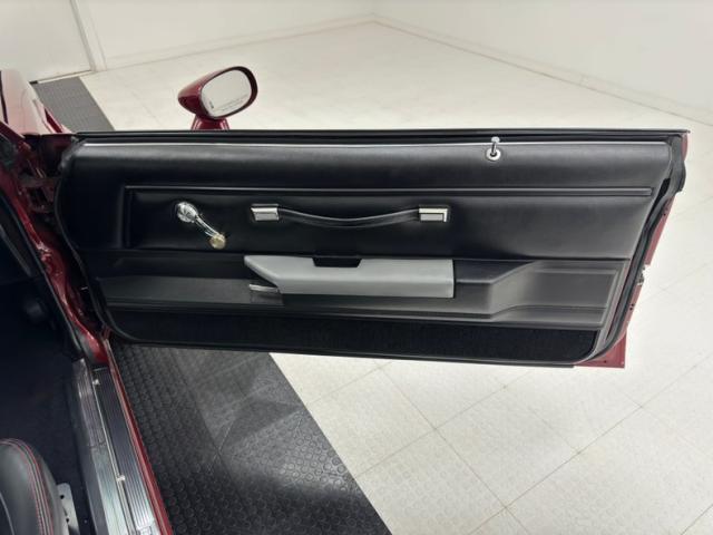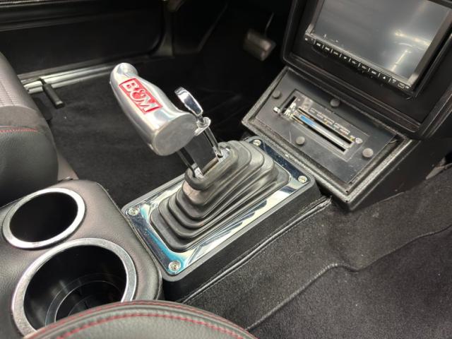 Standard GM door panels here with contrasting foam armrests and familiar molded plastics and vinyl. The newer TMI Sport-R bucket seats are better than anything from the factory in \'82. Black vinyl and suede with robust bolstering and support, red stitching, and tuck and roll inserts and they\'re in great shape, flanking a matching center console with storage and cup holders. Up front, a billet style steering wheel fronts a Dakota digital dash with blue read outs in a cluster that fits the space cleanly. In the center stack is an AM/FM/CD player with screen and back up camera over the A/C control panel fitted in the center just before the B&M shifter, all over low pile black carpet in good condition. A black headliner looms overhead and is in fine shape as well.